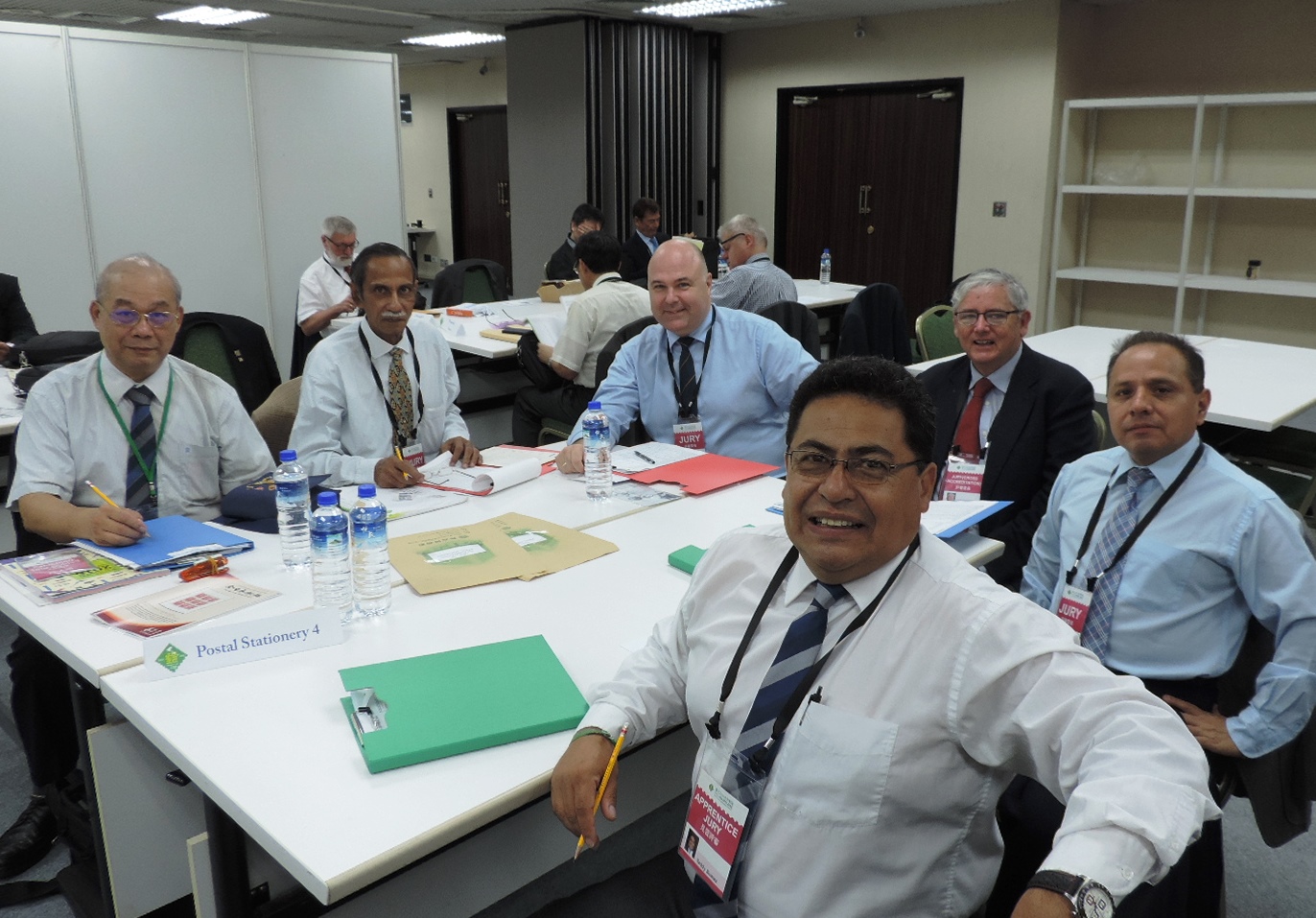 | El equipo del jurado que se encargará de juzgar enteros postales. Hacia la derecha, en primer plano, constan Teddy Suárez, del Ecuador, y Juan Reinoso, de Costa Rica |