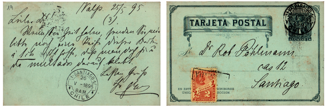 El tercer ejemplo (fig. 61) es una tarjeta local de Concepción de 1895 escrita completamente a mano con un texto personal, por lo que este es un uso completamente incorrecto como material impreso, y debió sin duda alguna considerarse como carta y multarse con 2 cts. adicionales por el centavo faltante. El cuarto ejemplo es una tarjeta enviada de Valparaíso a Santiago en 1895 (fig. 62), no cumplía con las normas para material impreso, se consideró como carta y se le aplicó correctamente una multa de 2 cts., doble del centavo faltante.