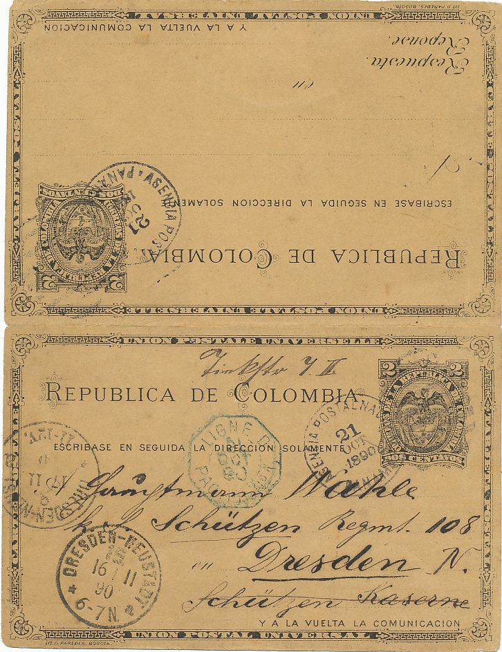 Tarjeta de “respuesta pagada” circulada a Dresde el 21 de octubre de 1.890.-