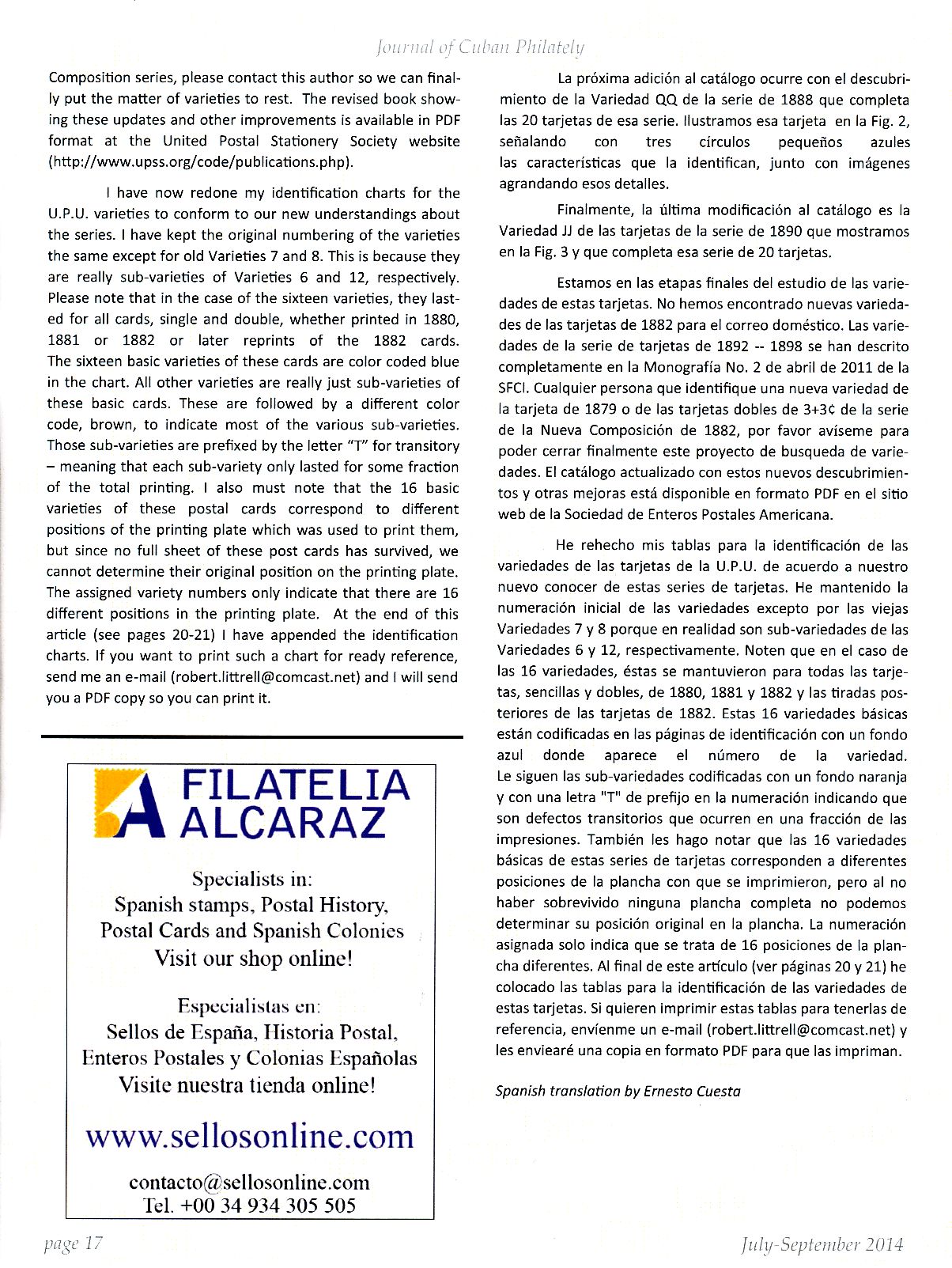 En el número 3 del volumen 5 de la Revista de Filatelia Cubana, (número que corresponde a los meses de Julio Septiembre del año 2.014) aparece este excelente trabajo de Robert Littrell, traducido al español por nuestro buen amigo Ernesto Cuesta.-