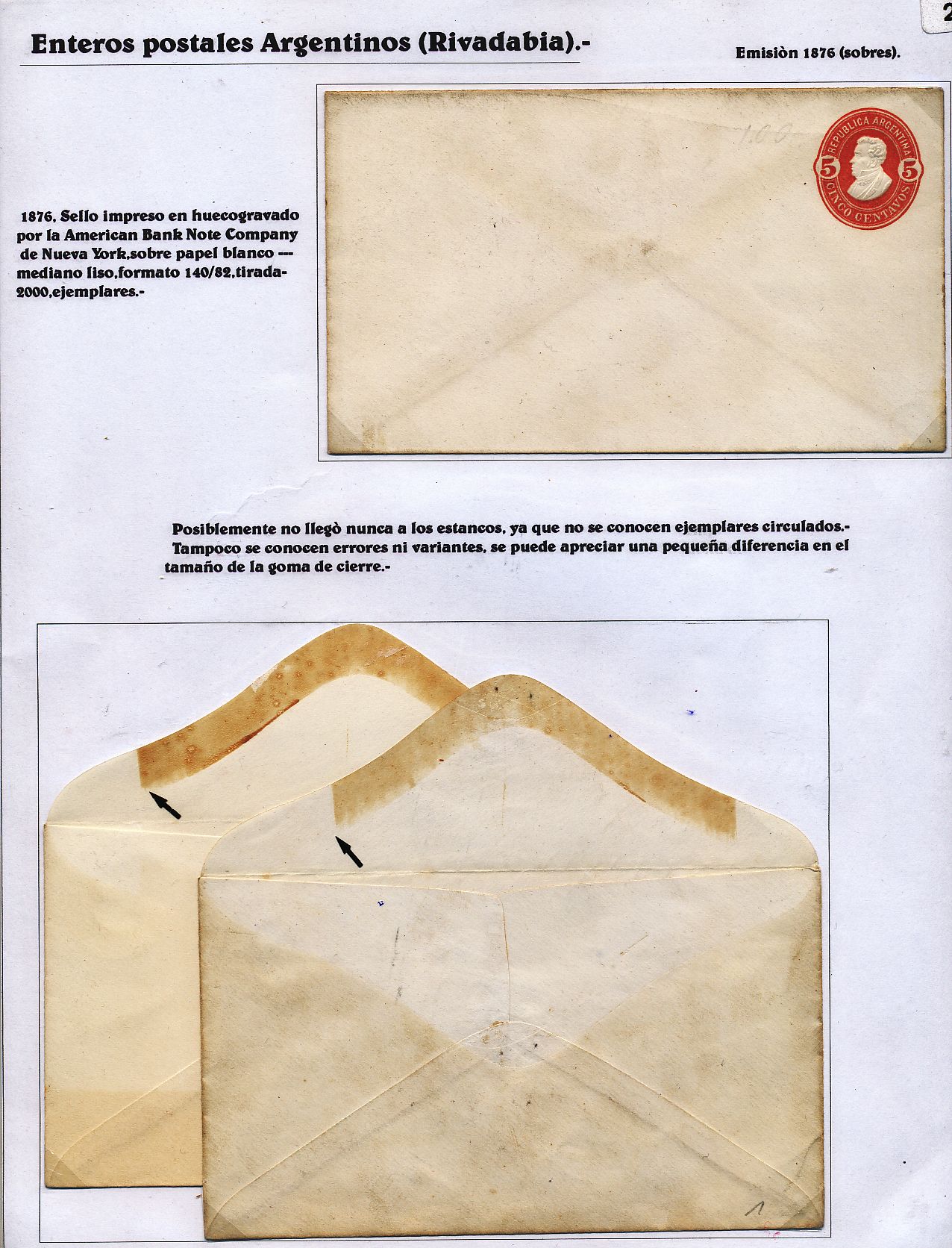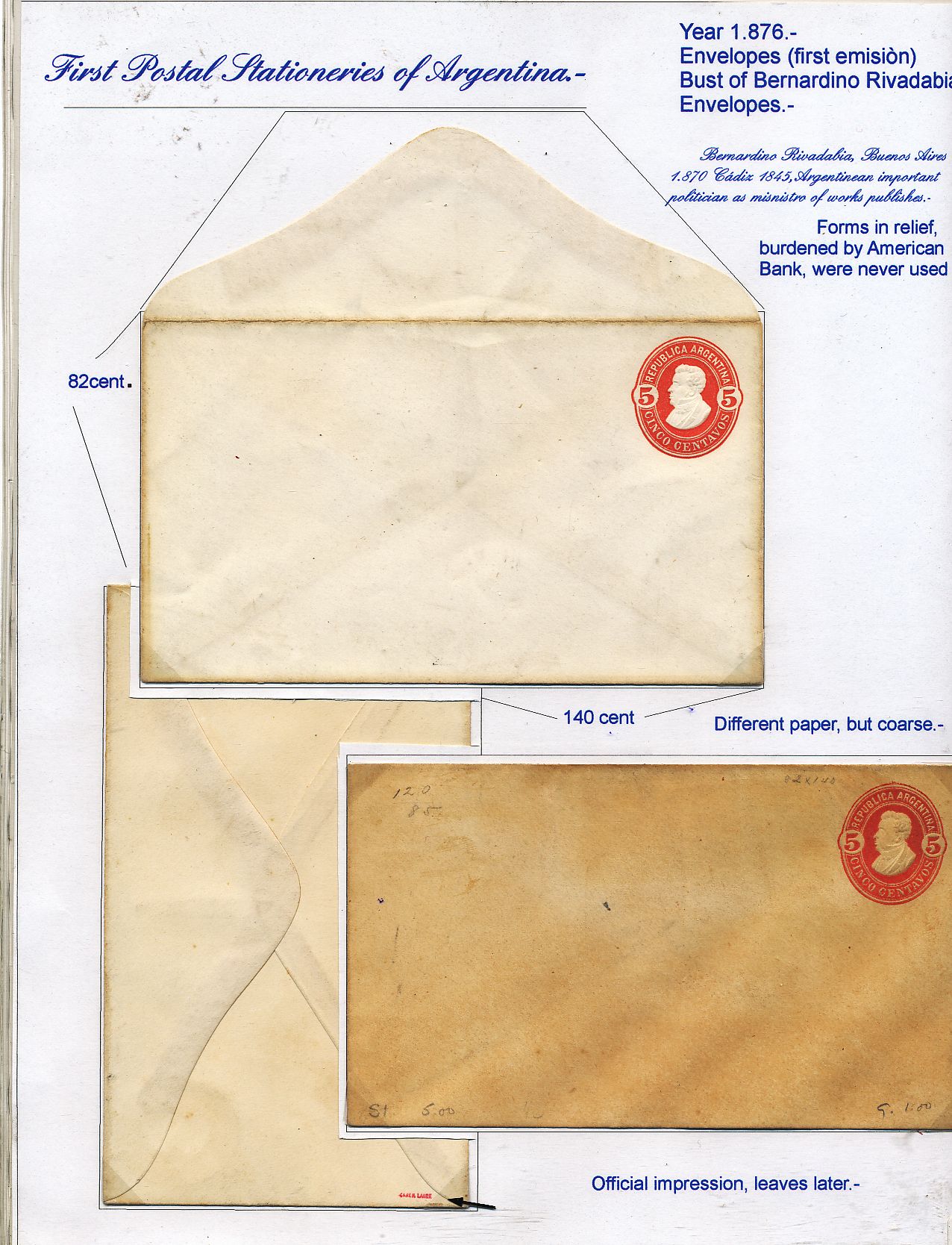 En este caso el primer tema a tratar es la serie de 1.876, que es un sobre que lleva impreso en relieve un busto de Rivadabia la imprimió la American Bank, el cierre es ondulado, se calcula que la tirada fue de unos 2.000 ejemplares, se imprimieron estos en el mismo tono de papel, aunque hoy en dia podemos encontrar, pienso que debido a la conservación, distintas tonalidades.-