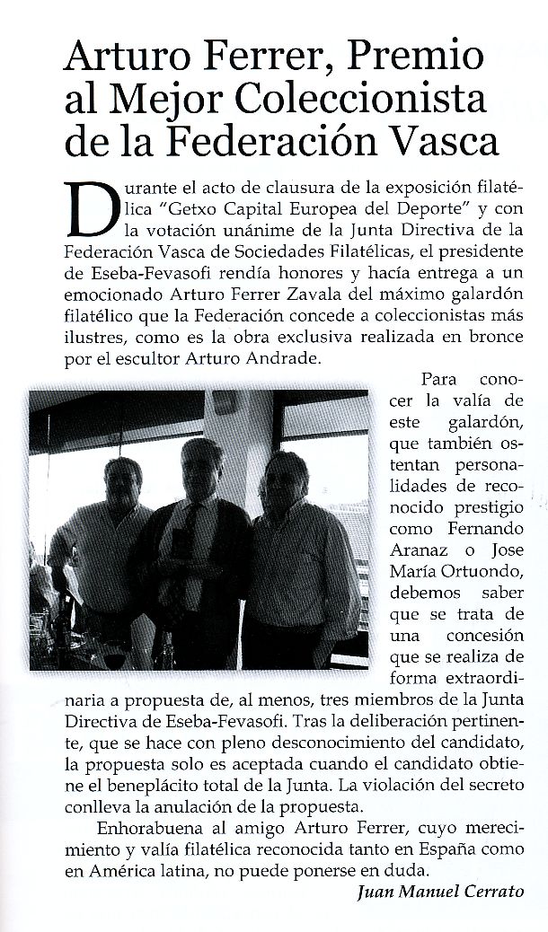 Vaya mi más cordial y sincero agradecimiento hacia mis compañeros, de la Federación Vasca de Asociaciones Filatélicas ESEVA. Por este premio.-