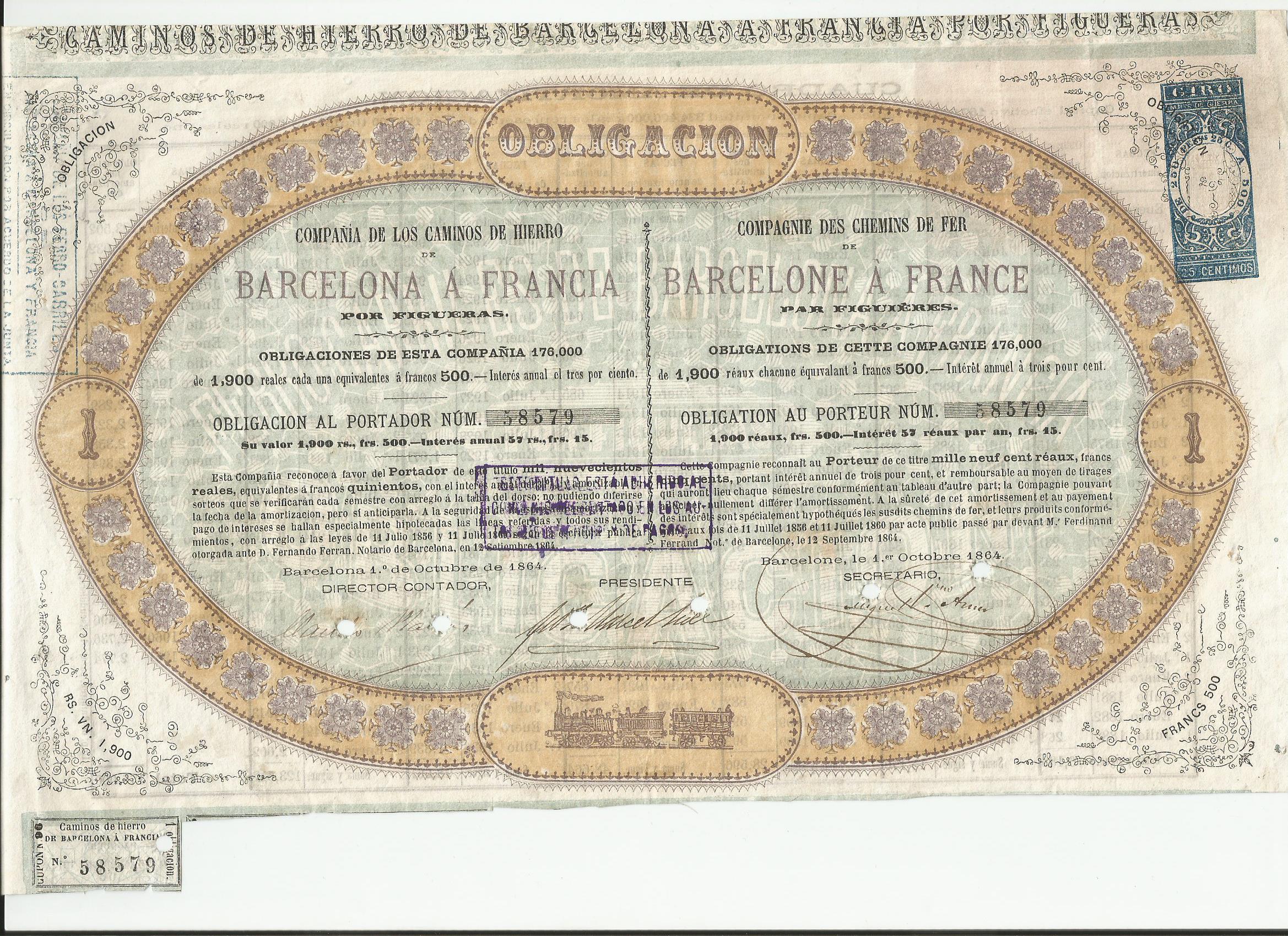 Obligación al portador de 1900 reales de vellón de la Cía de los Caminos de Hierro de Barcelona a Francia por Figueras.