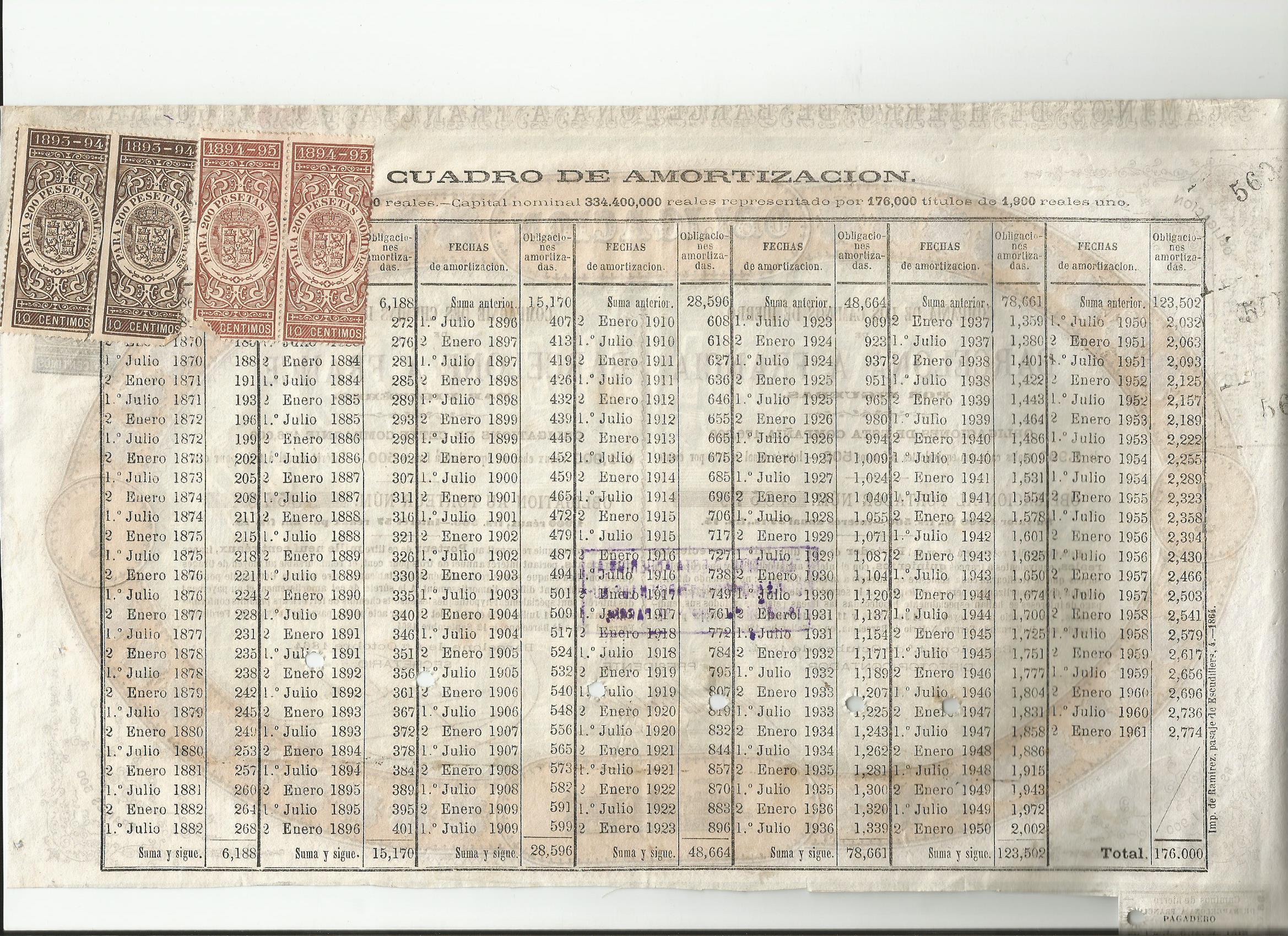 Reverso de dicha obligación en la que se muestra la tabla de amortización con 4 sellos ficales en la parte superior izquierda
