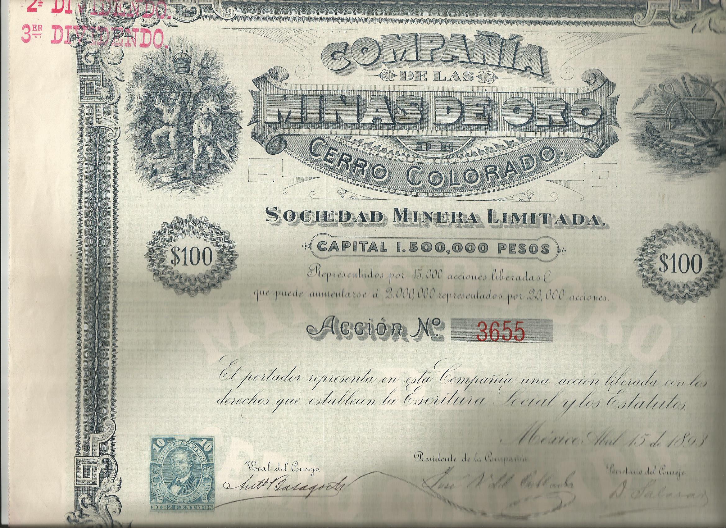 Acción de 100 pesos de La Cía de las Minas de Oro de Cerro Colorado.