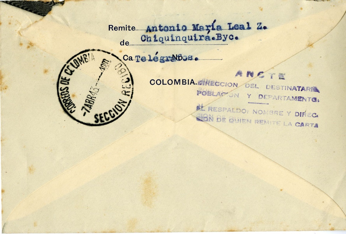 Carta enviada desde Chiquinquirá a Bogotá el 7 de abril de 1.943, tanto en el frontal como en el dorso, vienen impresos unos cuños indicando que se debe poner la dirección con cuidado.-