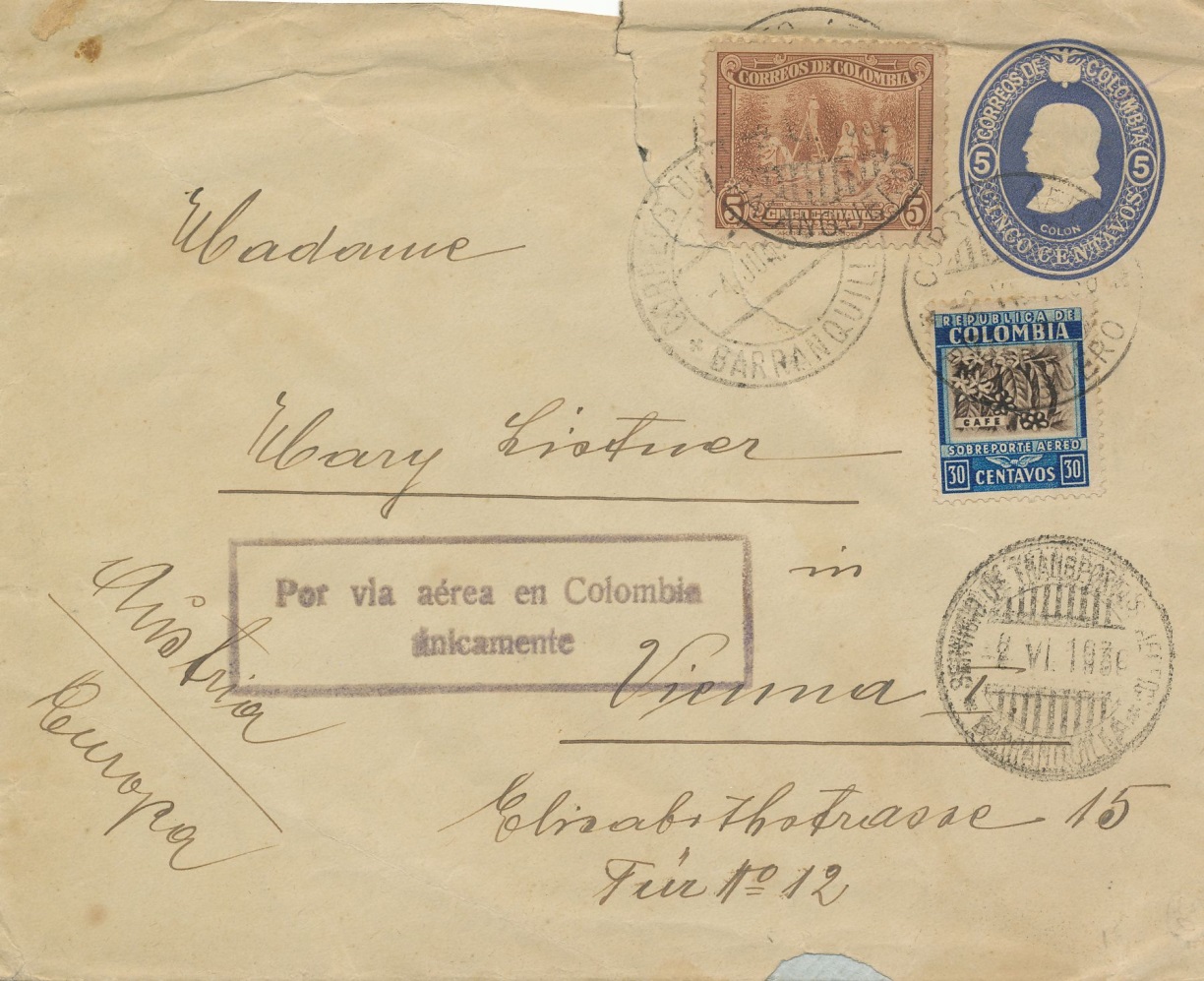 Sobre enviado a Viena (Austria) el 8 de junio de 1.936, a través de las líneas aéreas, desde Tolima, franqueo complementario de 35 centavos en el frontal.-