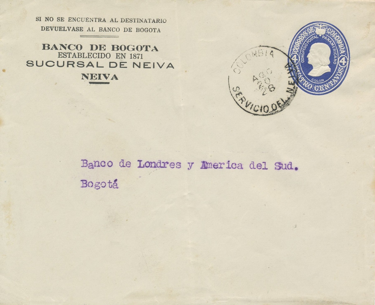 El año 1.925 y bajo la Presidencia de Pedro Nel Ospina Vásques, se imprimió este sobre pre-franqueado, el sello representaba a Cristóbal Colon, y de formato era muy parecido al del año 1.932, solo que en esta ocasión el valor era de cuatro centavos, a diferencia de los anteriores este sobre fue muy utilizado, hasta el año 1.934.-