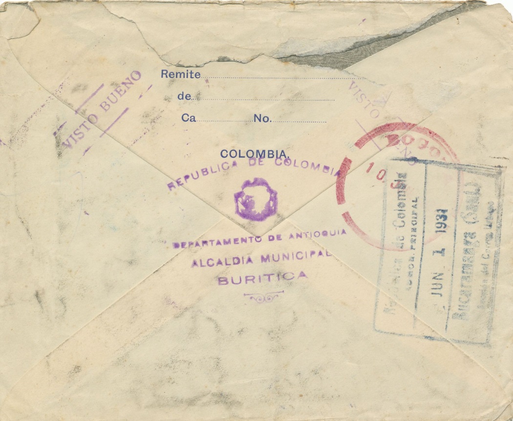 Carta enviada desde Antioquia el 21 de mayo de 1.931 a Bucaramanga (Santander).-