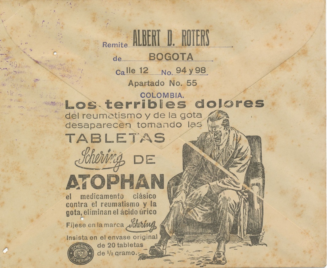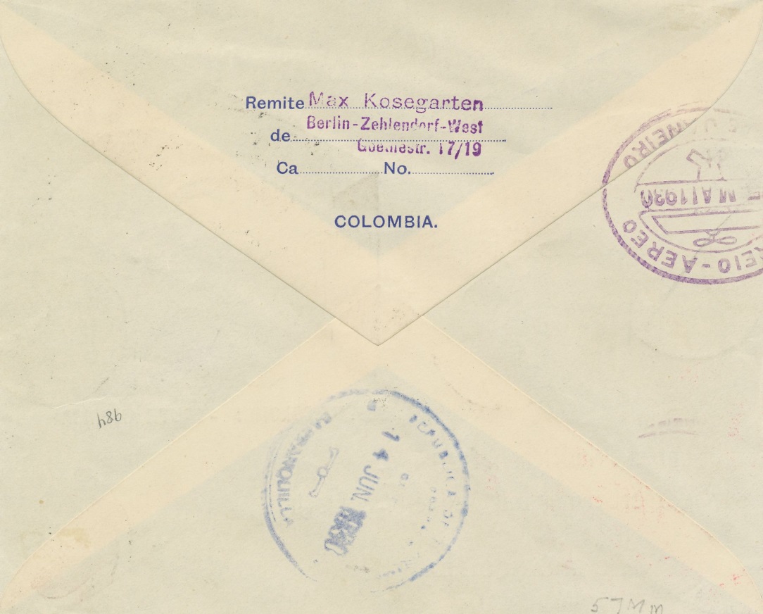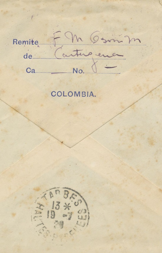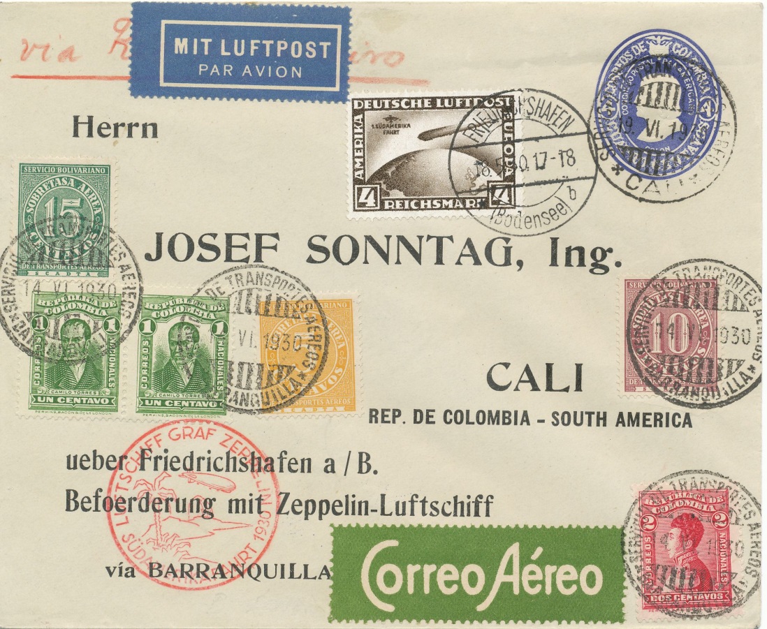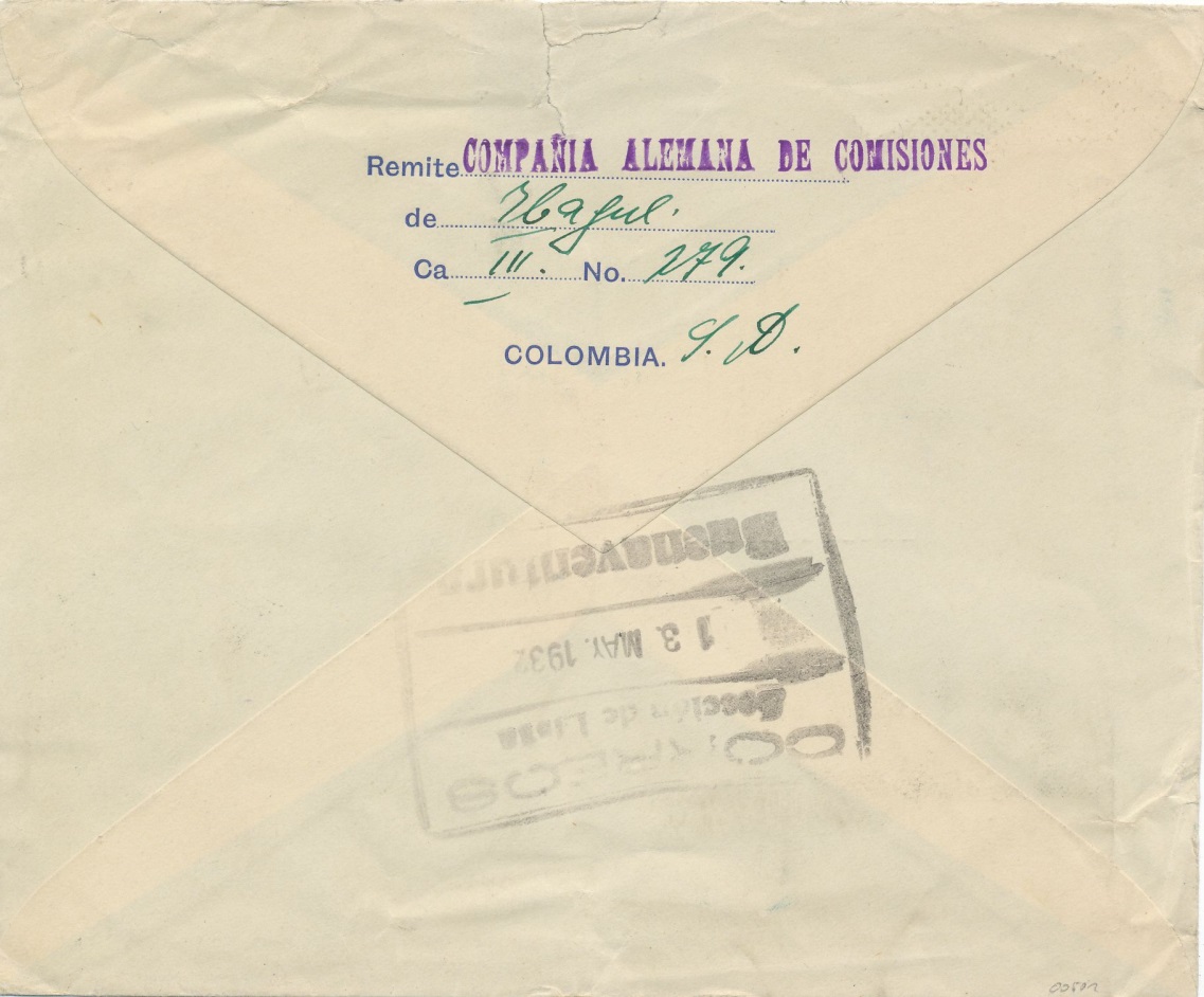 Carta enviada desde Bogotá a Hamburgo, con impresiones tanto en el frontal como en la parte posterior (17 diciembre de 1.930).-