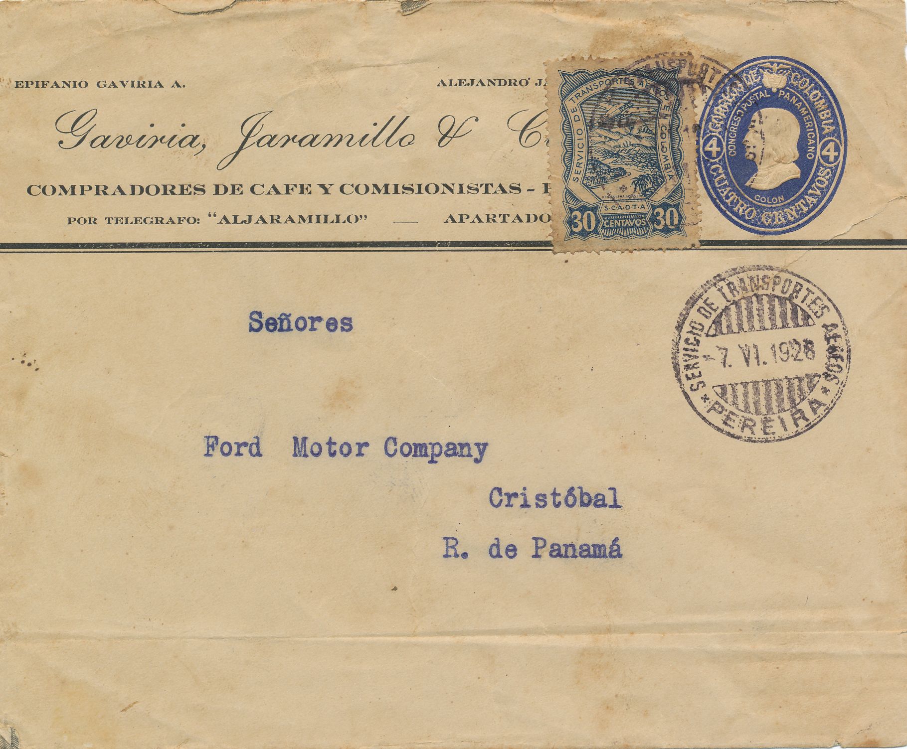 Carta enviada por transporte aéreo desde Pereira el 7 de junio de 1.928 a Cristóbal (Panamá).-