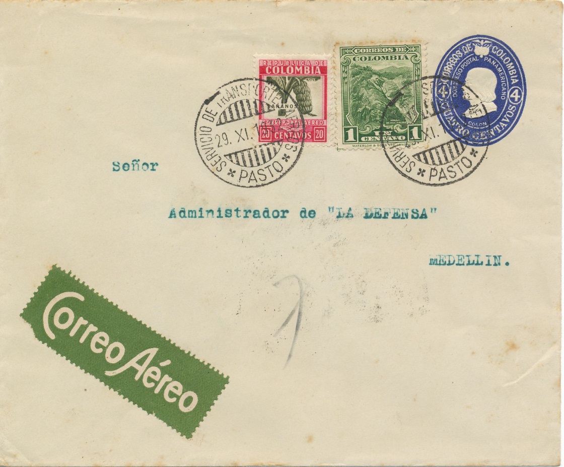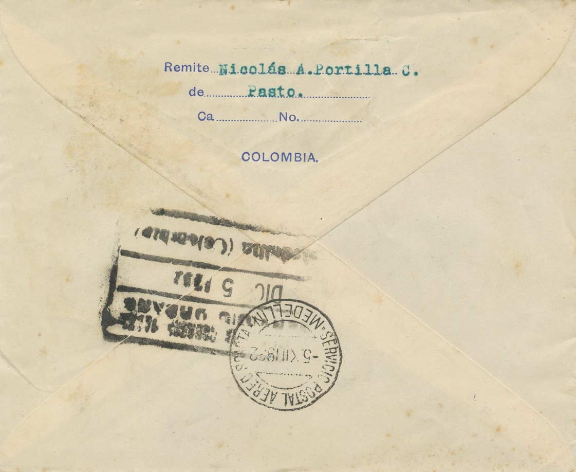 Carta enviada desde Pasto el 29 de noviembre de 1.932 a Medellin, por correo aéreo.-
