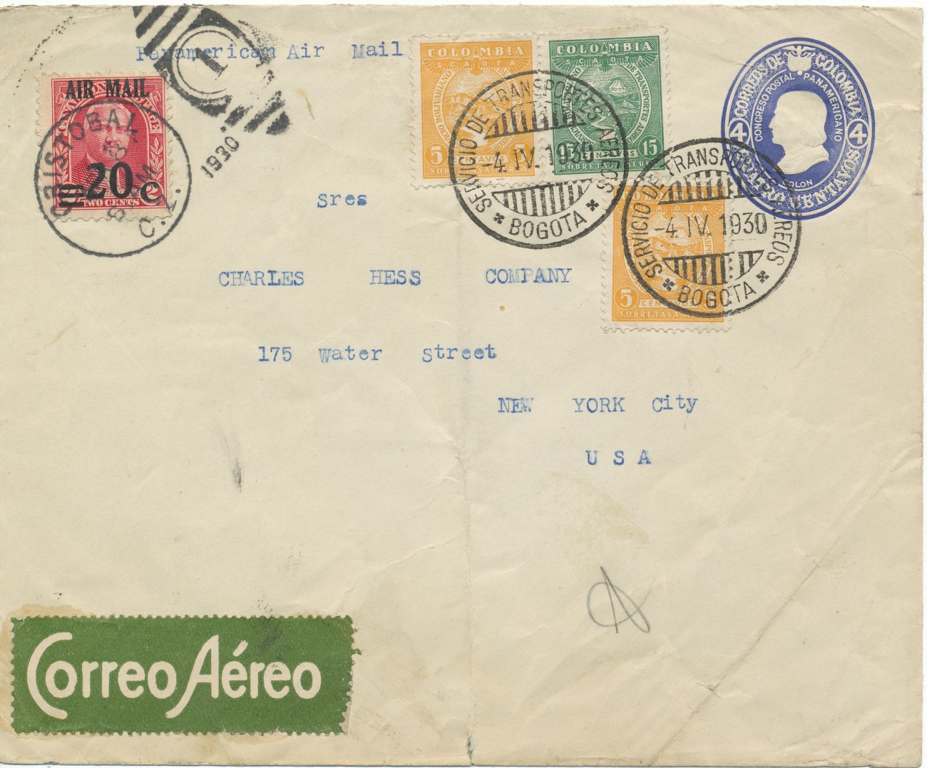 Sobre enviado desde Bogotá a New York, con franqueo misto Colombiano-estado-unidense, el día 4 de abril de 1.930, marcas de tránsito y de llegada.-