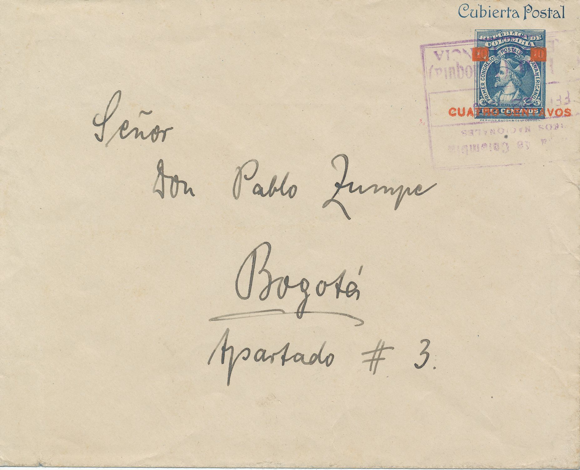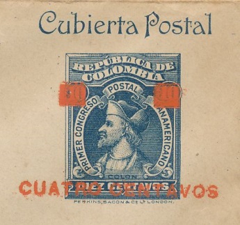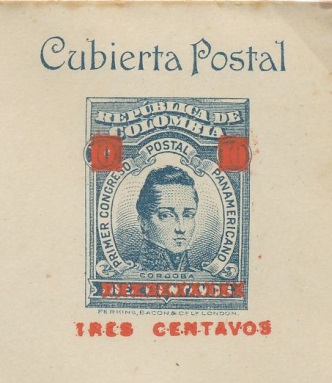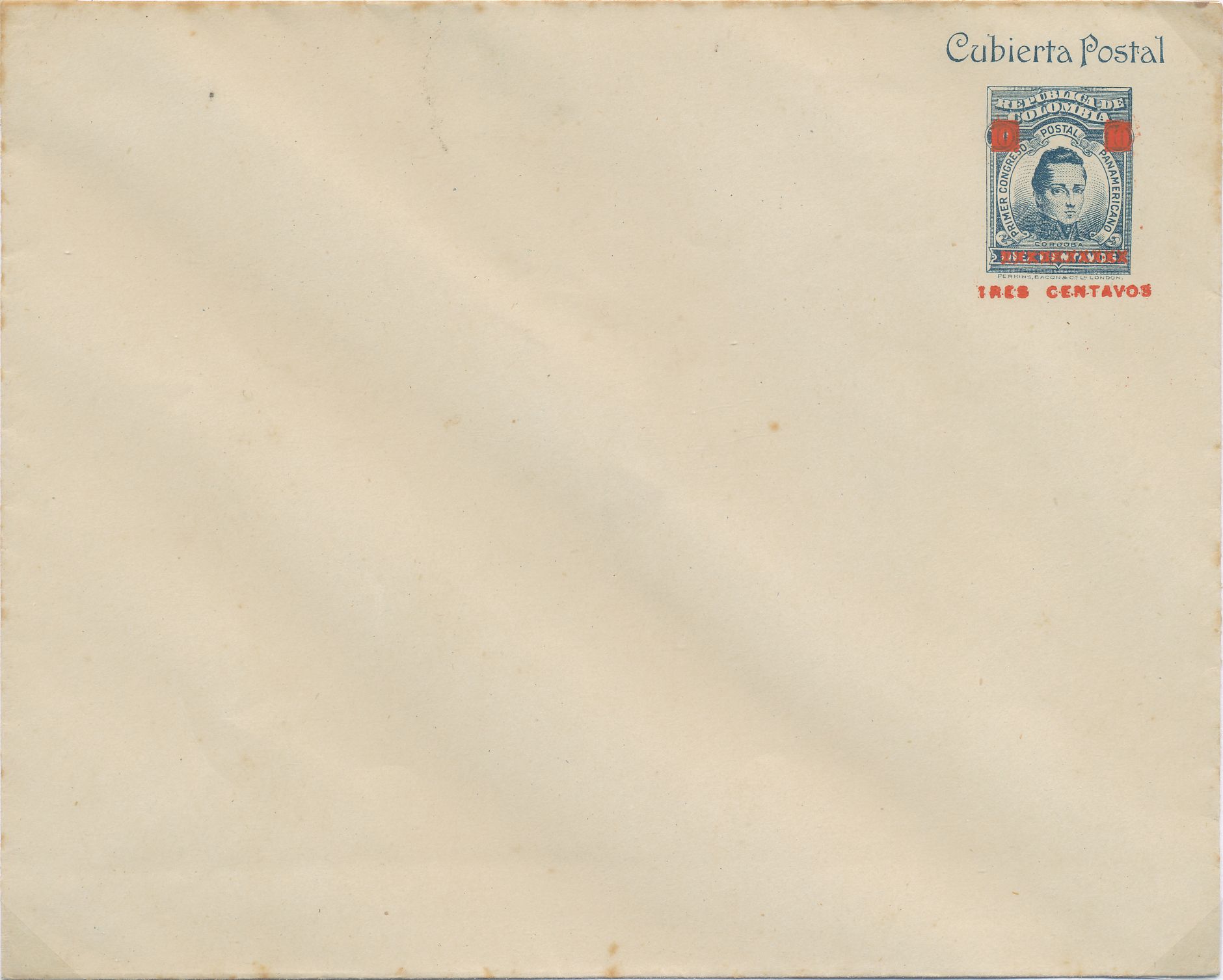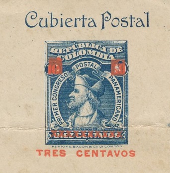 El año 1.924 siendo Presidente de la Nación Pedro Nel Ospina Vásquez, se sobrecargaron los sobres de diez centavos de la serie congreso postal Panamericano, adjudicándoles un nuevo valor de tres centavos.-