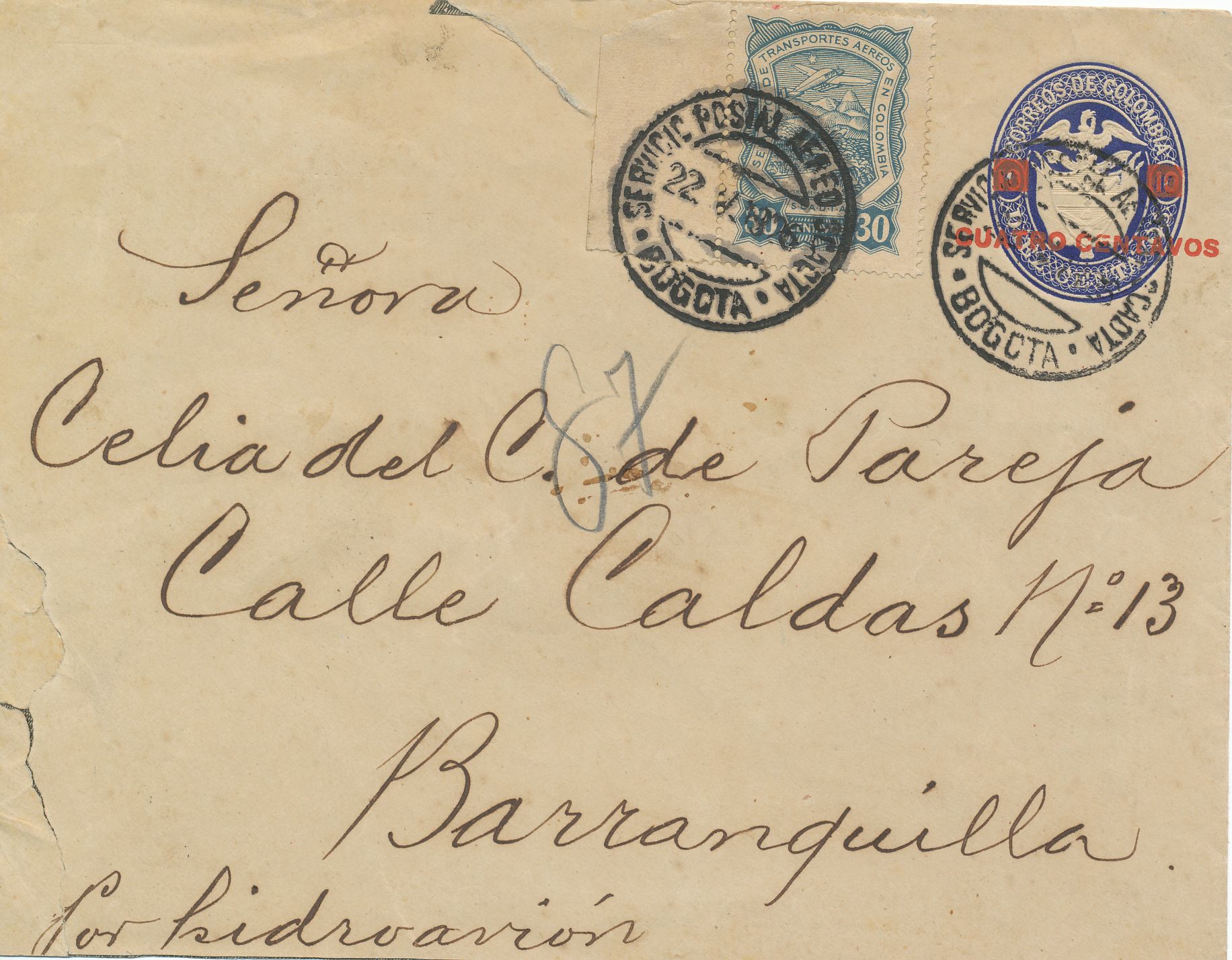 Sobre enviado desde Bogotá a Barranquilla por avión el 18 de octubre de 1.926.-