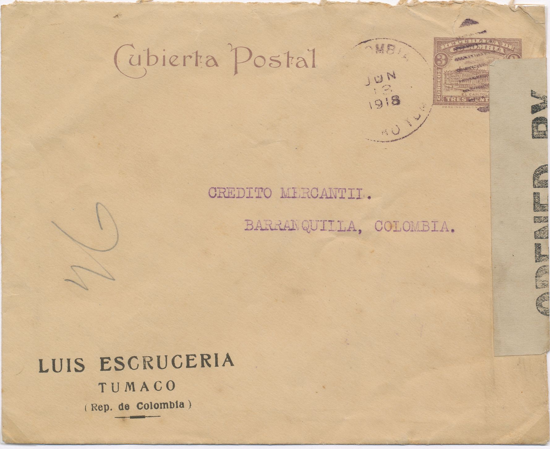 La fecha oficial de la impresión de este sobre fue el año 1.920 no obstante el que a continuación se exhibe pasó censura en Barranquilla el mes de junio de 1.918, como se puede comprobar por los matasellos ubicados en las partes delantera y posterior.-