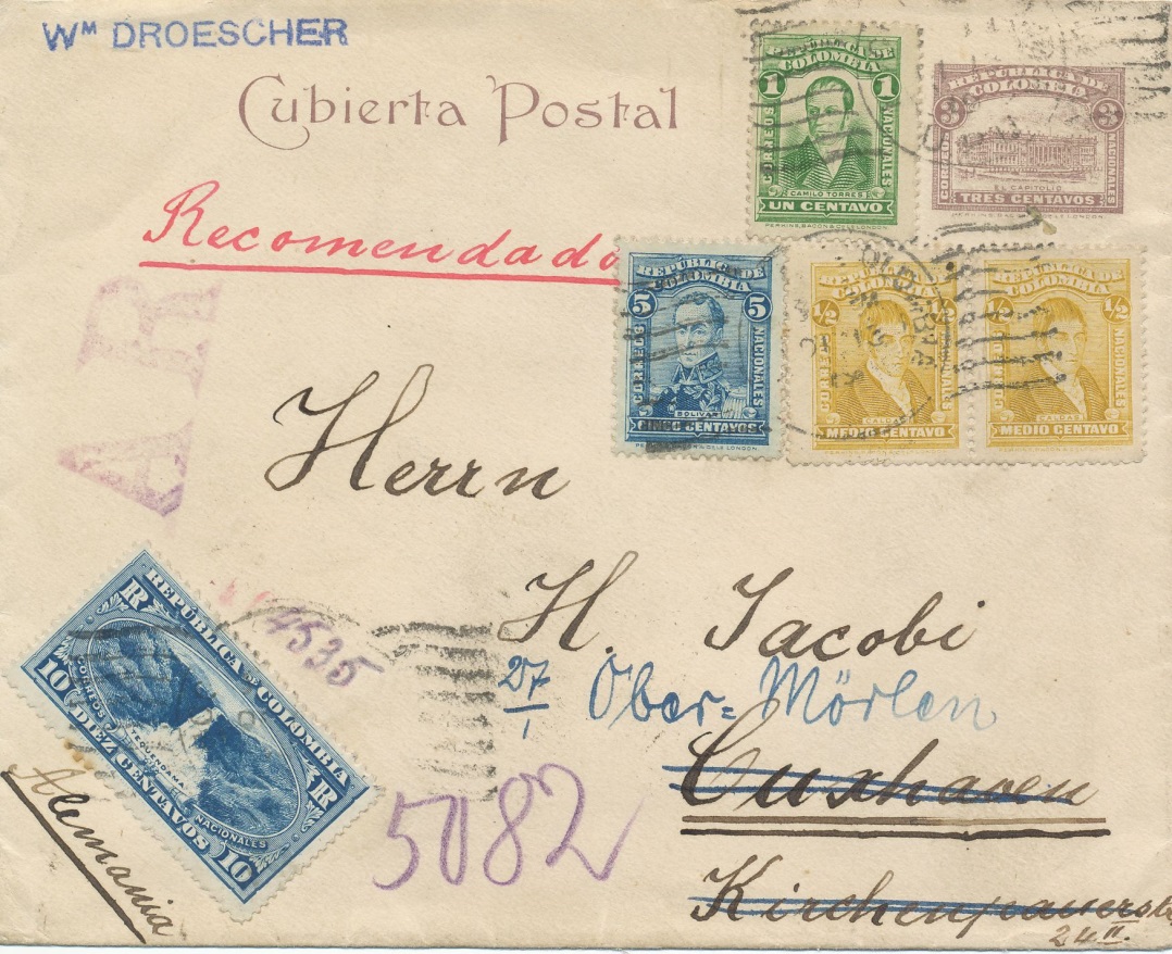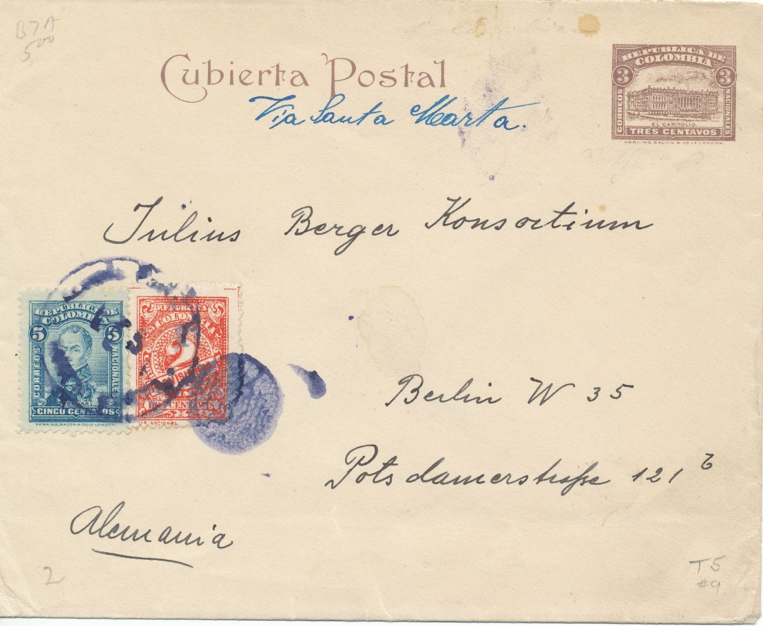 Envió “normal” a Alemania vía Santa Marta franqueo complementario de 7 centavos.-