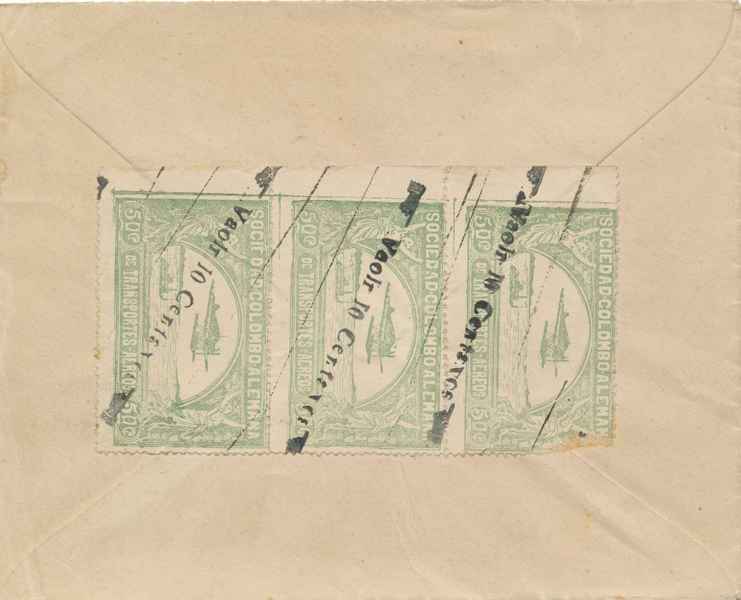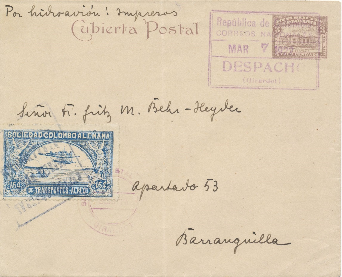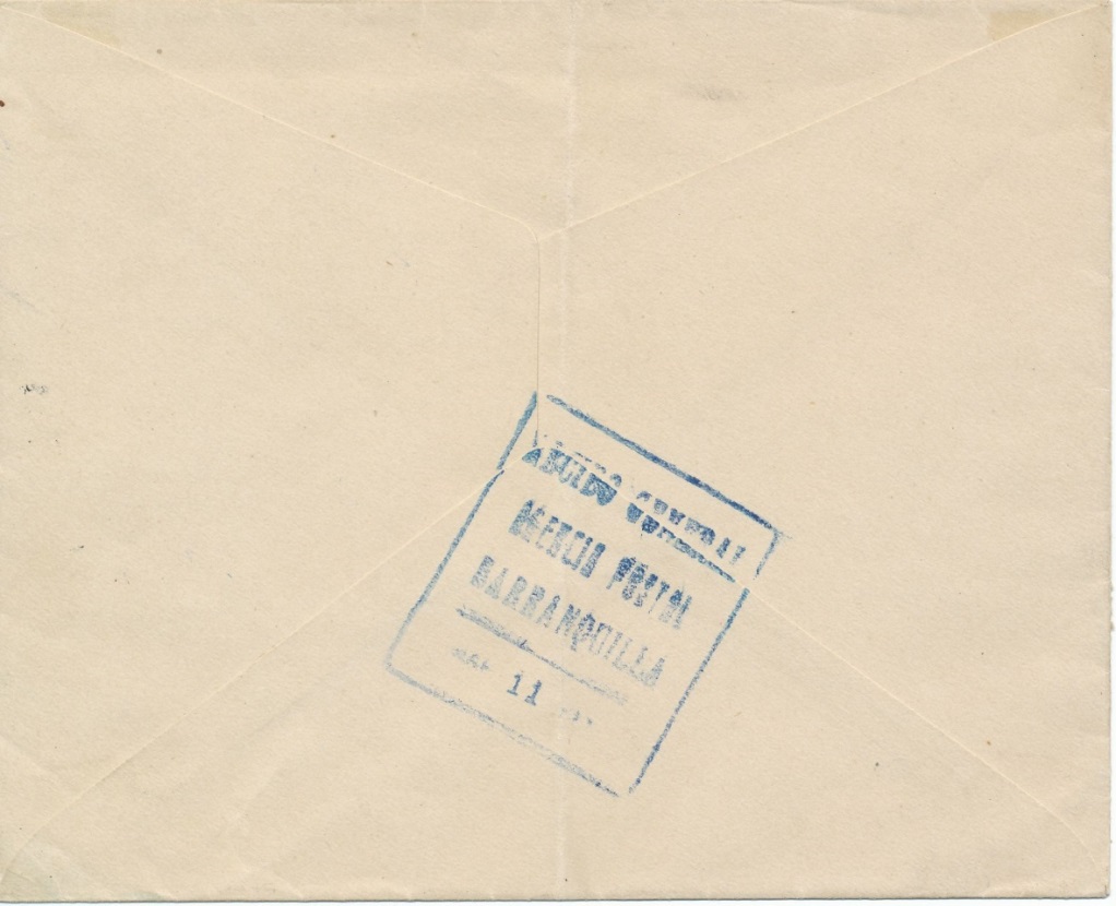 En la parte superior e inferior sobre dirigido desde Girardot a Barranquilla el 7 de marzo de 1.922 con el sello de quince centavos “correo aéreo “cancelado por el cuño “servicio postal aéreo de Girardot”, llegó a Barranquilla el 11 de marzo lo cual quiere decir que tardo cuatro días en ser transportado.-