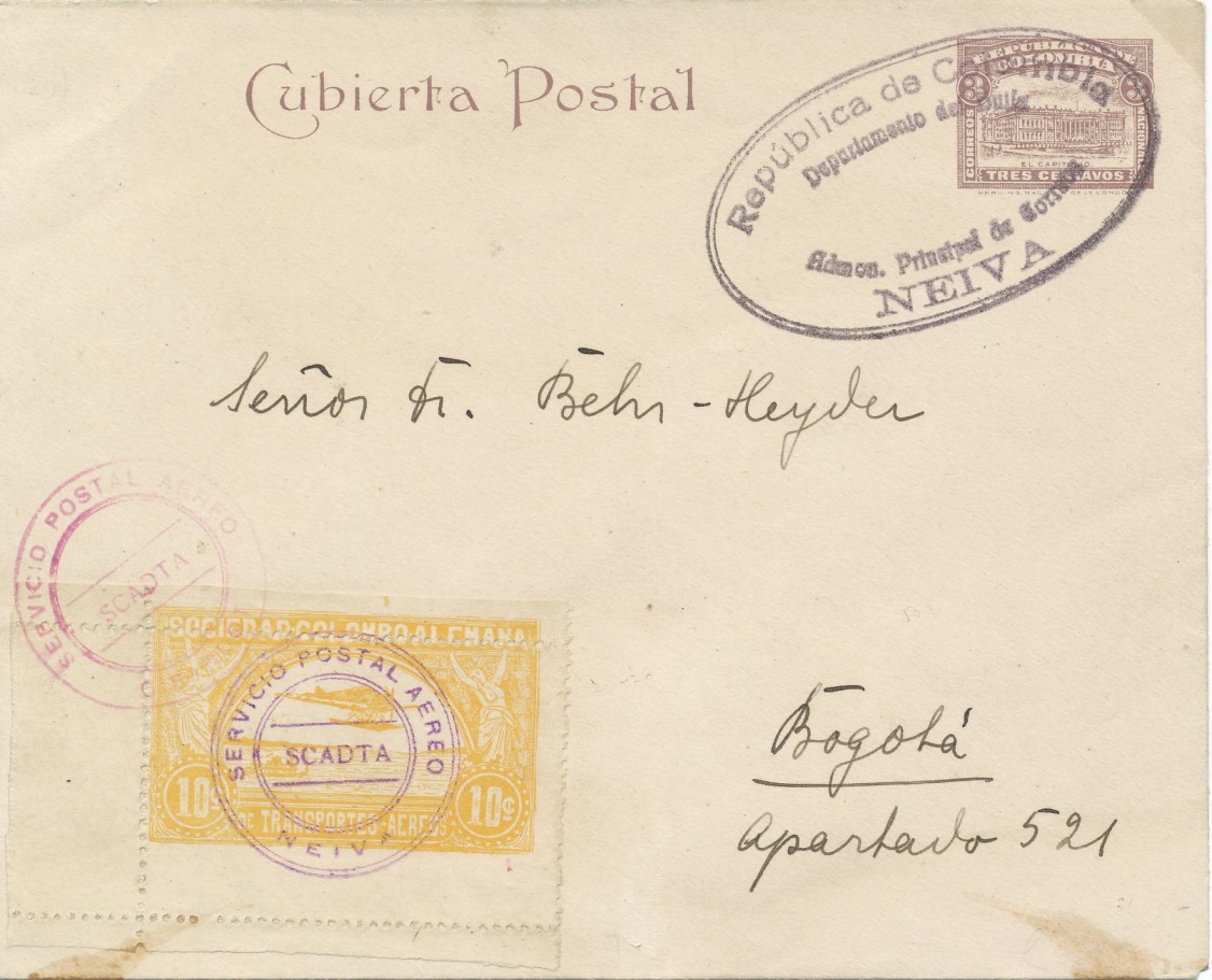 Sobre enviado desde Bogotá a Neiva con un sello de correo aéreo de diez centavos incorporado.-