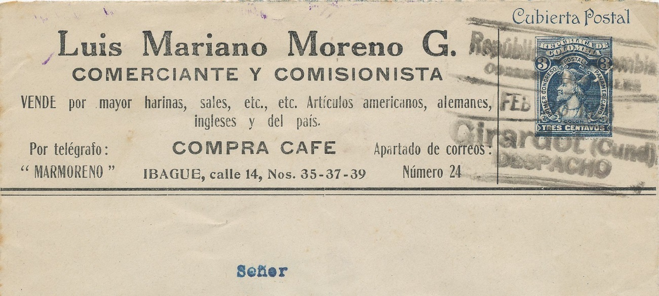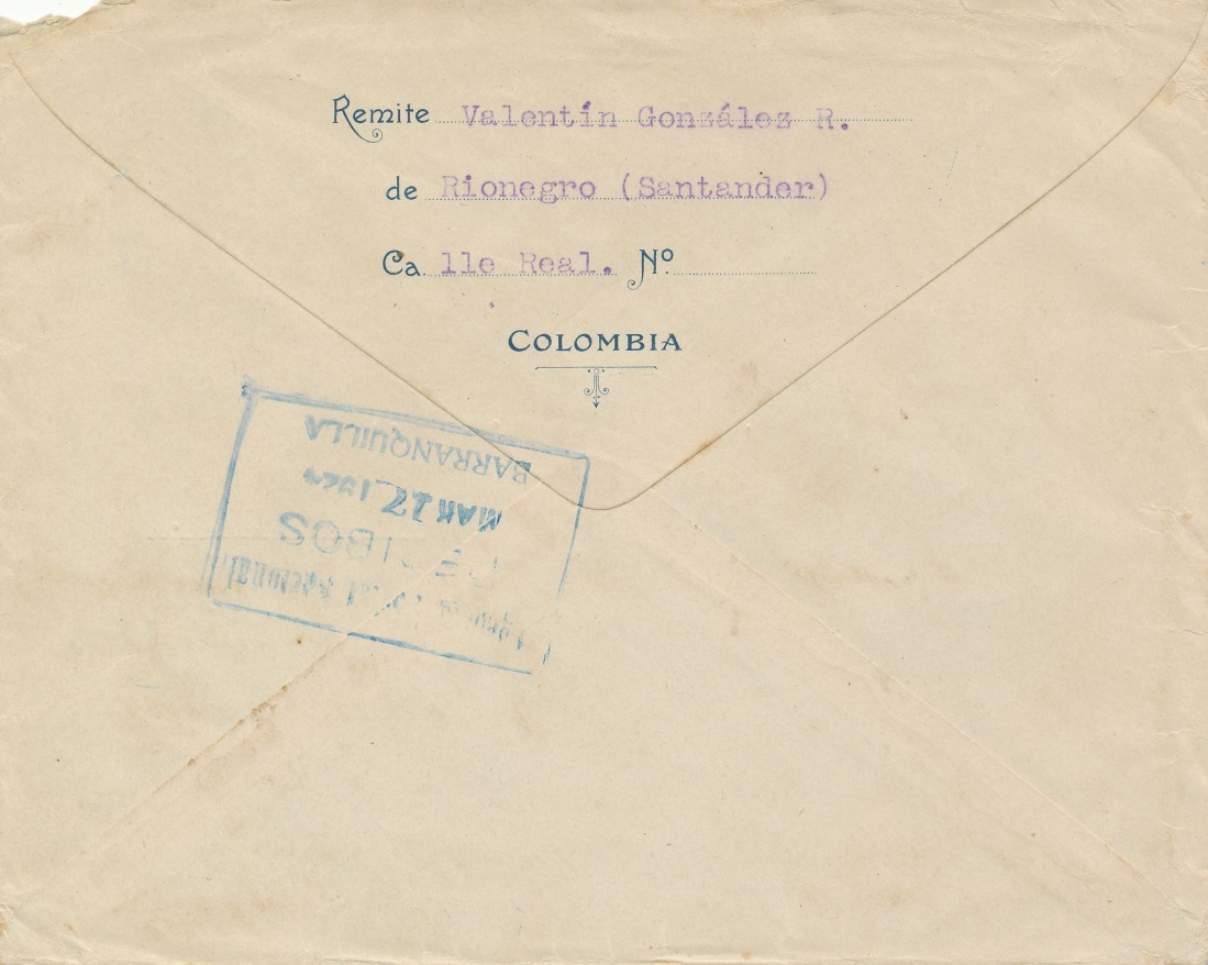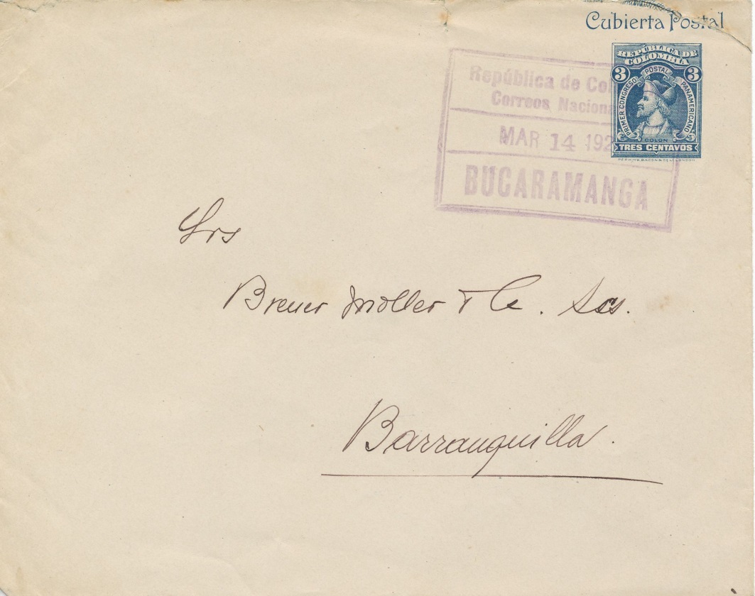 Sobre enviado desde Bucaramanga a Barranquilla el 22 de marzo de 1.924en el frontal matasellos de salida de Bucaramanga.