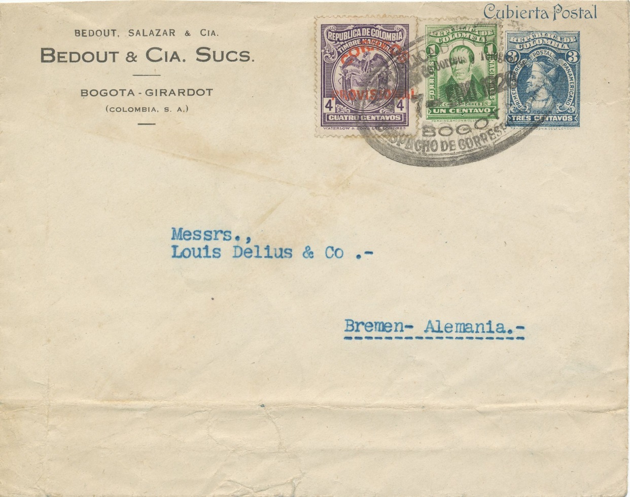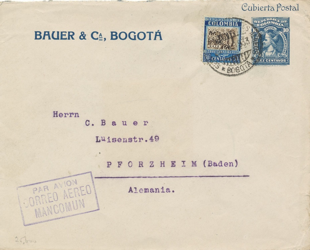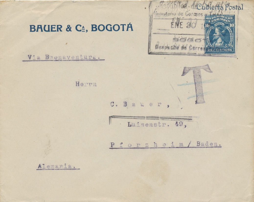 Bauer&Ciª, Bogota , en carta enviada a Alemania, cosa poco frecuente,las cartas enviadas al interior de Colombia son corrientes, no siéndolo asi las enviadas al extrajero.-