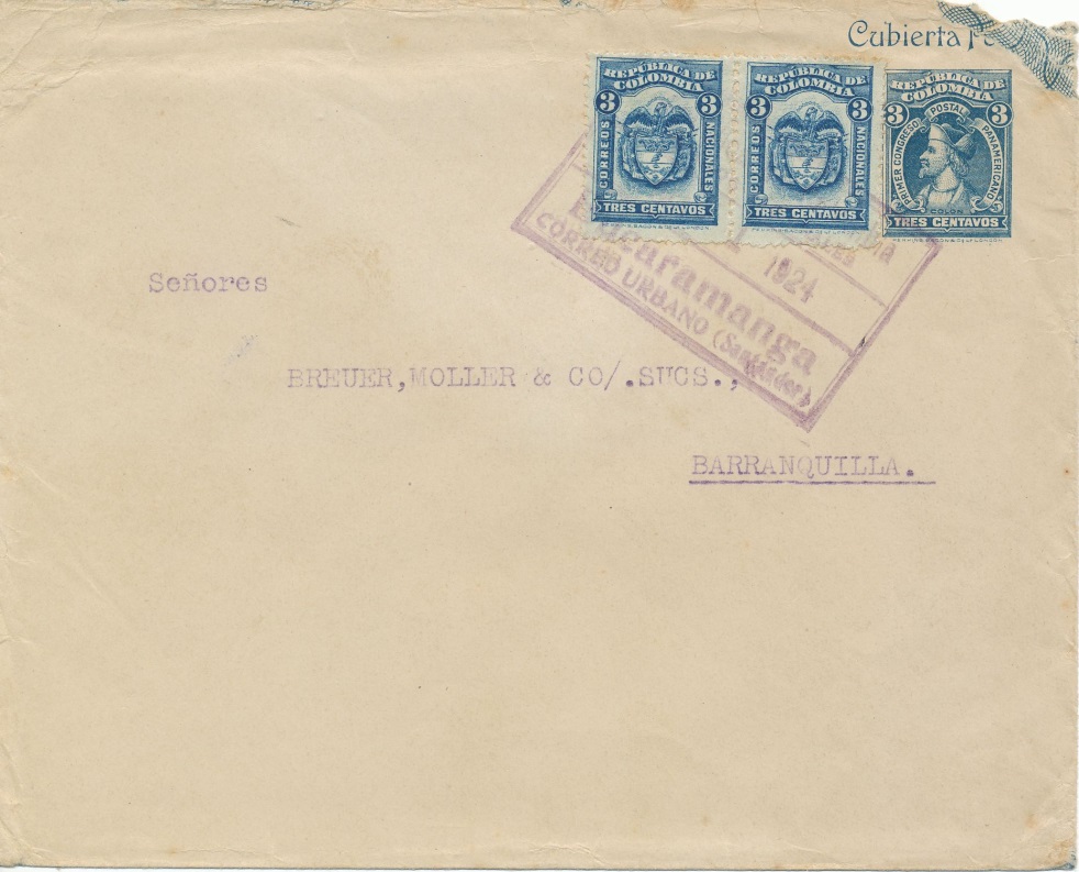 Sobre enviado desde Bucaramanga (provincia de Santander a Barranquilla el mes de marzo de 1.924.Parte frontal con tres sellos de 3 centavos matasellados.-