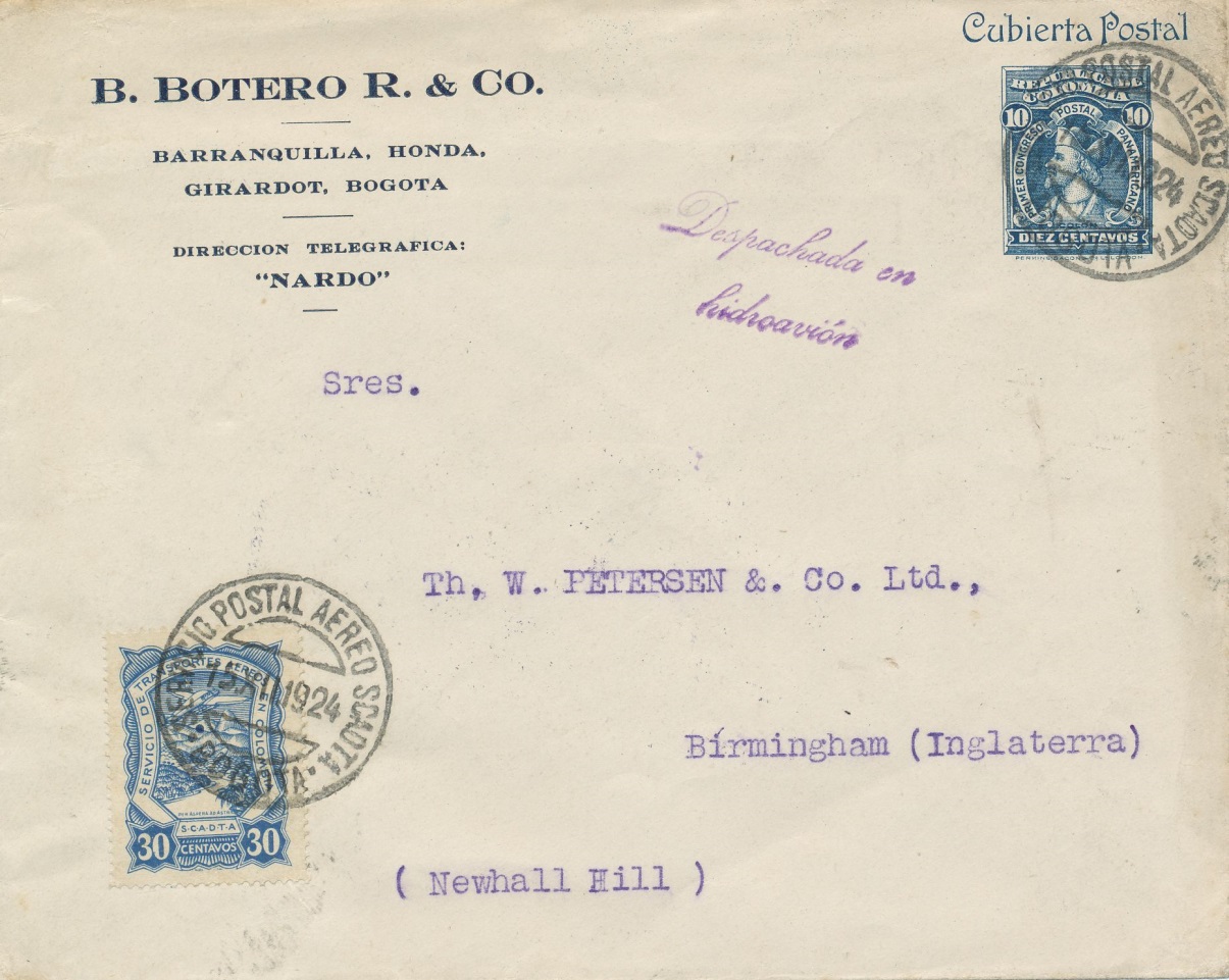 Envio realizado a Birmingan el 15 de Nov. De 1.924, por la compañía Scadta, sello complementario de treinta centavos.-