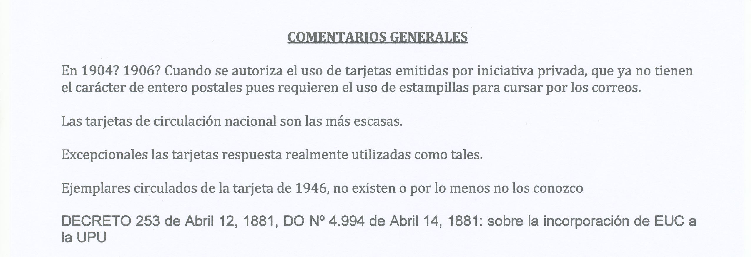 Tarjeta impresa con el mismo diseño que las emisiones de 1.889, aunque sin pie de imprenta, posiblemente gravada en el taller litográfico de Demetrio Paredes, y lo fue el año 1.907. No tiene sello y en su lugar hay una indicación de la estampilla que se debe poner tanto si se va a utilizar la tarjeta para el correo interior (un centavo) como para el exterior (dos centavos).-