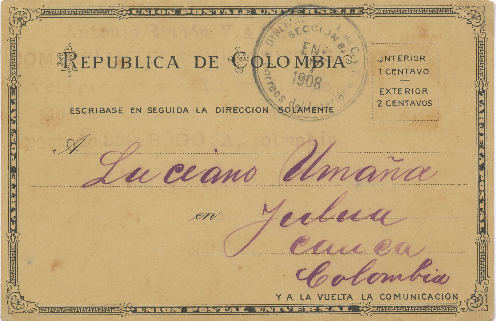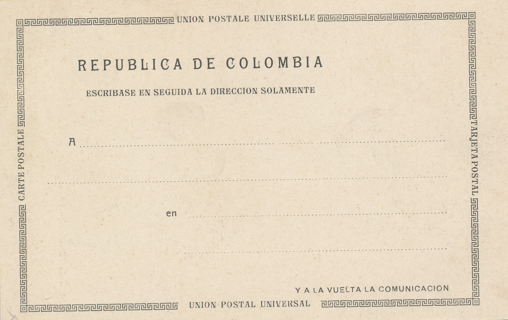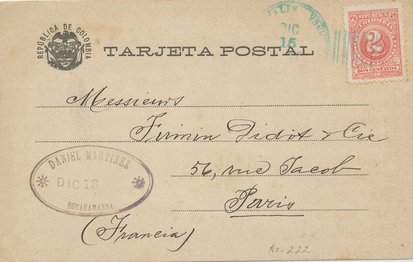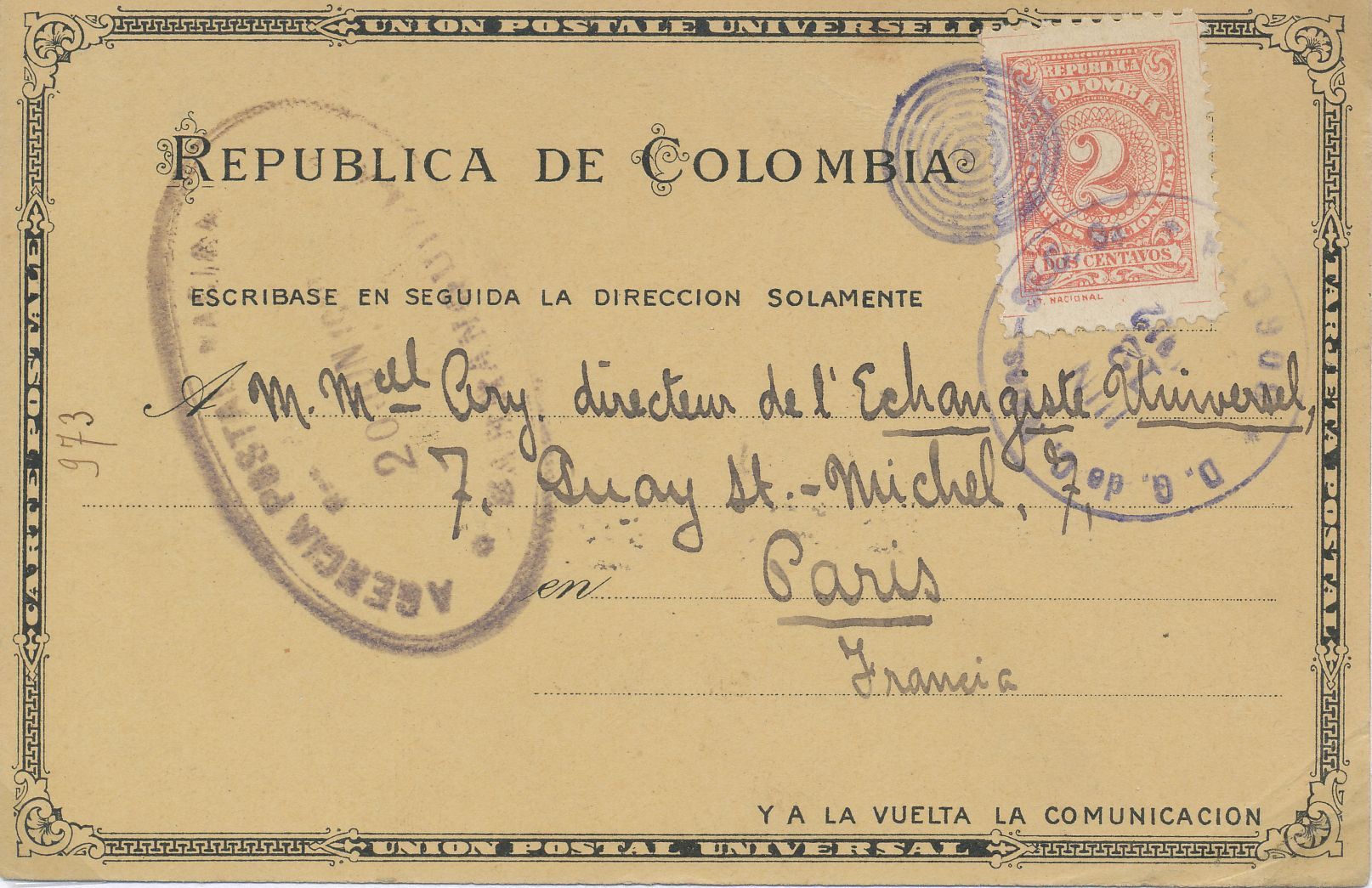 Ejemplar de la tarjeta, circulado, con el sello correspondiente desde Bogotá a Paris el año 1.912.-