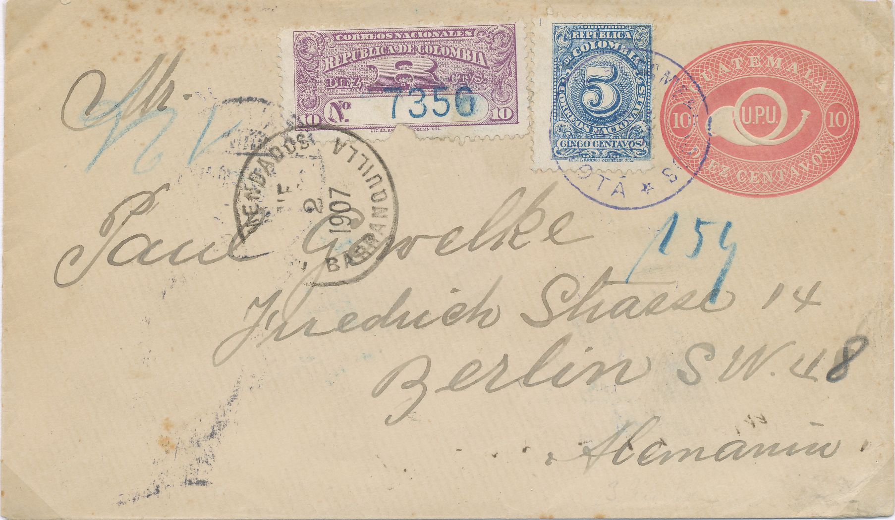 Entero Guatemalteco, circulado el año 1.907 desde Colombia a Alemania certificado, con los sellos que corresponden a la tarifa Colombiana, al ser válido para U.P.U. lo admitió también el correo Colombiano.-