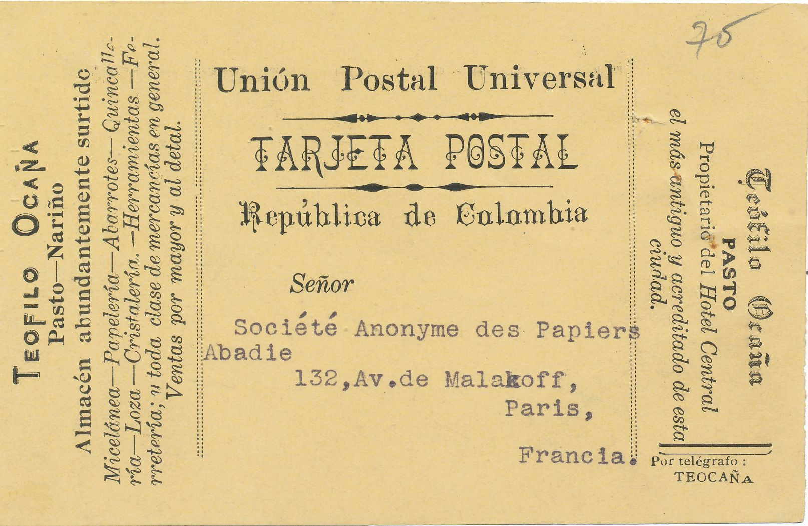 La anterior fue enviada desde Pasto el día 12 de febrero de 1.922 a Paris, posiblemente dentro de un sobre ya que no constan marcas de paso.-