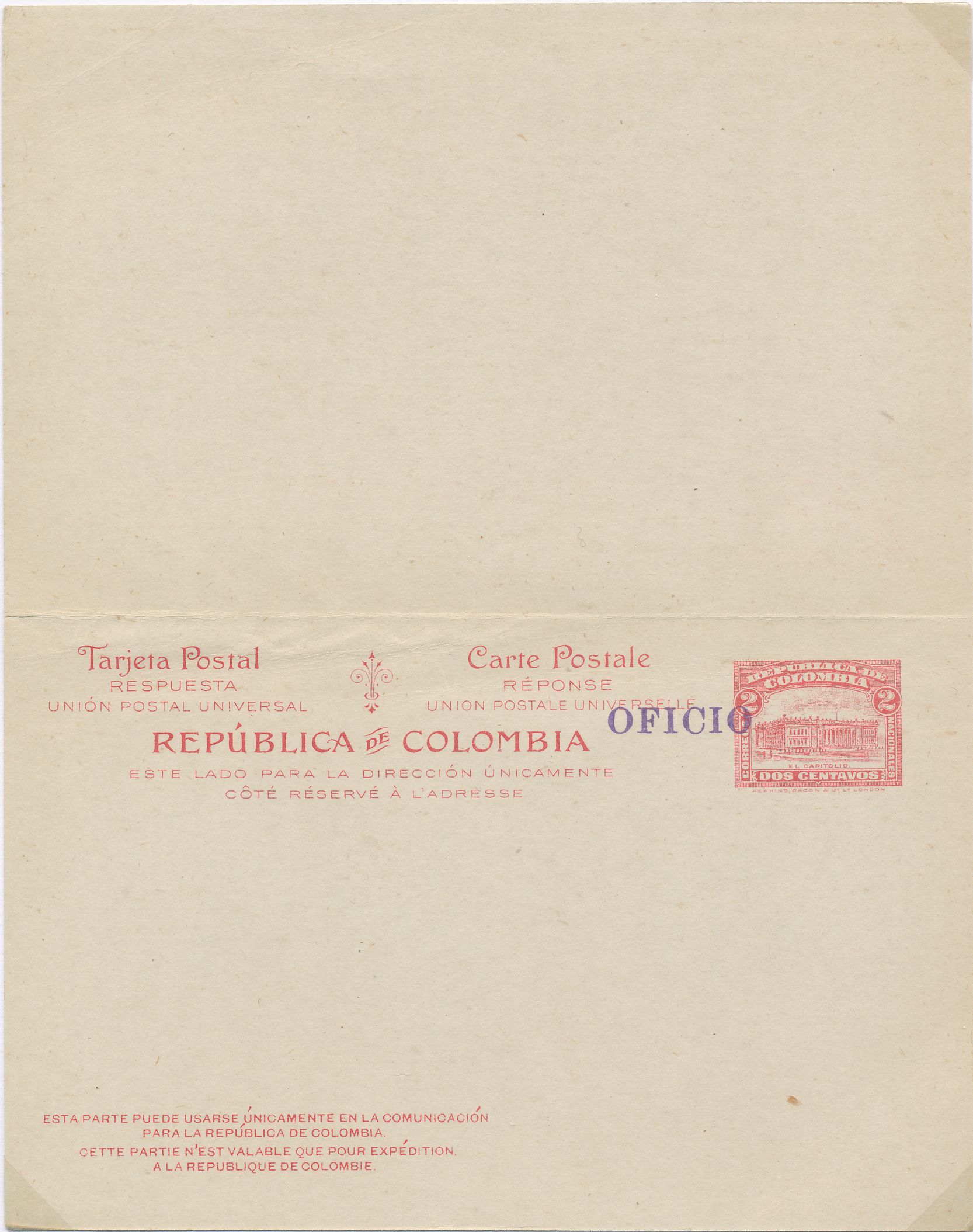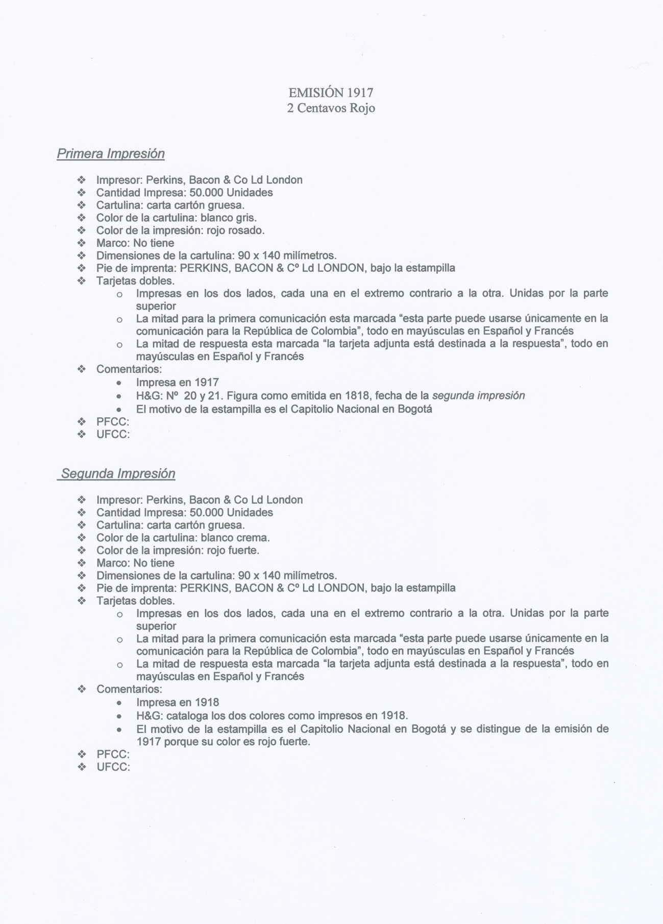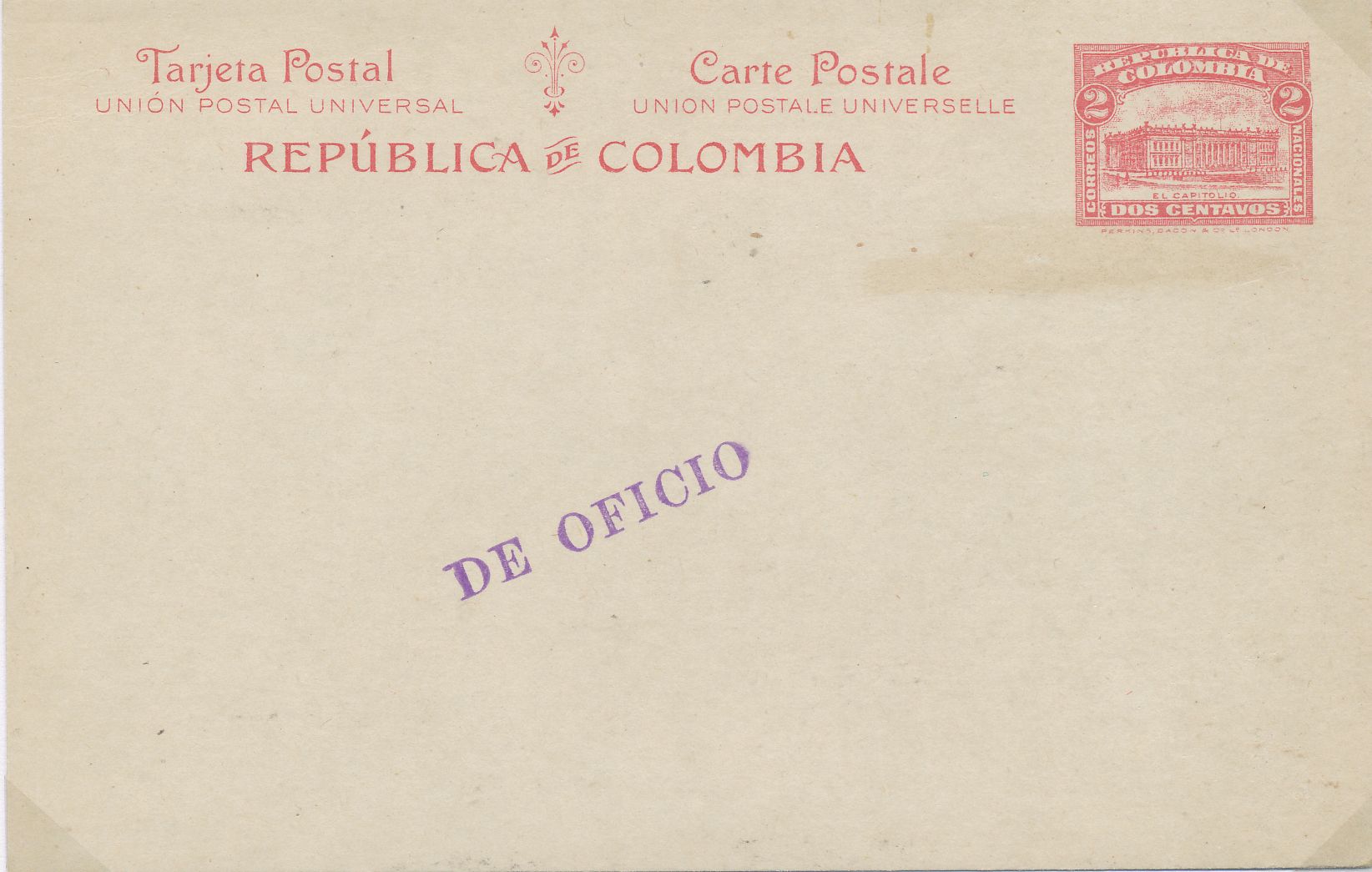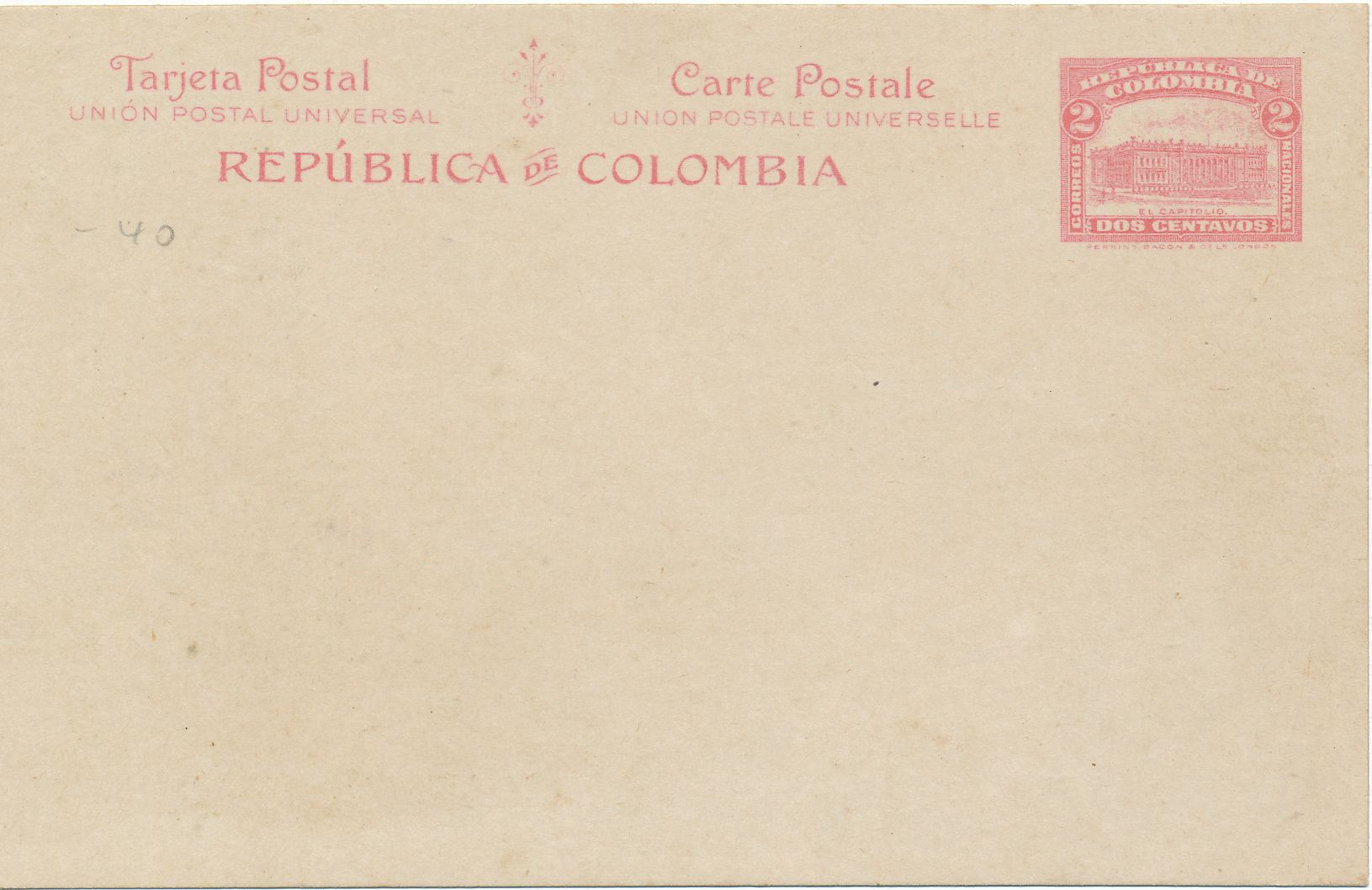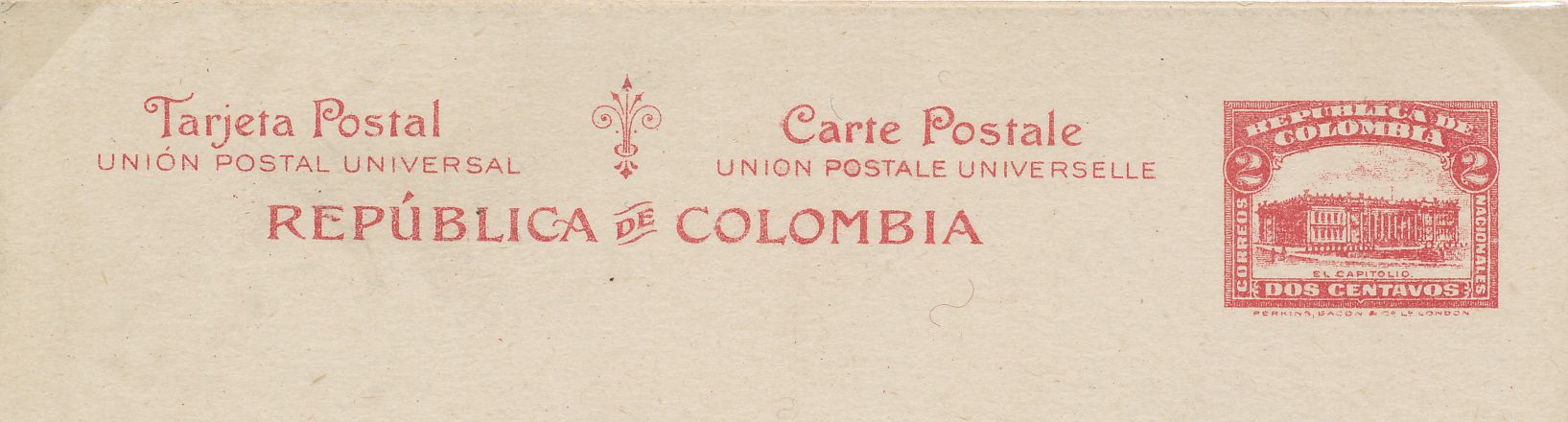 El monumento representado en el sello es el Capitolio Nacional de Bogotá. La primera impresión de esta tarjeta se hizo el día 23 de agosto de 1.916 entrando en circulación en noviembre de ese año y la segunda el 25 de agosto de 1.917, el envió a circulación se retrasó por causa de la segunda guerra mundial, se imprimieron en ambos casos cincuenta mil tarjetas.-