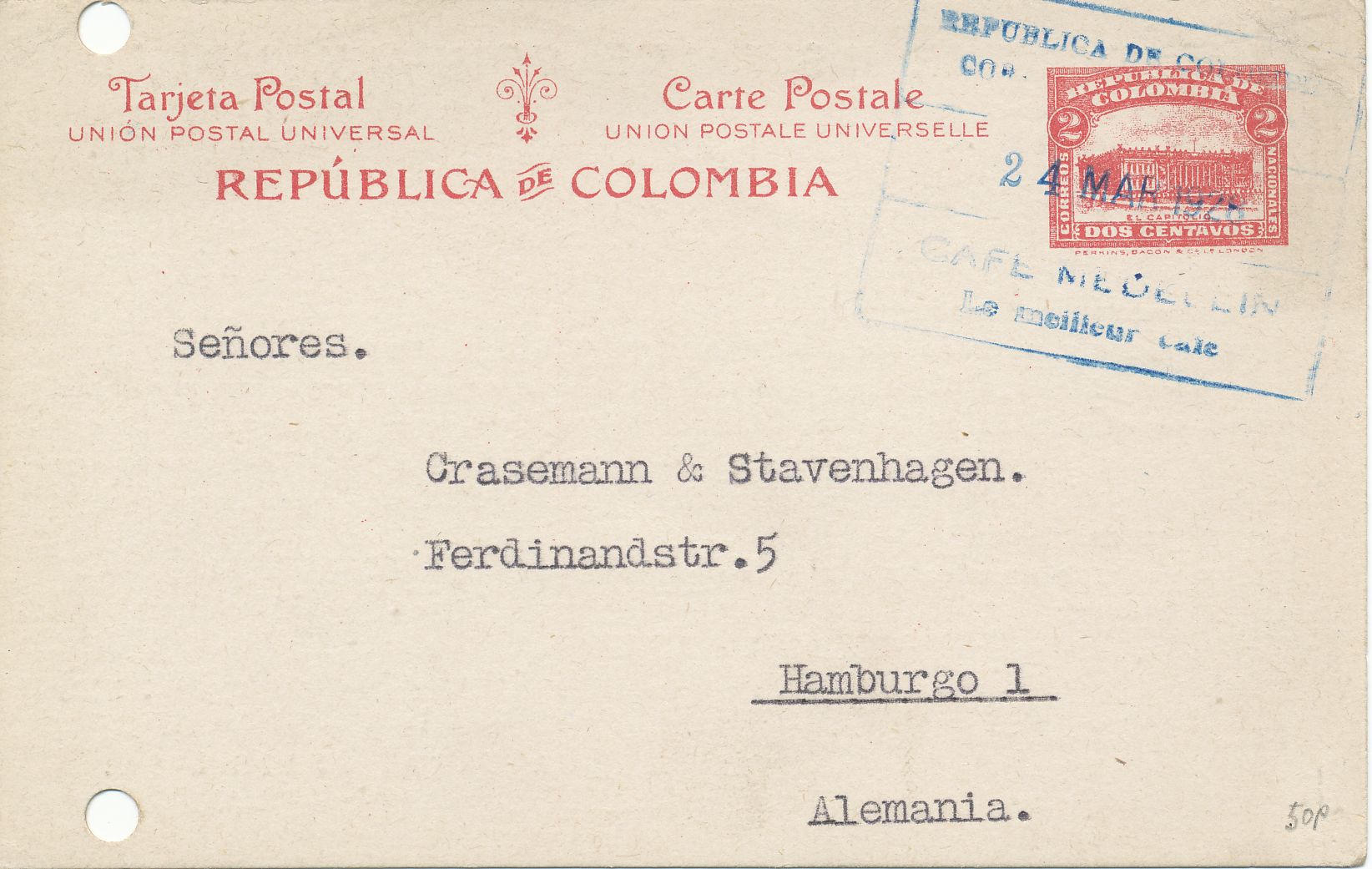 Como en esta enviada a Hamburgo ( Alemania ) el 24 de marzo de 1.928, desde Bogotá por la compañía de seguros marítimos cuyo agente era Gabiria,Smith & Co.