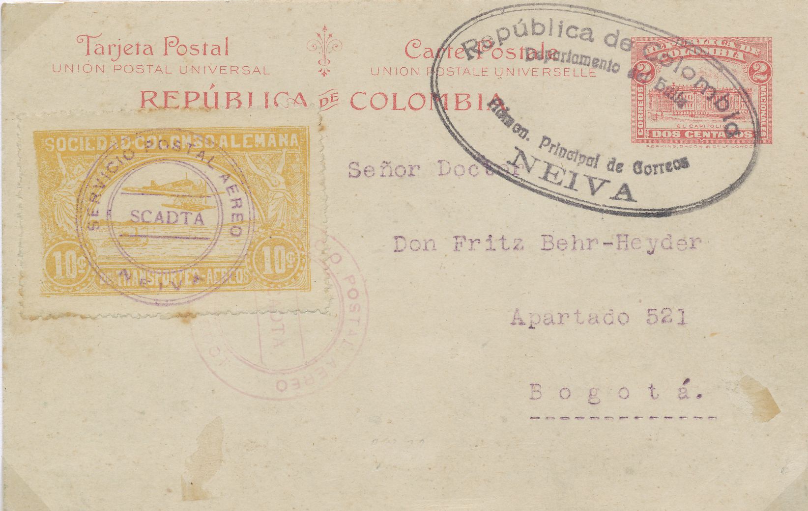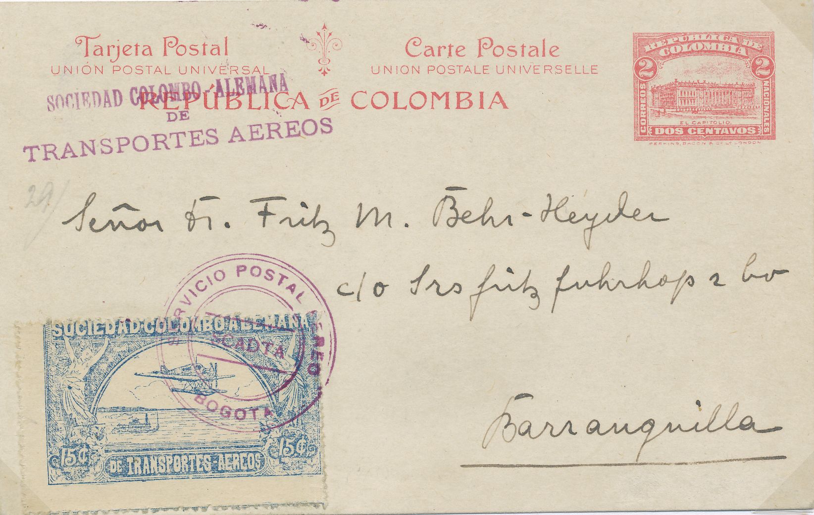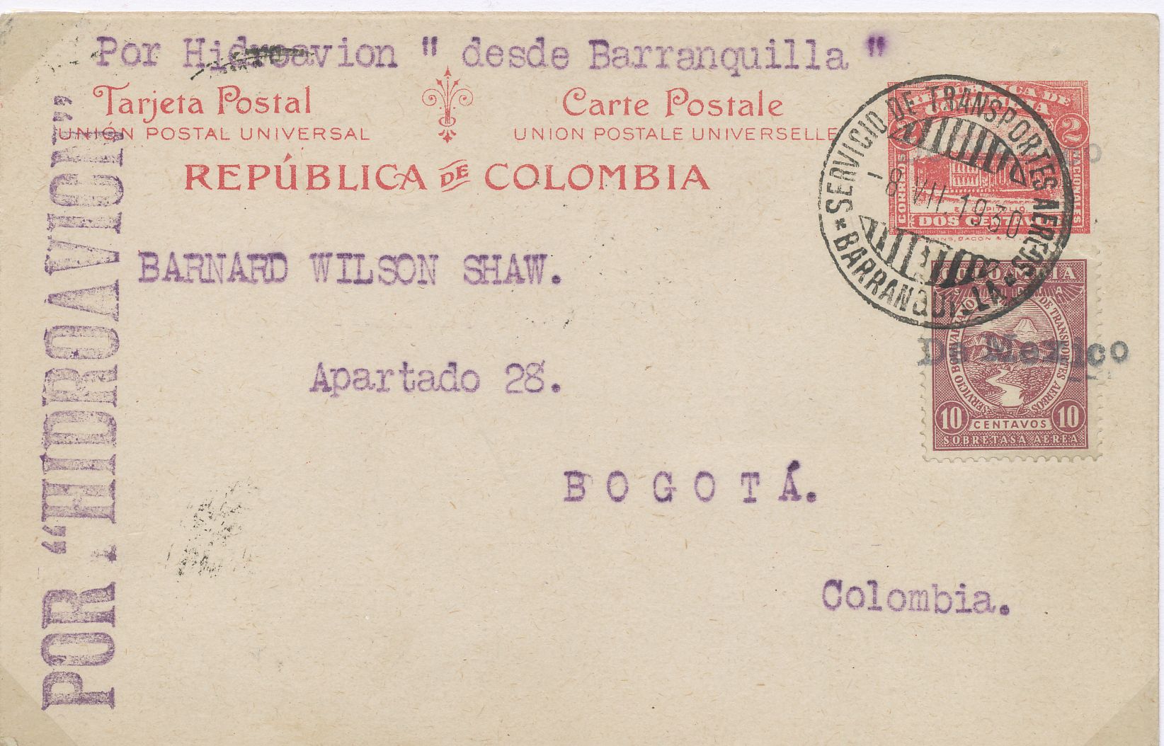 Tarjeta enviada por hidroavión desde Bogotá a Barranquilla.-