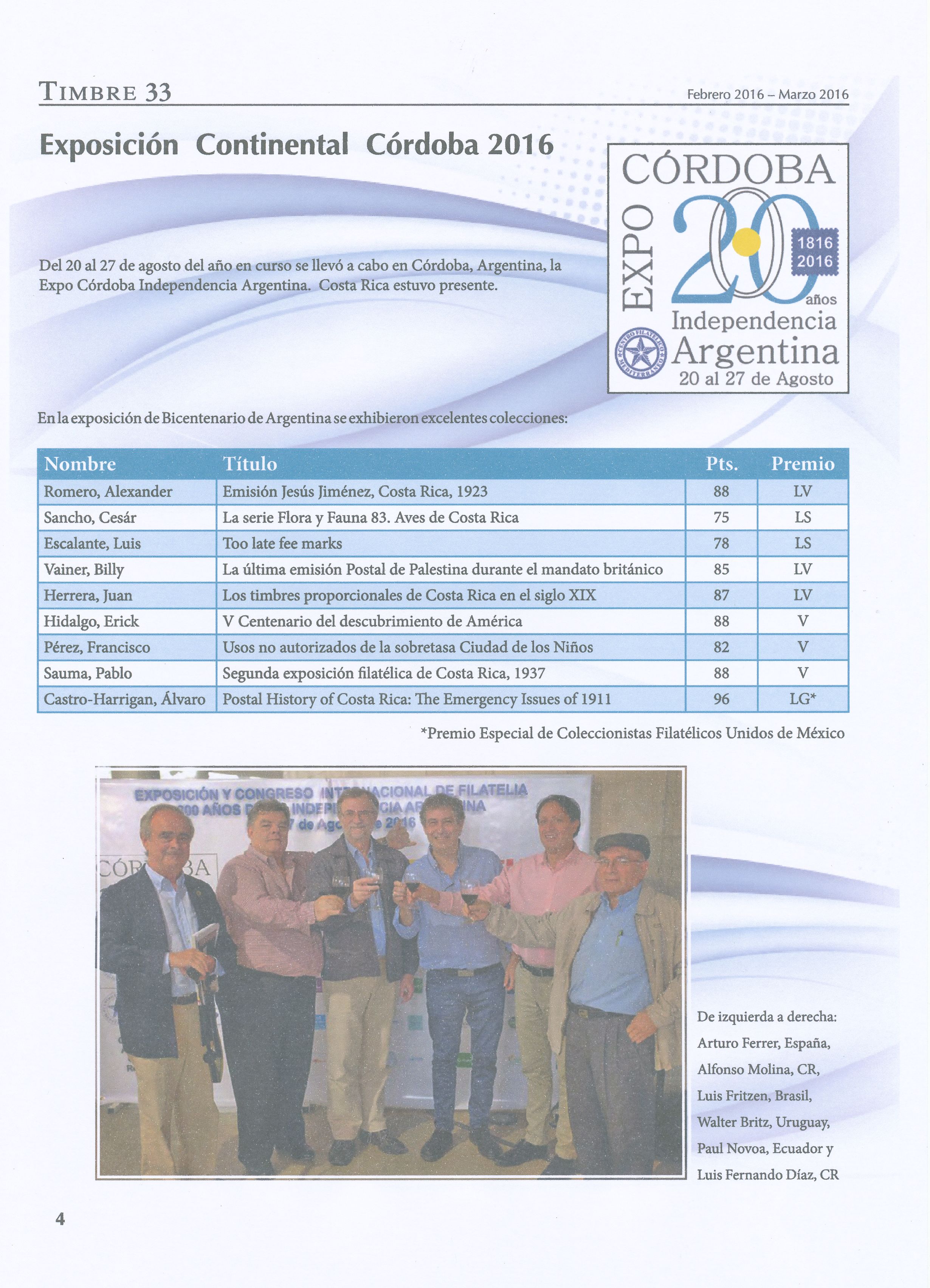 El jurado de la exposición compuesto por 13 destacados y prestigiosos filatelistas de la región tuvieron a su cargo la evaluación de más de 400 colecciones, que dio como resultado un excelente palmarés , en el cual sobresalen la alentadora cifra de 29 colecciones evaluadas con medallas de Oro Grande u Oro, muy significativo para este nivel de exposición. De los jueces nominados solo se ausento el Sr. Eliseo Rubén Otero, quien se encontraba convaleciente de una intervención quirúrgica. Podemos significar que el trabajo de los jueces se desarrolló en un ambiente de rigor, prudencia y absoluta familiaridad para lograr los objetivos propuestos.
