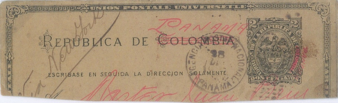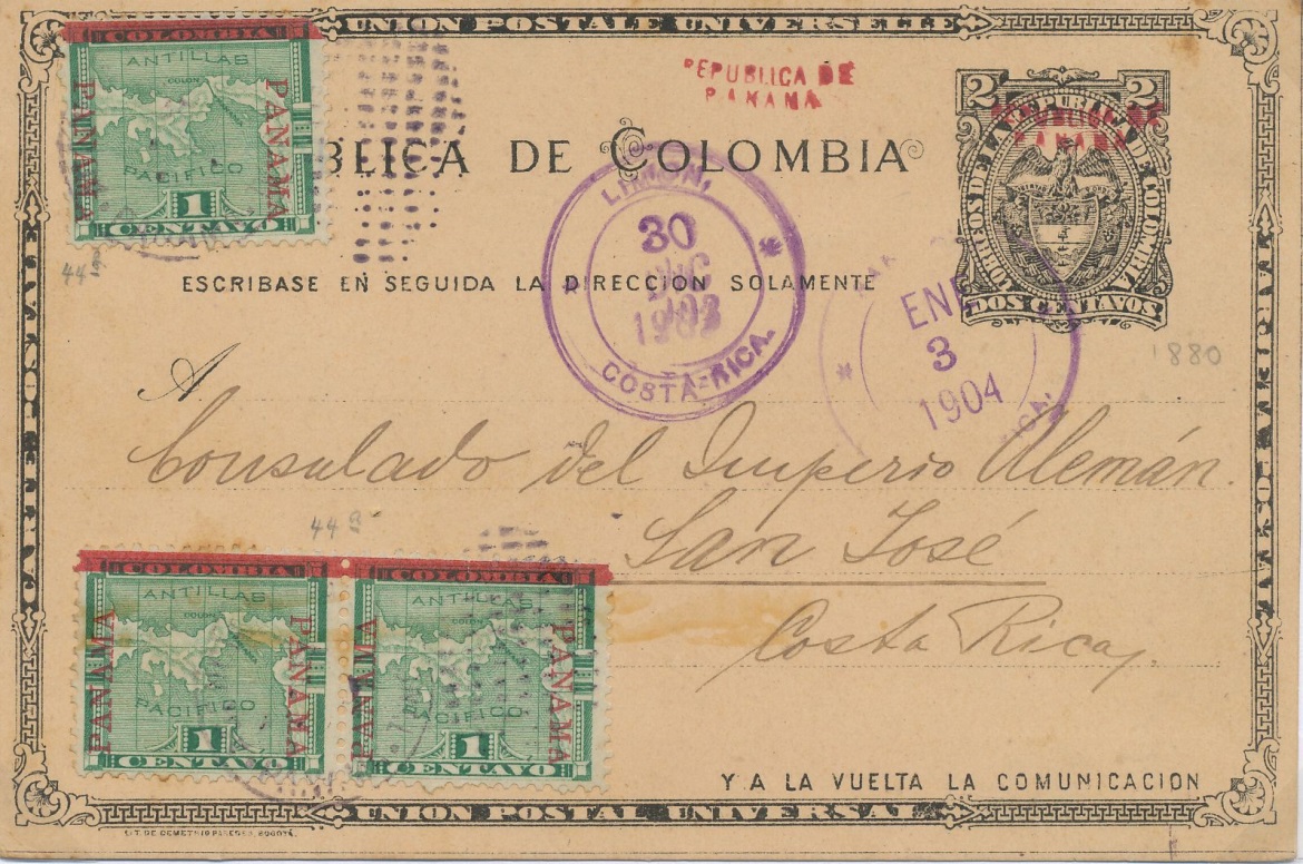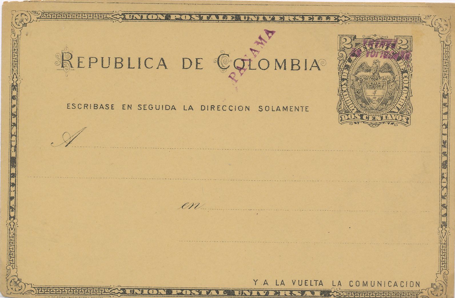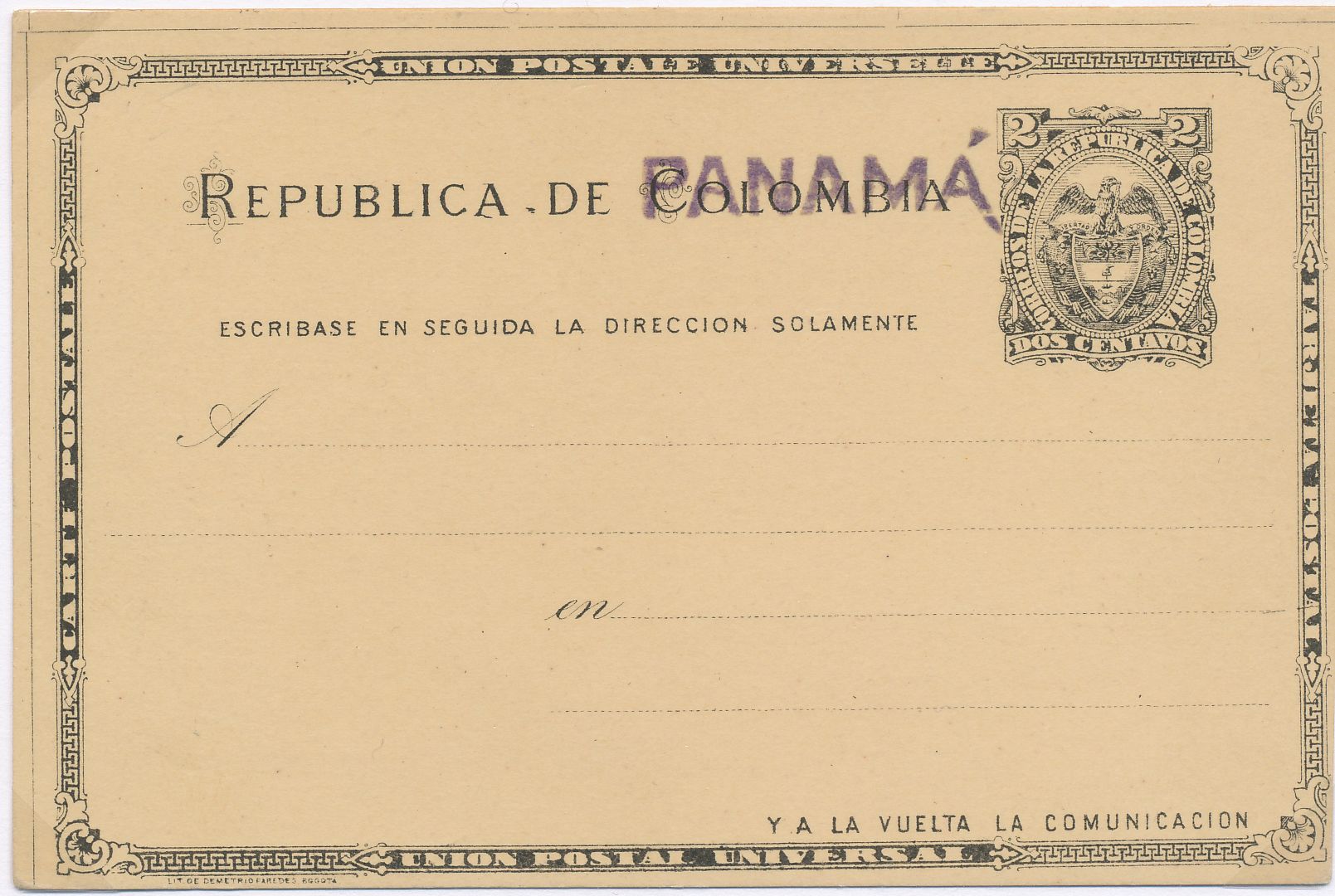 Hasta el año 1.904 no se imprimió el primer entero Panameño propiamente dicho,y durante un periodo, de aproximadamente un año se continuaron utilizando, los que ya se hallaban en el país (Colombianos) sobrecargados.-