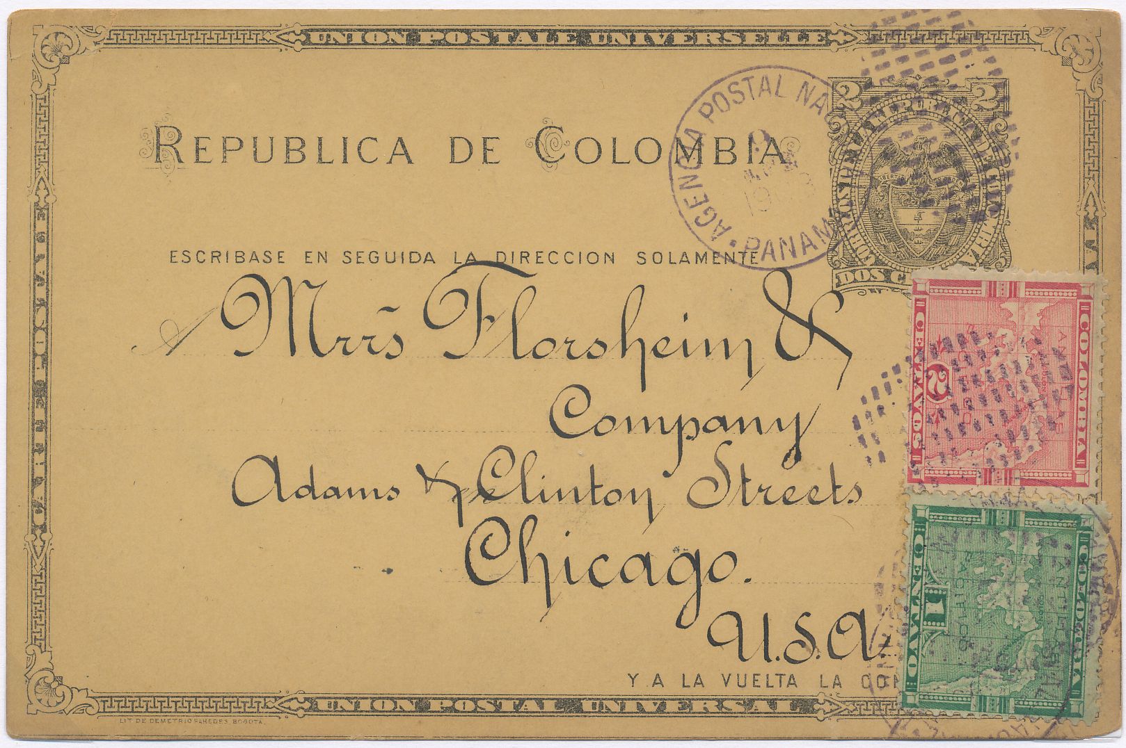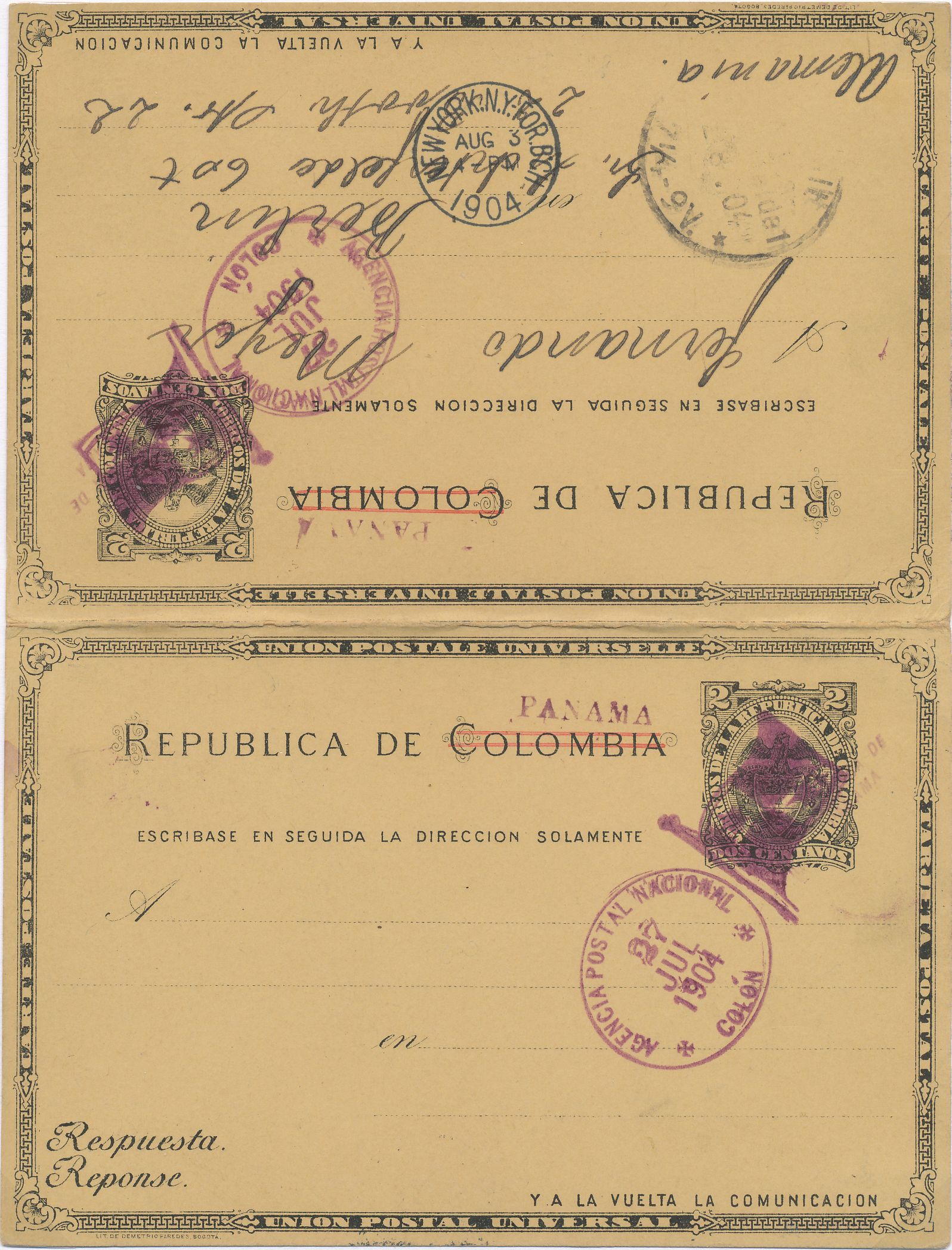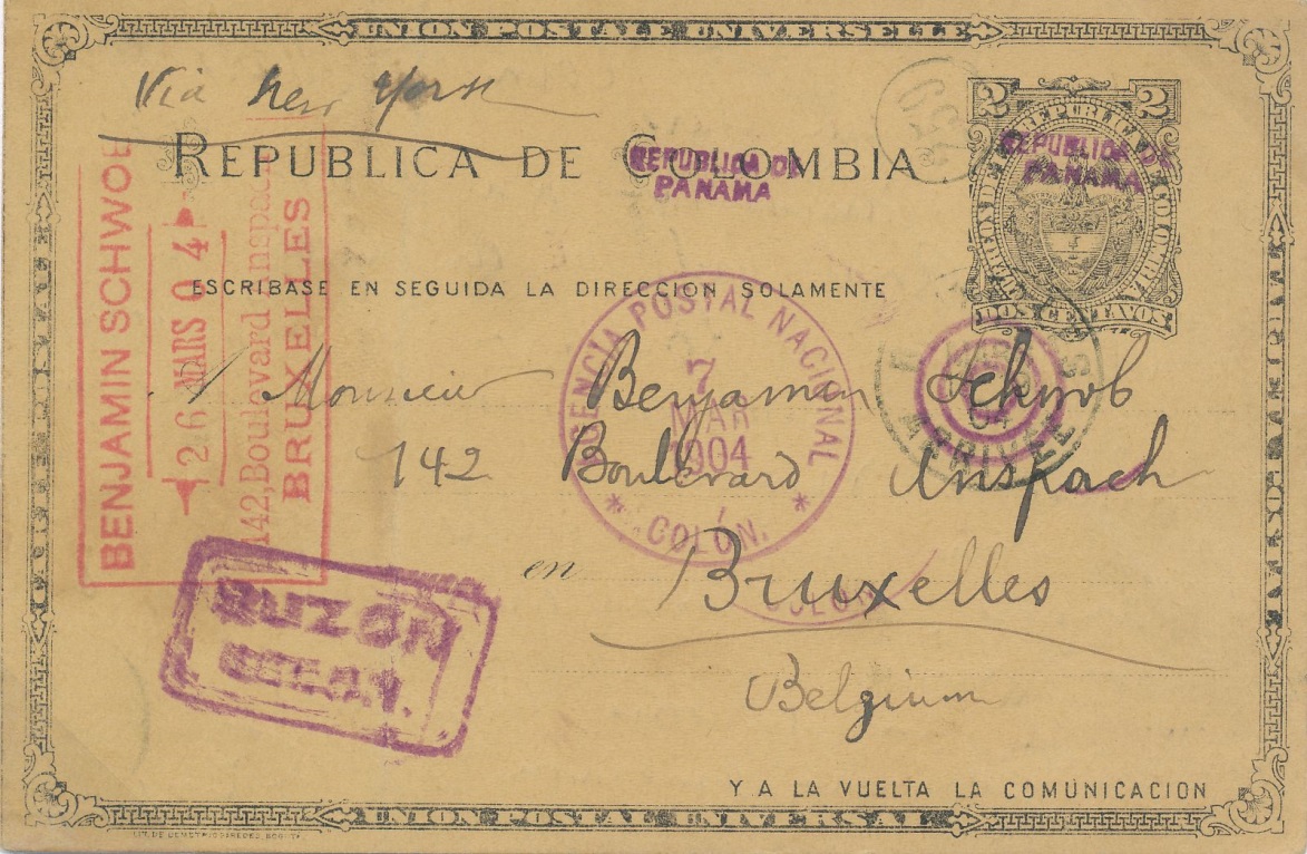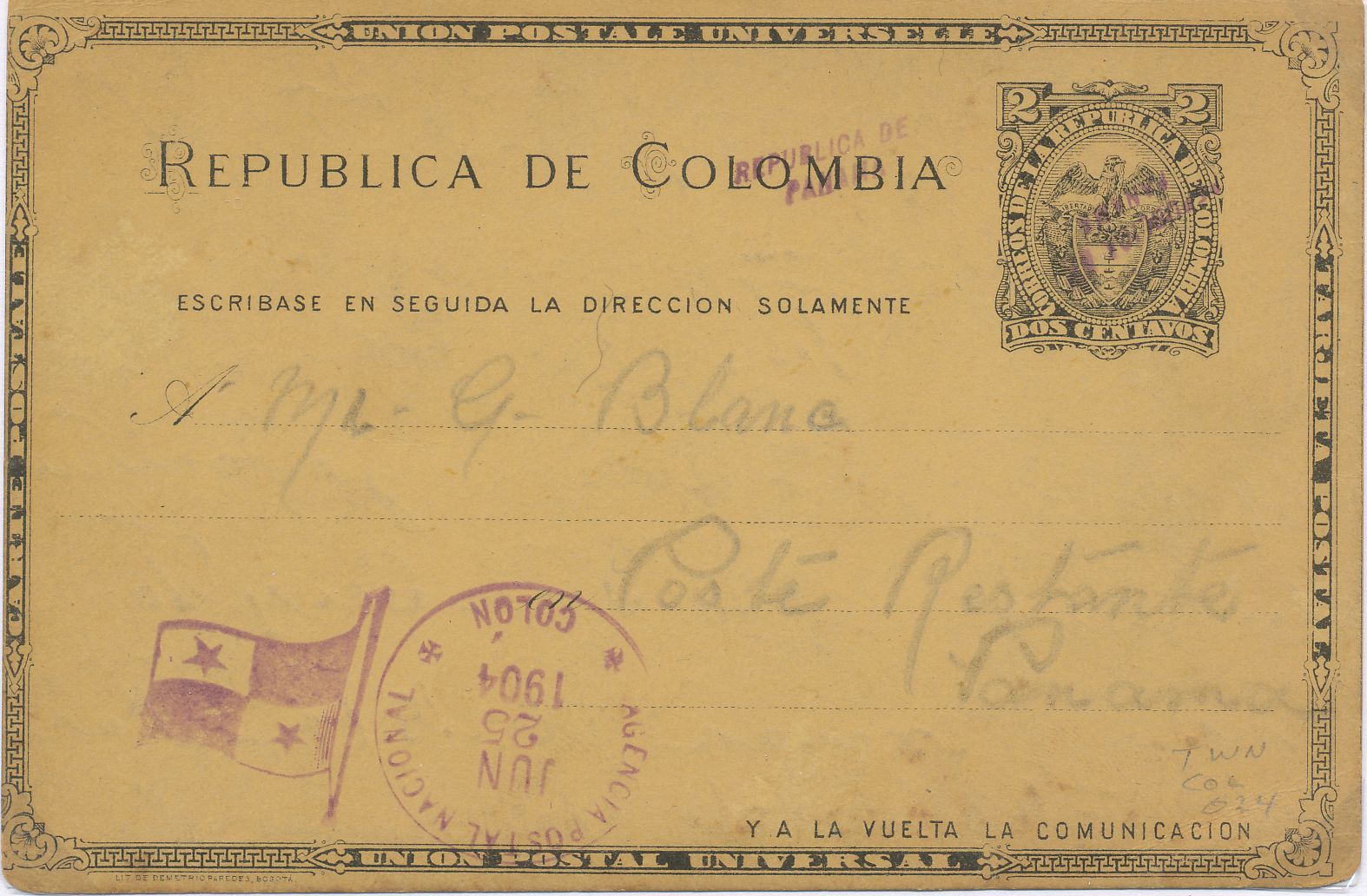 Hasta el año 1.904 no se imprimió el primer entero Panameño propiamente dicho,y durante un periodo, de aproximadamente un año se continuaron utilizando, los que ya se hallaban en el país (Colombianos) sobrecargados.-