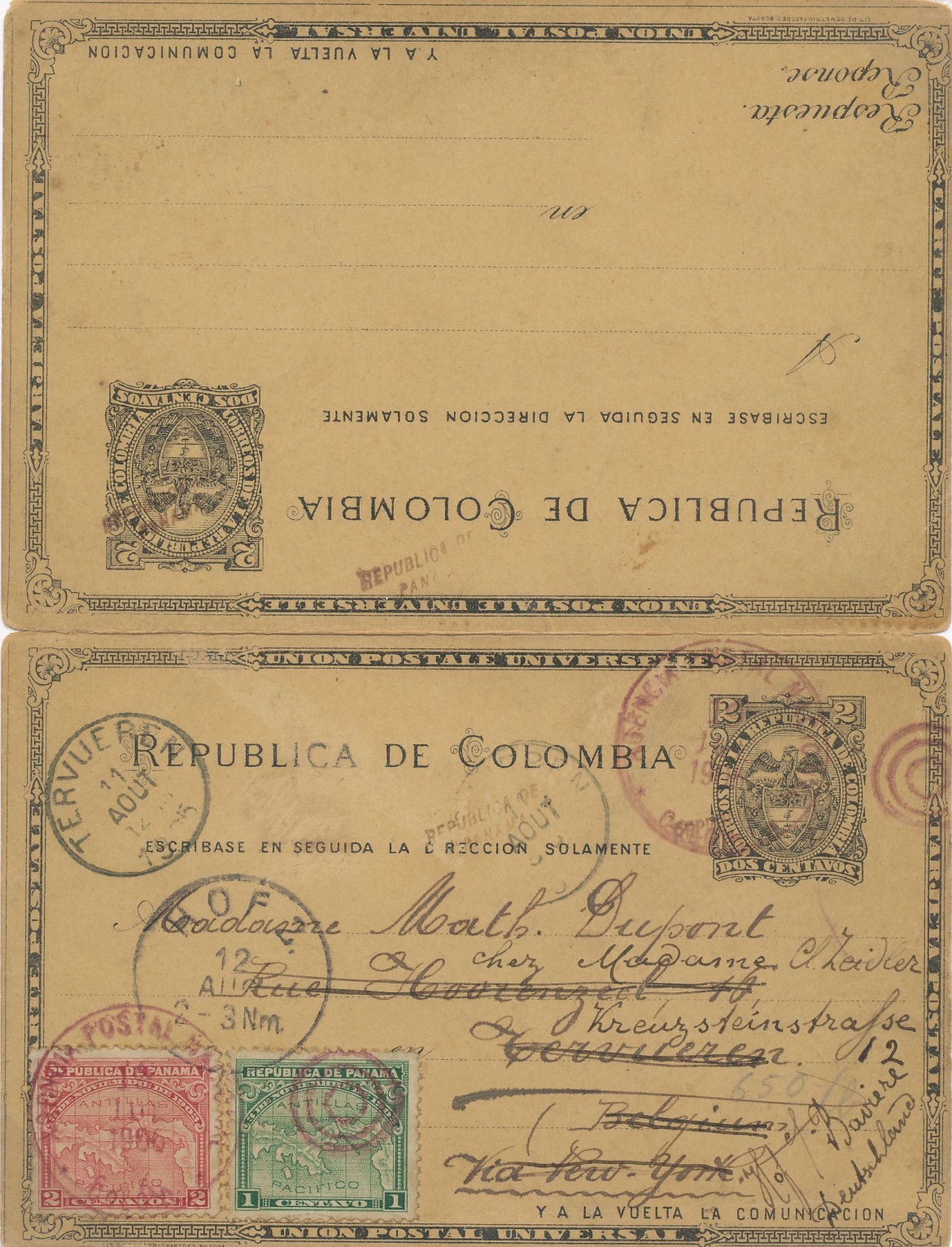 El presente fue dirigido desde la estafeta de Colon a Belgica,via NY, con sellos (ya Panameños) por importe de tres centavos, franqueo ordinario,tarjeta 1889,segunda emision.-