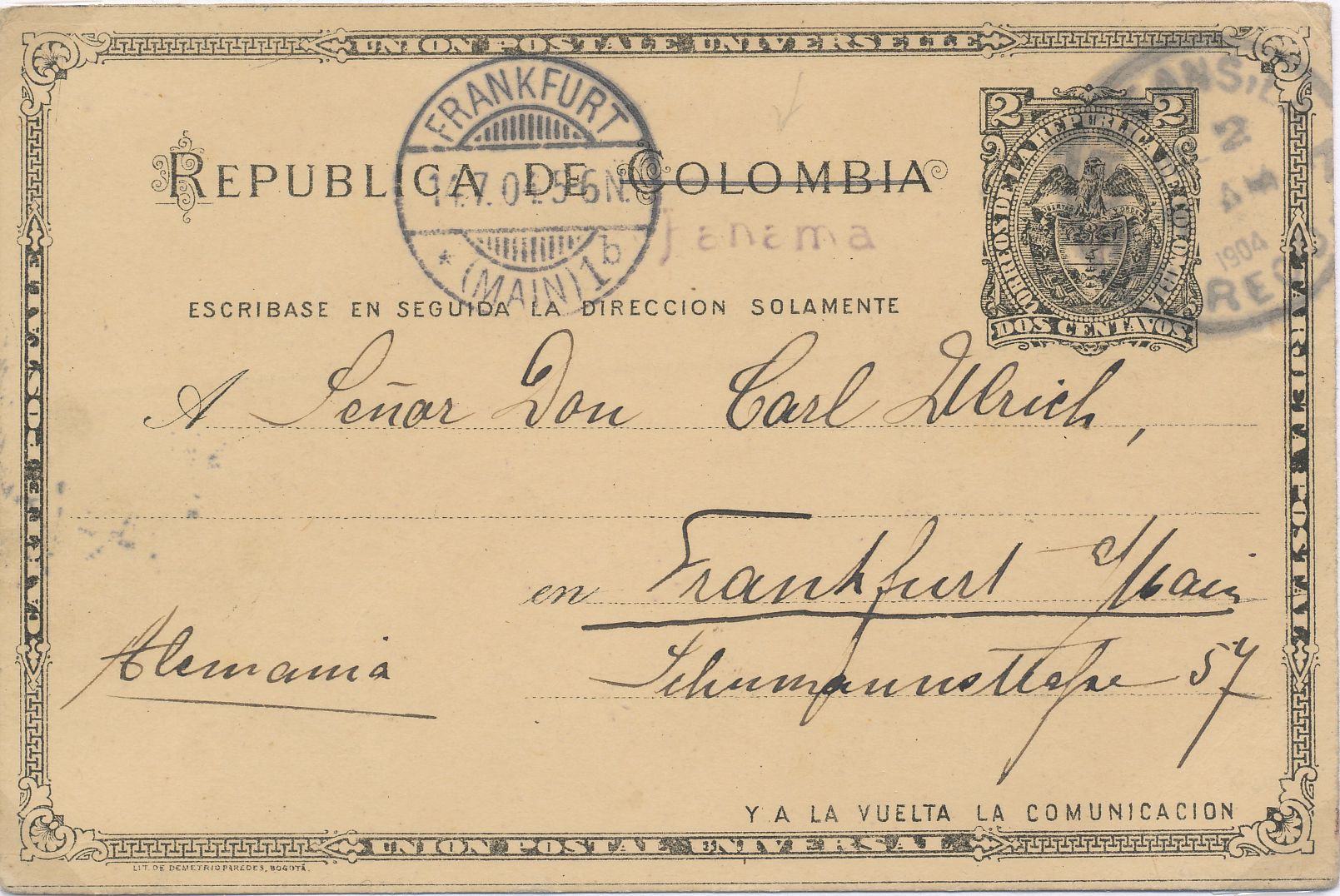 Tarjeta enviada a Alemania desde Boca del Toro, el año 1.904, la tarjeta corresponde a la emisión de 1.889.-