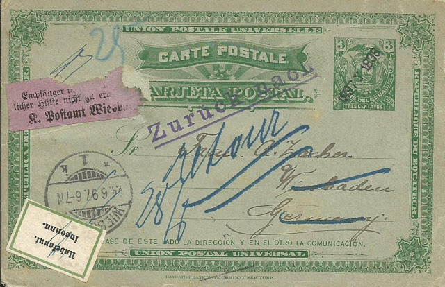 | 1897 Y 1898 on 1896 postal stationery card mailed to Wiesbaden where it arrived on June 6, 1897 and returned because of unknown addressee |