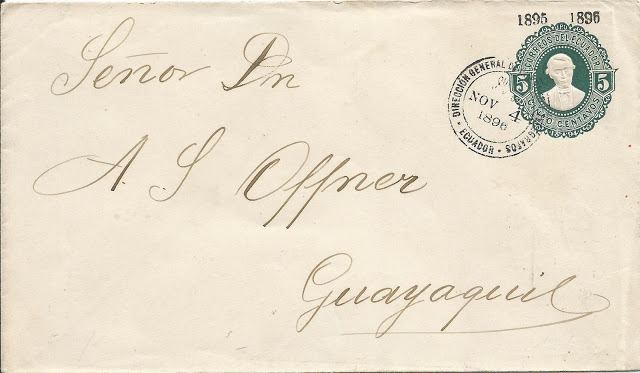 Even though no official documentation is known for the application of surcharges on postal stationery there exist two differente surcharges, one extendig the validity of the postal material for a bienium and the second for devaluating the 10 centavos envelopes to 5 centavos. This article es concerned only with the first surcharge which, again, falls into two categories: an 1895-1896 extension of validity of the 1894 Rocafuerte envelopes and a 1897-1898 extension of the 1894 and 1896 Seebeck post card and the 1894 Rocafuerte envelopes.