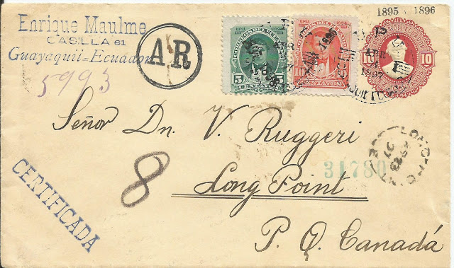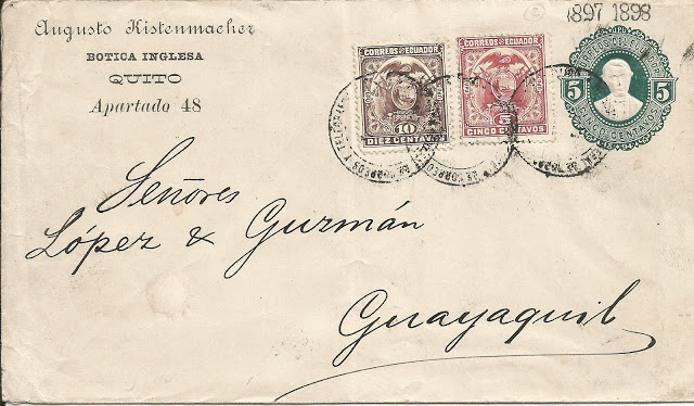 | 1897-1898 large numbers on 1894 postal stationery envelope with stamps added, mailed from Quito to Guayaquil |