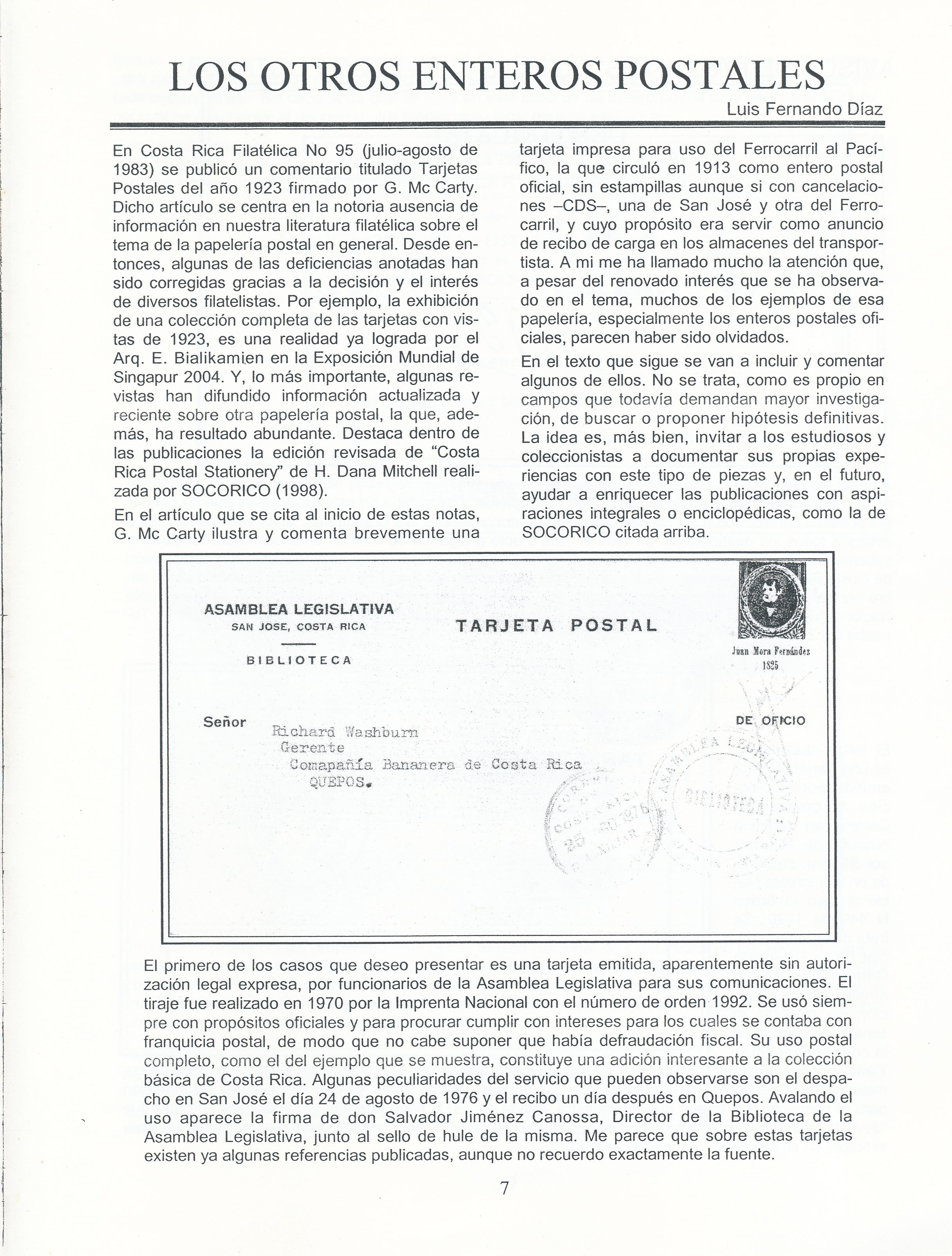 Luis Fernando Díaz, es quizás una de las personas más conocidas y queridas del mundo filatélico americano. Académico de la Real academia Hispánica de filatelia e historia postal juez FIP; FIAF, y con innumerables cargos en distintas asociaciones filatélicas. Repasando los números de “Costa Rica Filatélica” veo este excelente artículo suyo publicado en el Numero 111 correspondiente a diciembre del año 2004… Gracias nuestro muy querido amigo enteropostalista.-