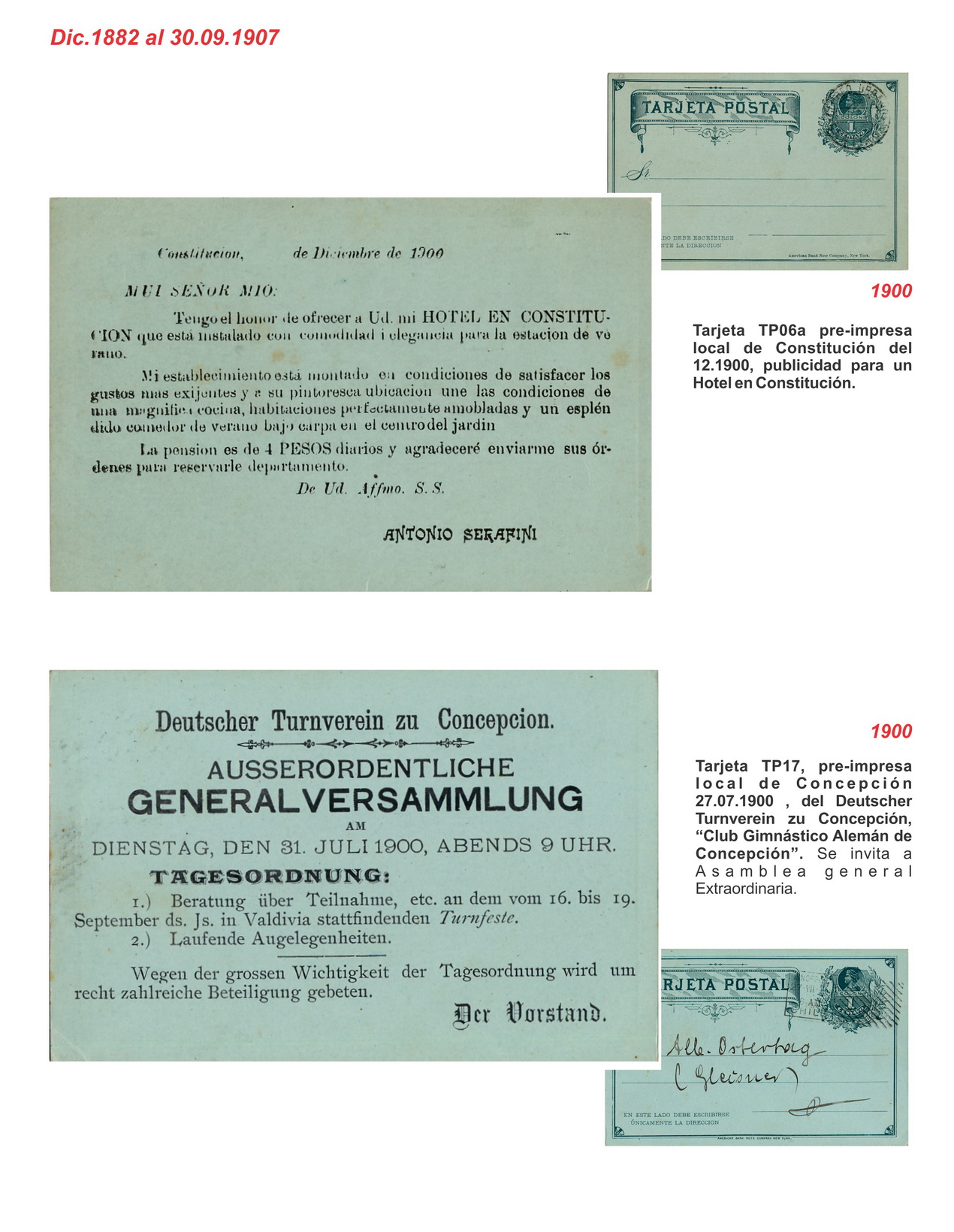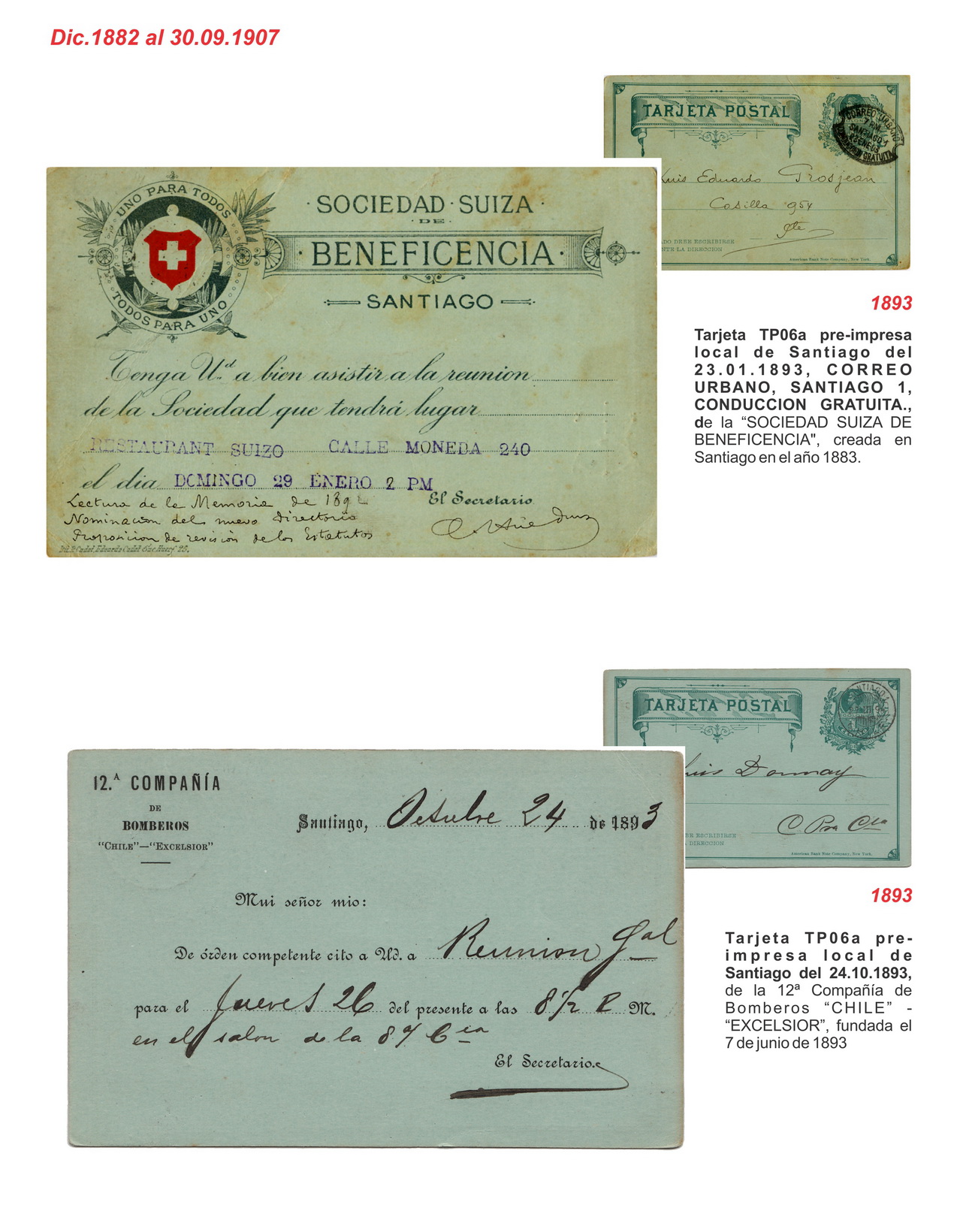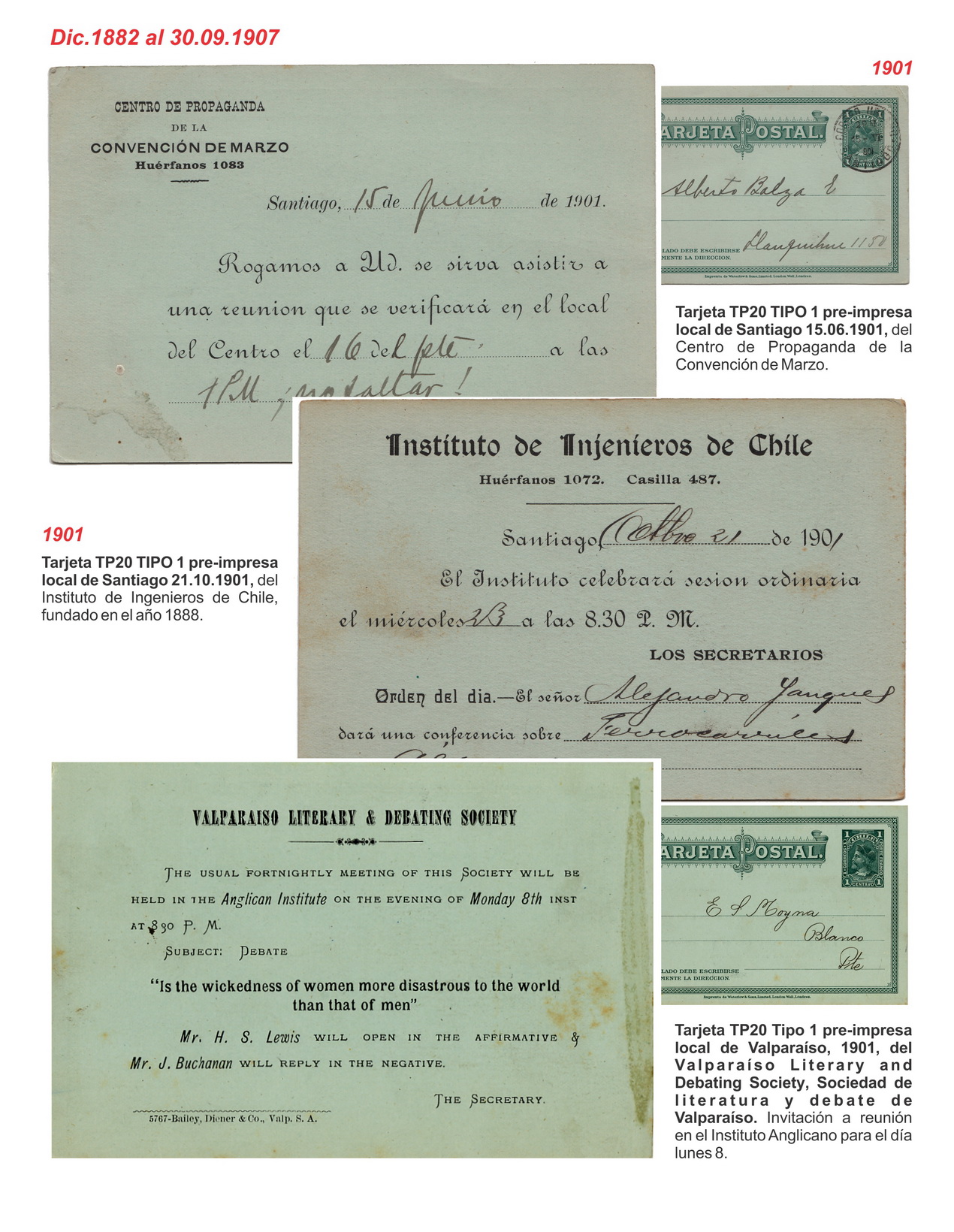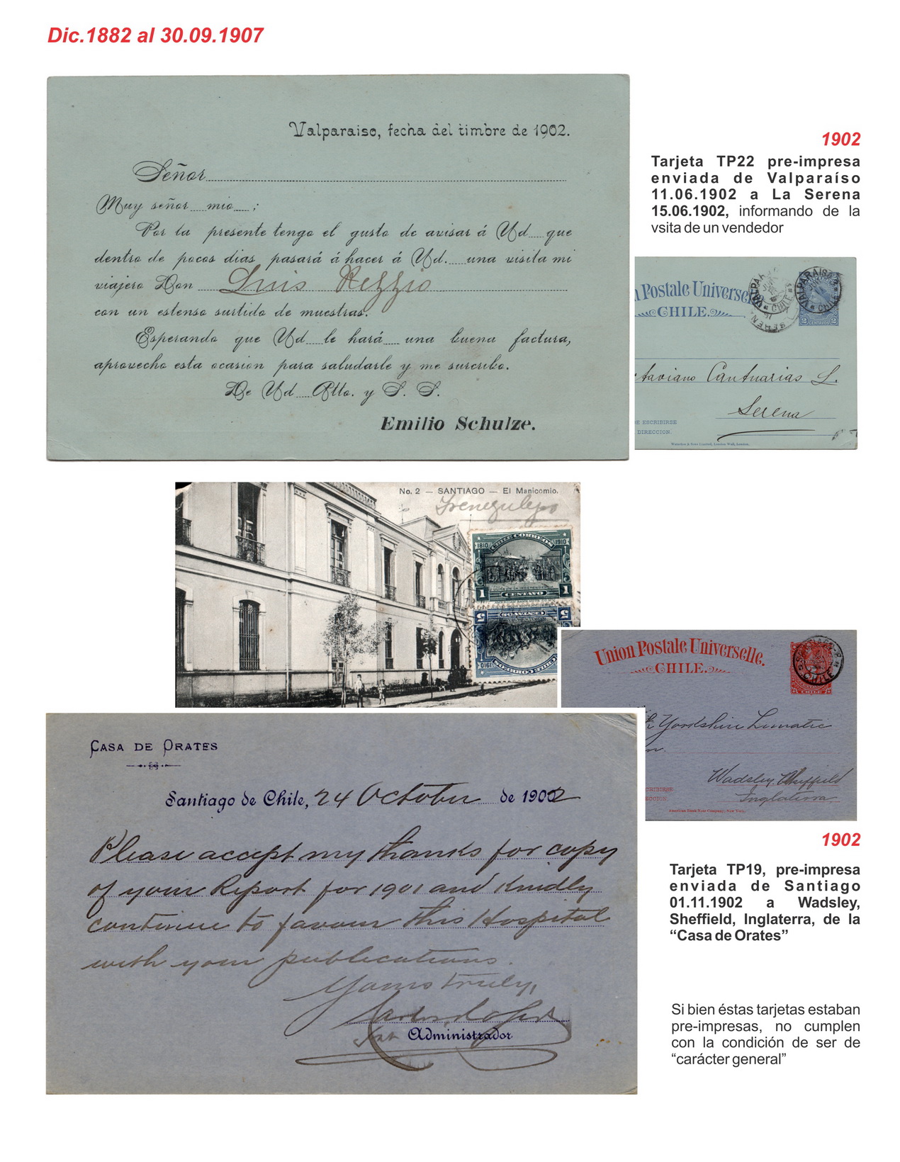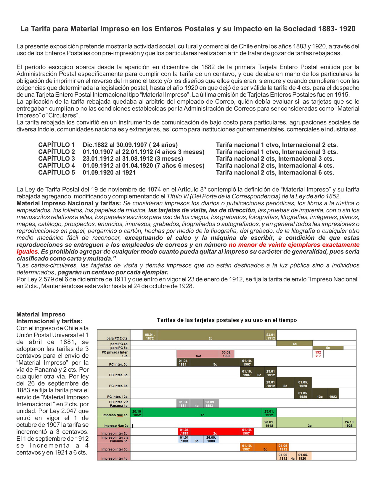 La presente exposición pretende mostrar la actividad social, cultural y comercial de Chile entre los años 1882 y 1920, a través del uso de los Enteros Postales con pre-impresión y que los particulares realizaban a fin de tratar de gozar de tarifas rebajadas.
