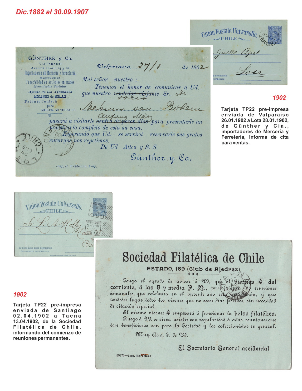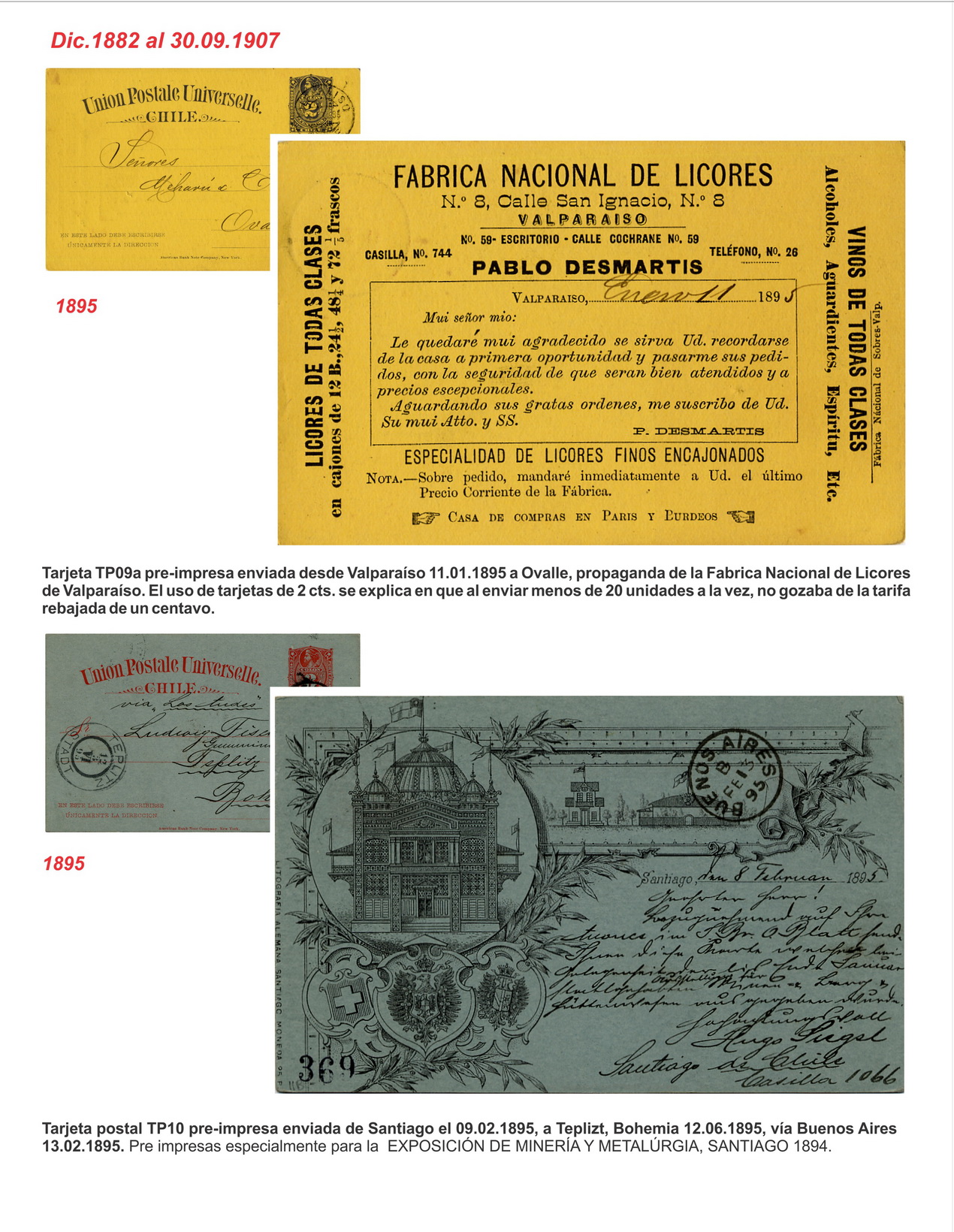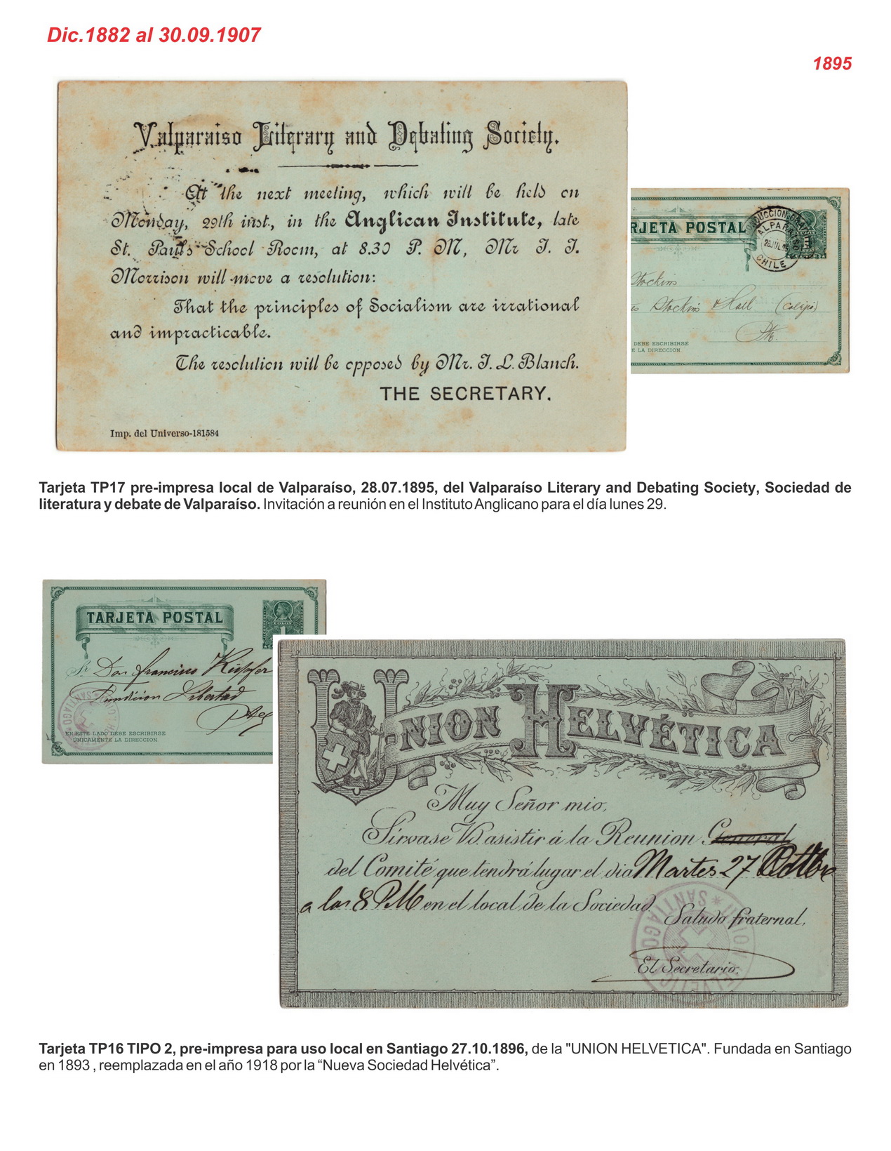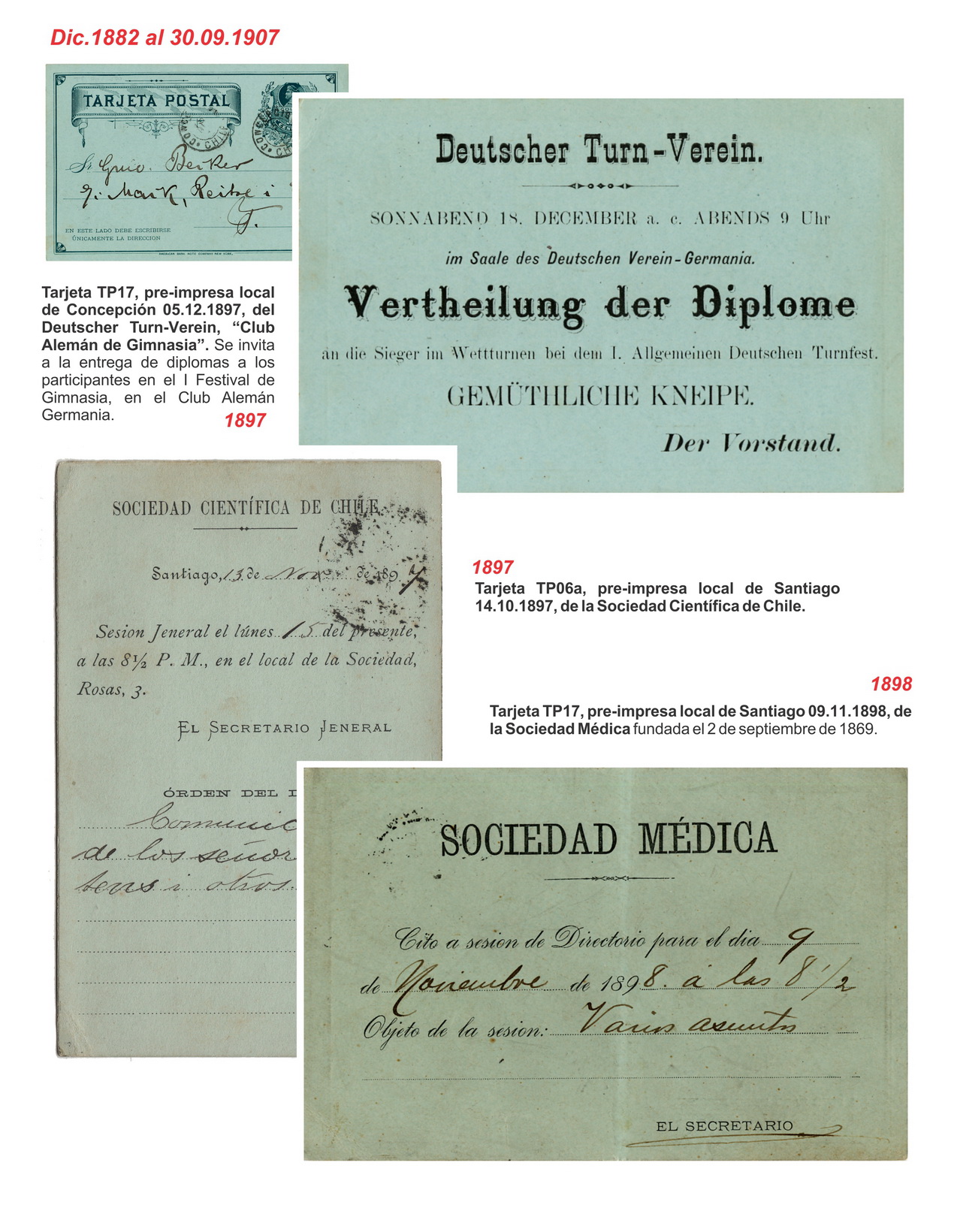 La presente exposición pretende mostrar la actividad social, cultural y comercial de Chile entre los años 1882 y 1920, a través del uso de los Enteros Postales con pre-impresión y que los particulares realizaban a fin de tratar de gozar de tarifas rebajadas.