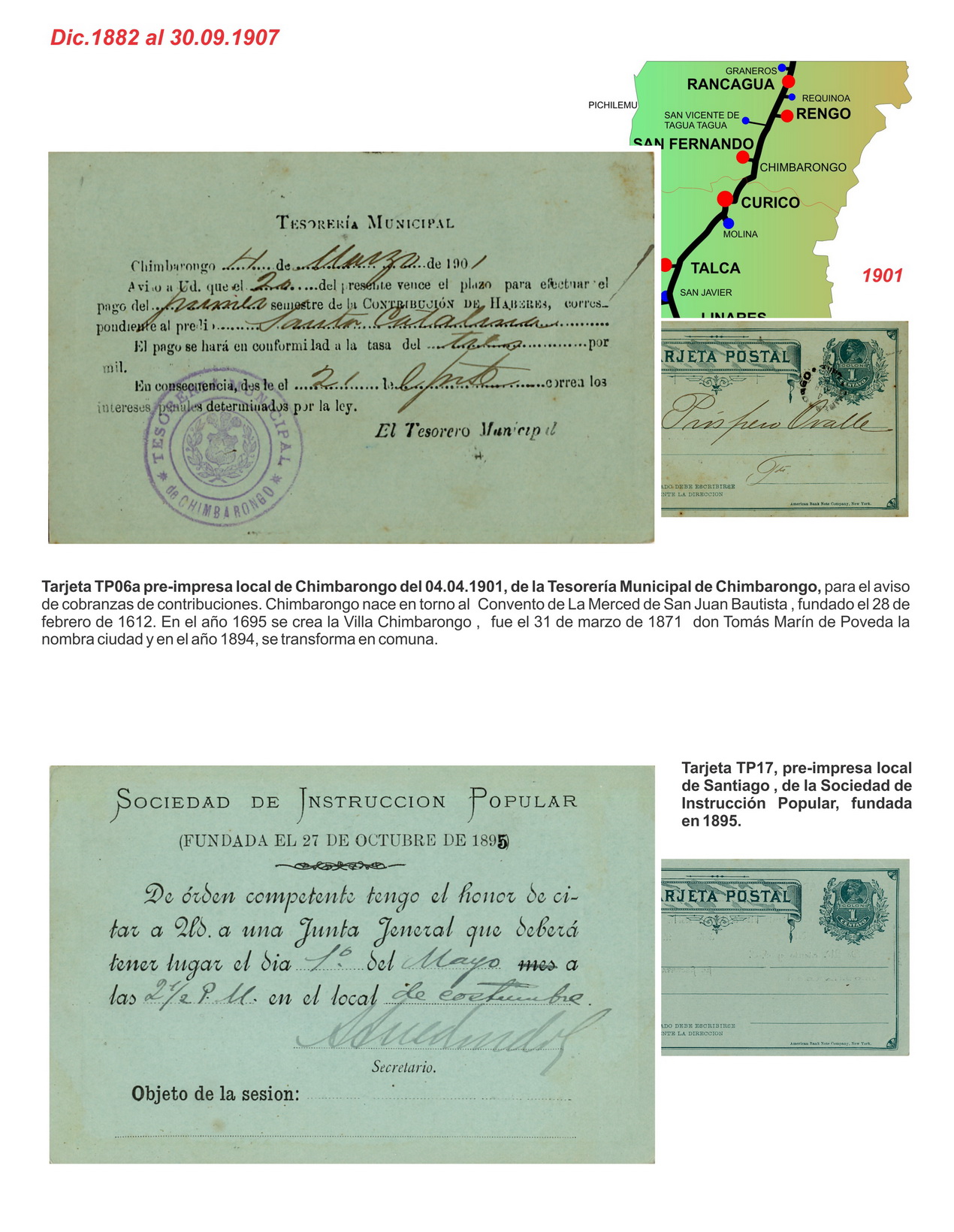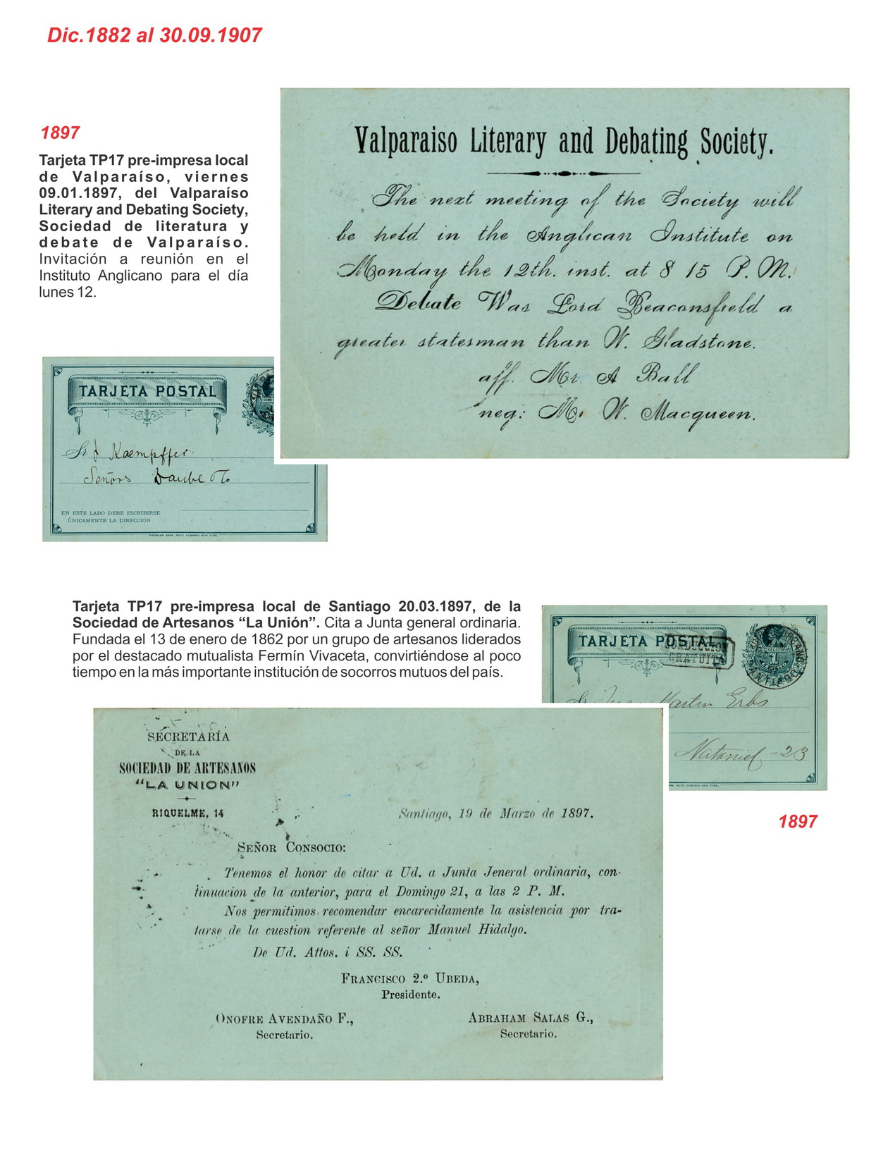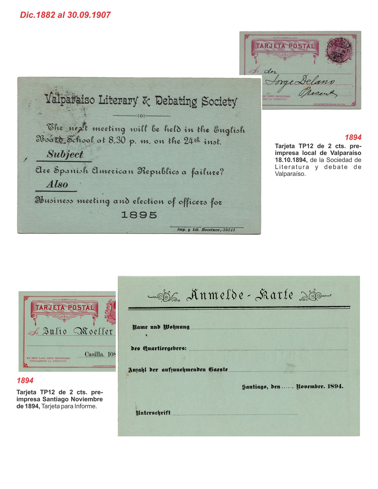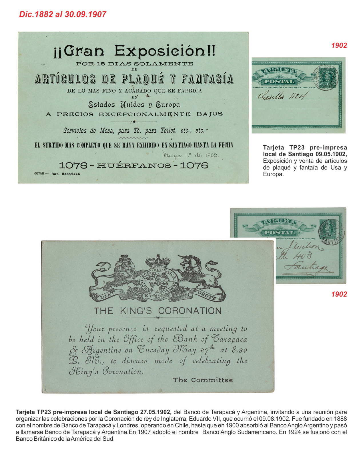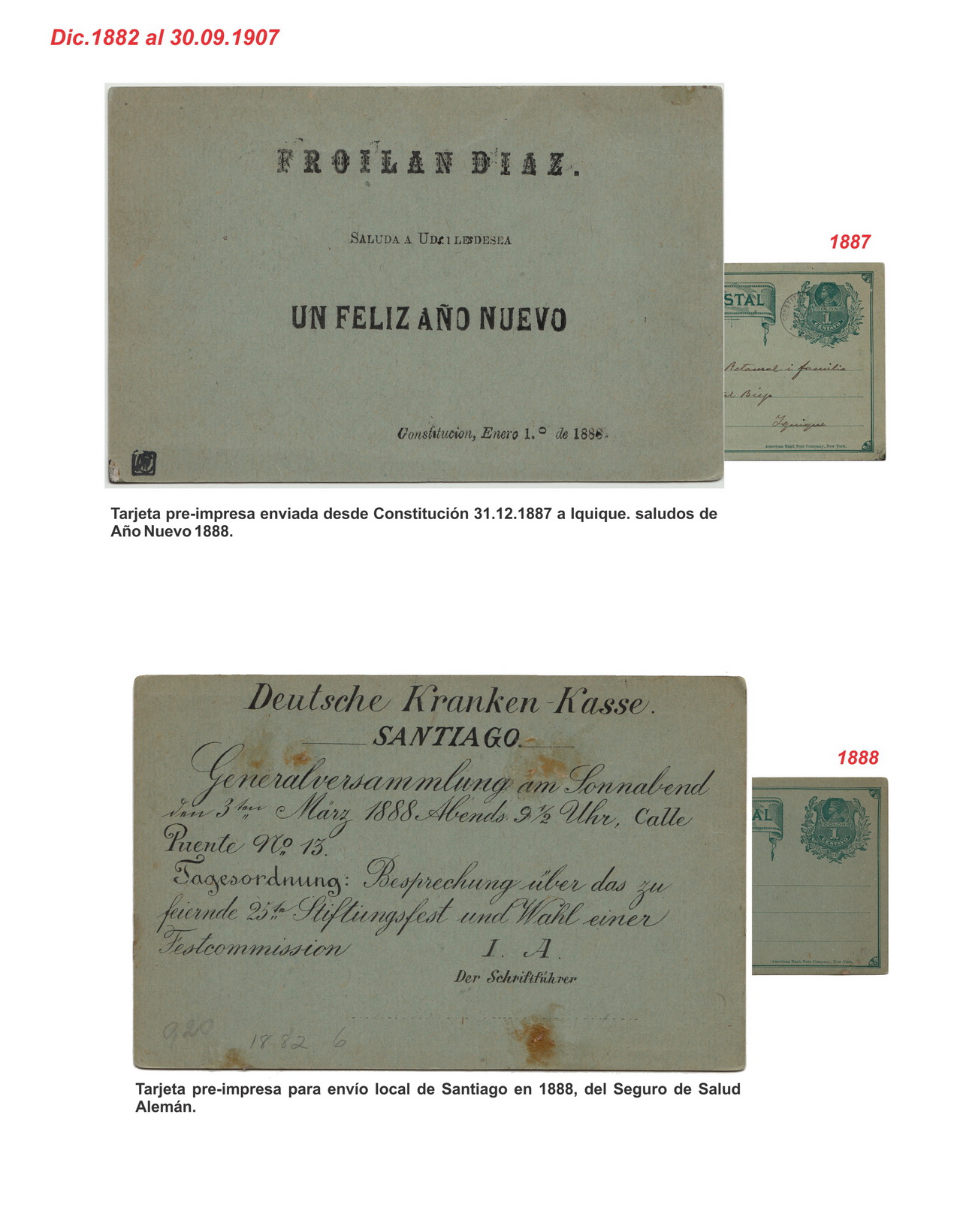 La presente exposición pretende mostrar la actividad social, cultural y comercial de Chile entre los años 1882 y 1920, a través del uso de los Enteros Postales con pre-impresión y que los particulares realizaban a fin de tratar de gozar de tarifas rebajadas.