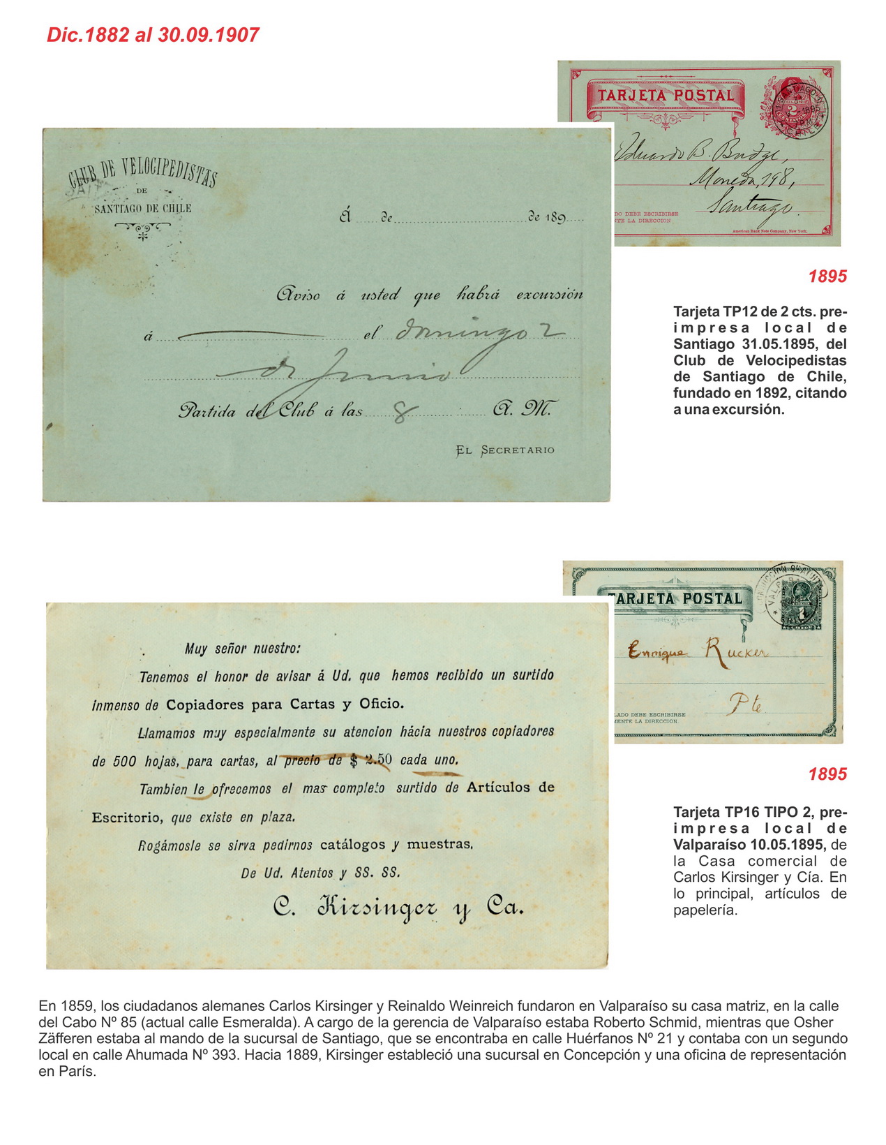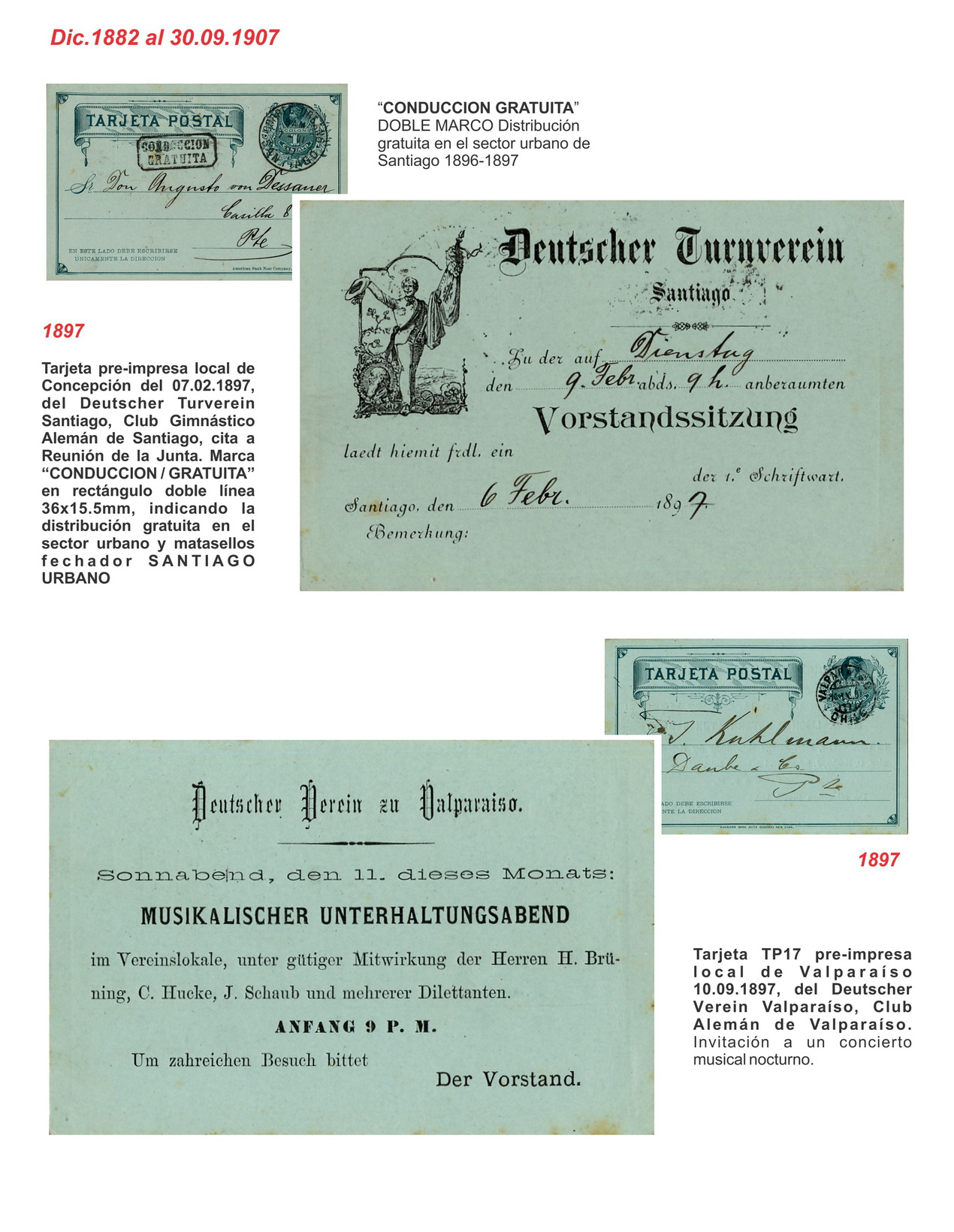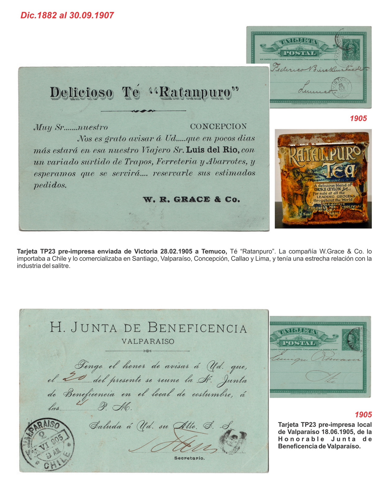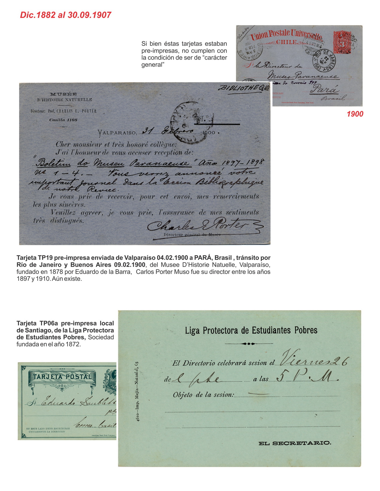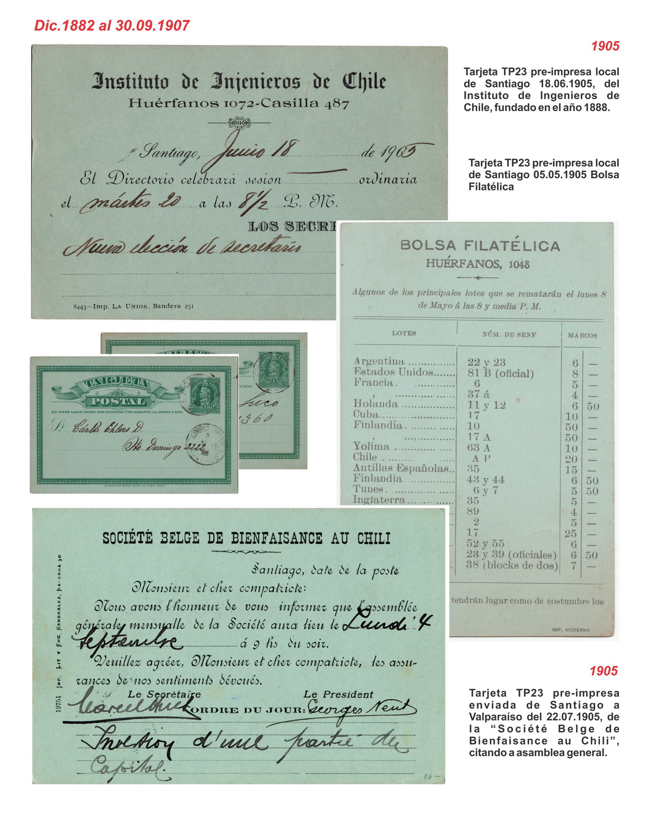 La presente exposición pretende mostrar la actividad social, cultural y comercial de Chile entre los años 1882 y 1920, a través del uso de los Enteros Postales con pre-impresión y que los particulares realizaban a fin de tratar de gozar de tarifas rebajadas.