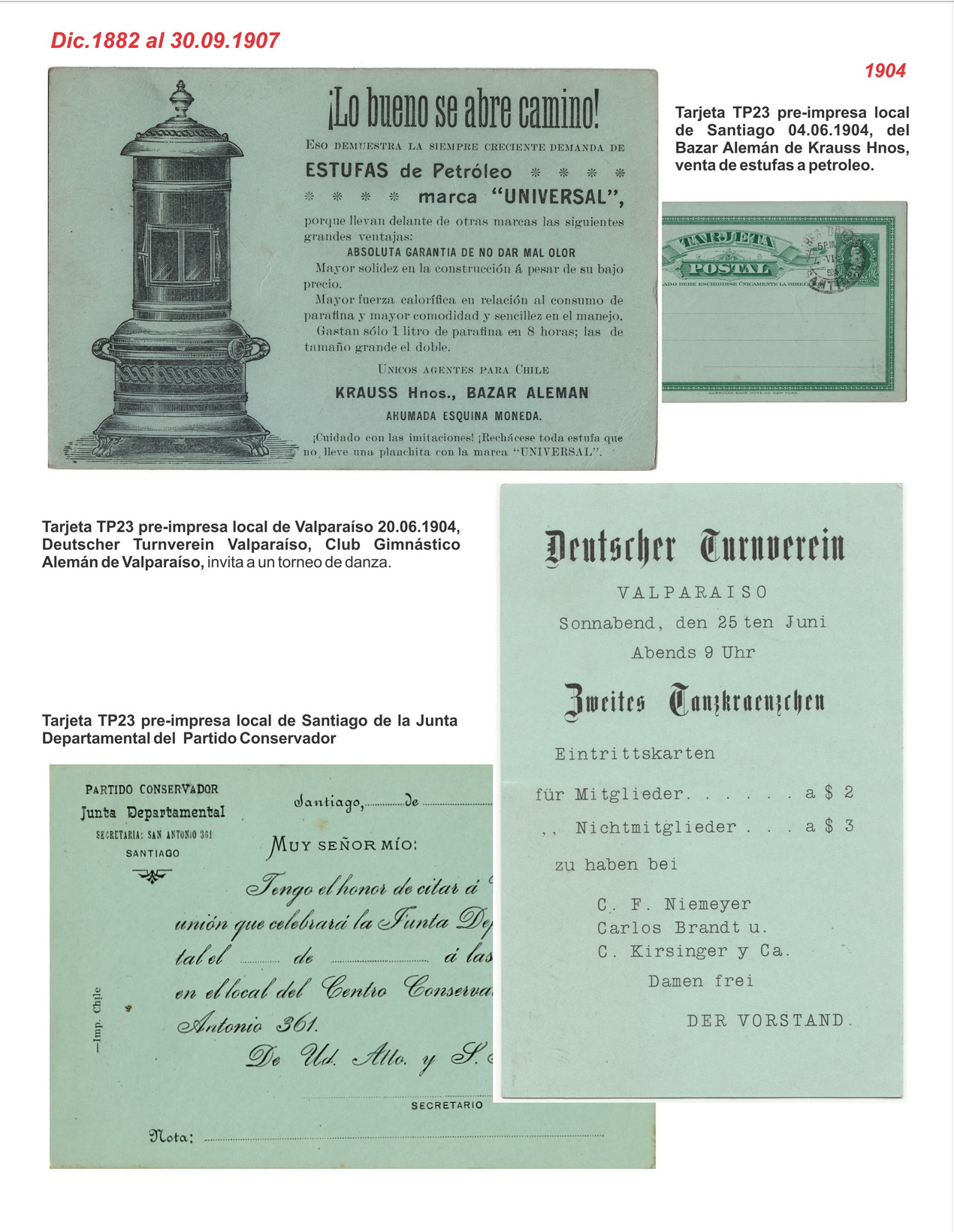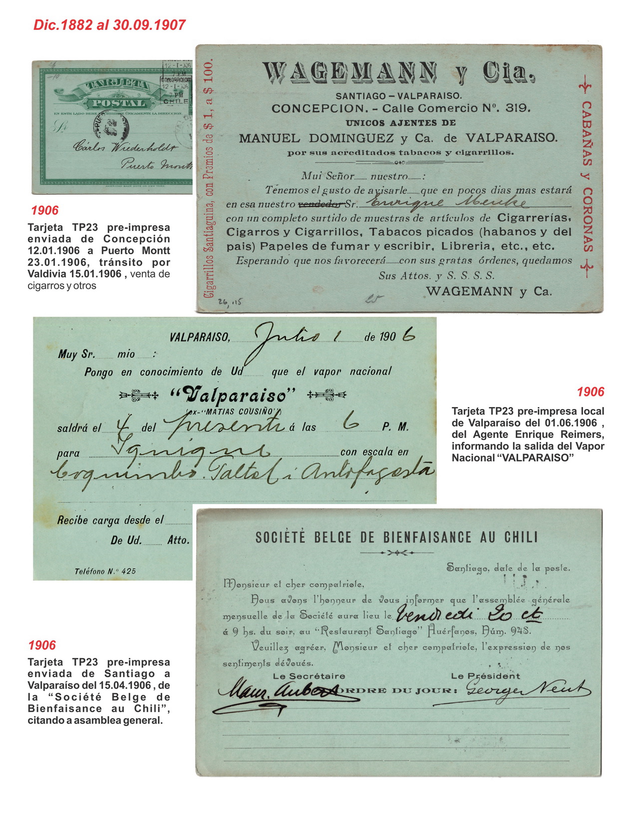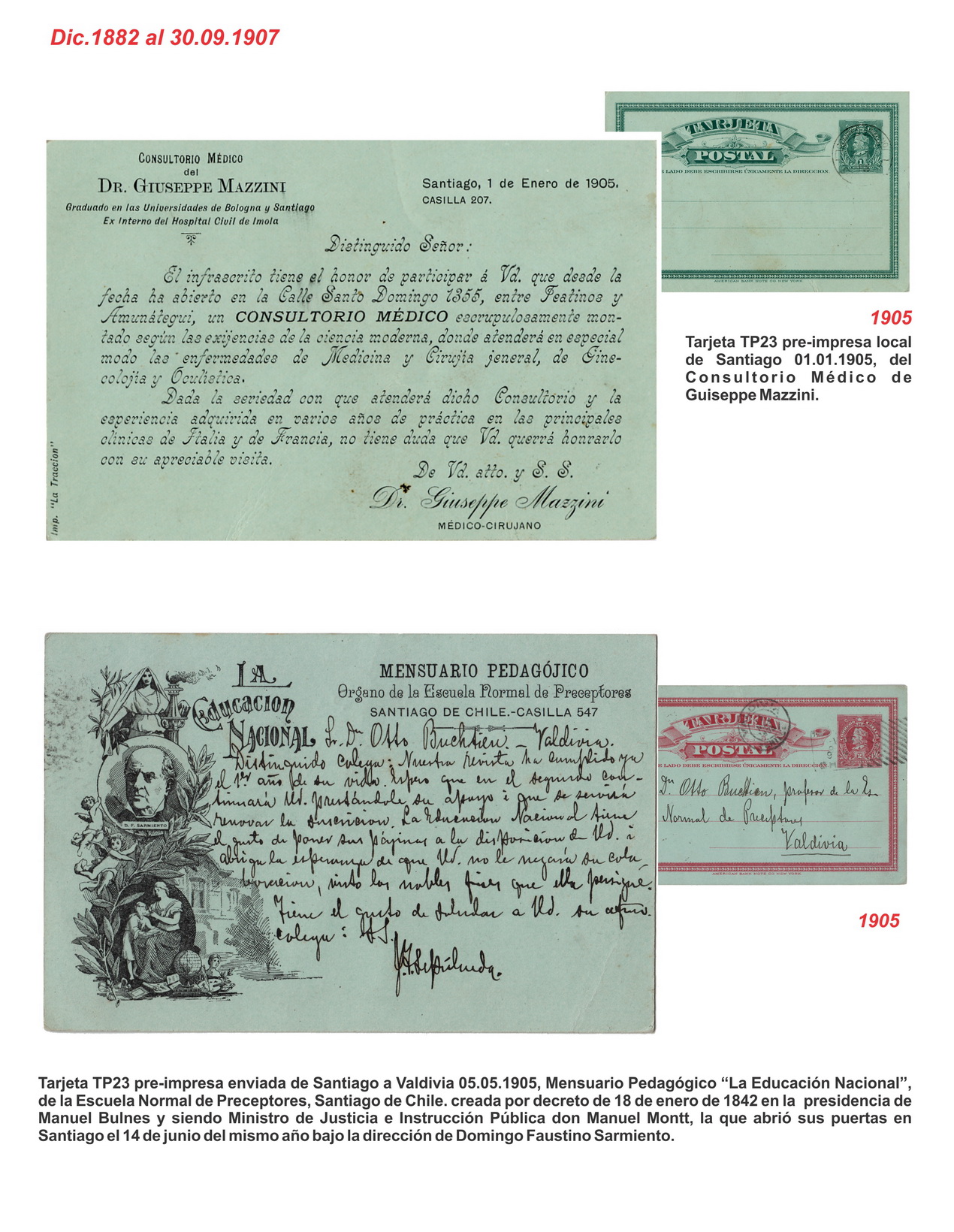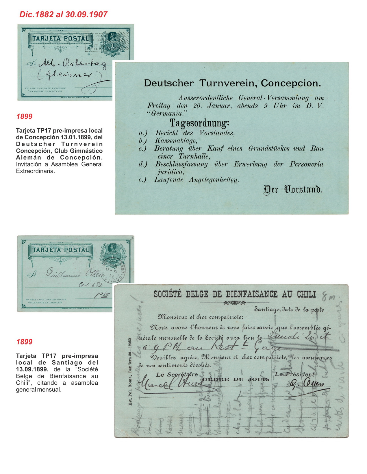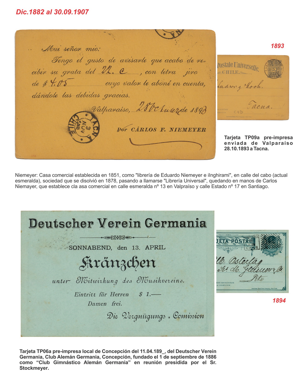 La presente exposición pretende mostrar la actividad social, cultural y comercial de Chile entre los años 1882 y 1920, a través del uso de los Enteros Postales con pre-impresión y que los particulares realizaban a fin de tratar de gozar de tarifas rebajadas.