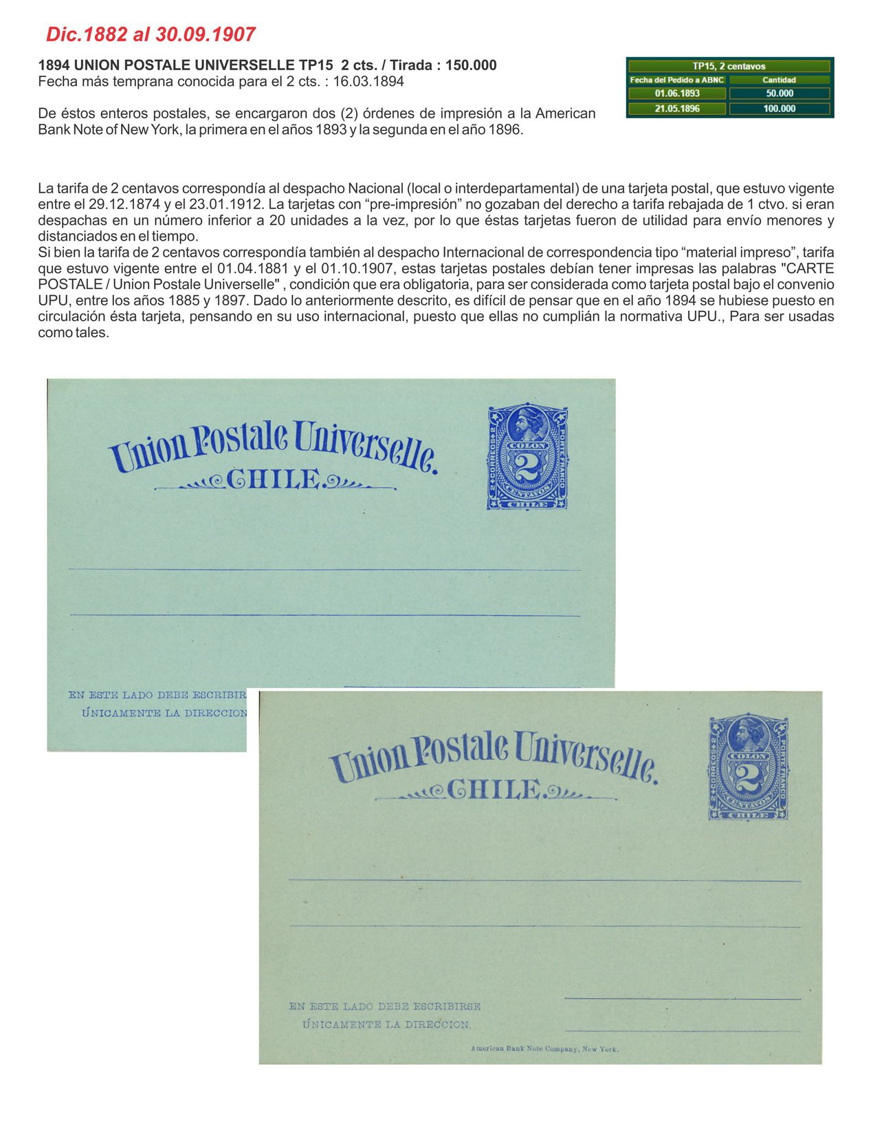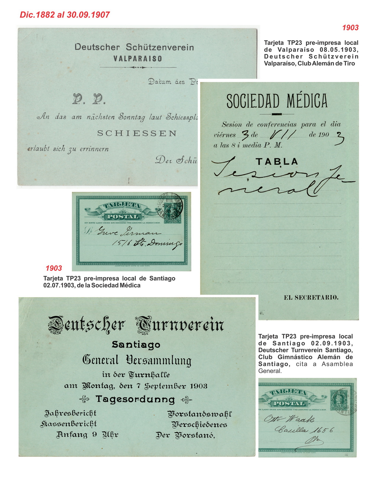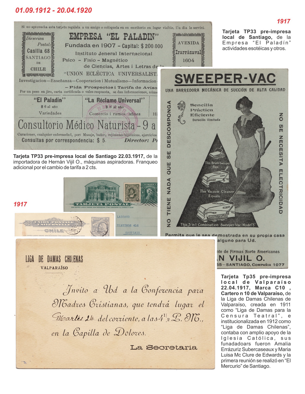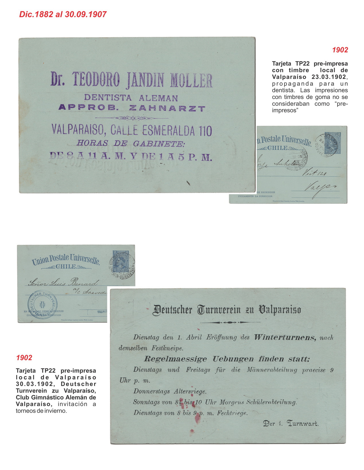 La presente exposición pretende mostrar la actividad social, cultural y comercial de Chile entre los años 1882 y 1920, a través del uso de los Enteros Postales con pre-impresión y que los particulares realizaban a fin de tratar de gozar de tarifas rebajadas.