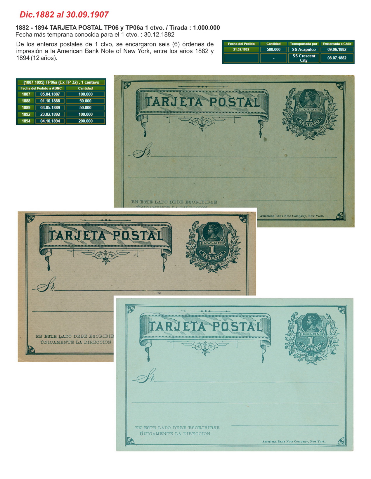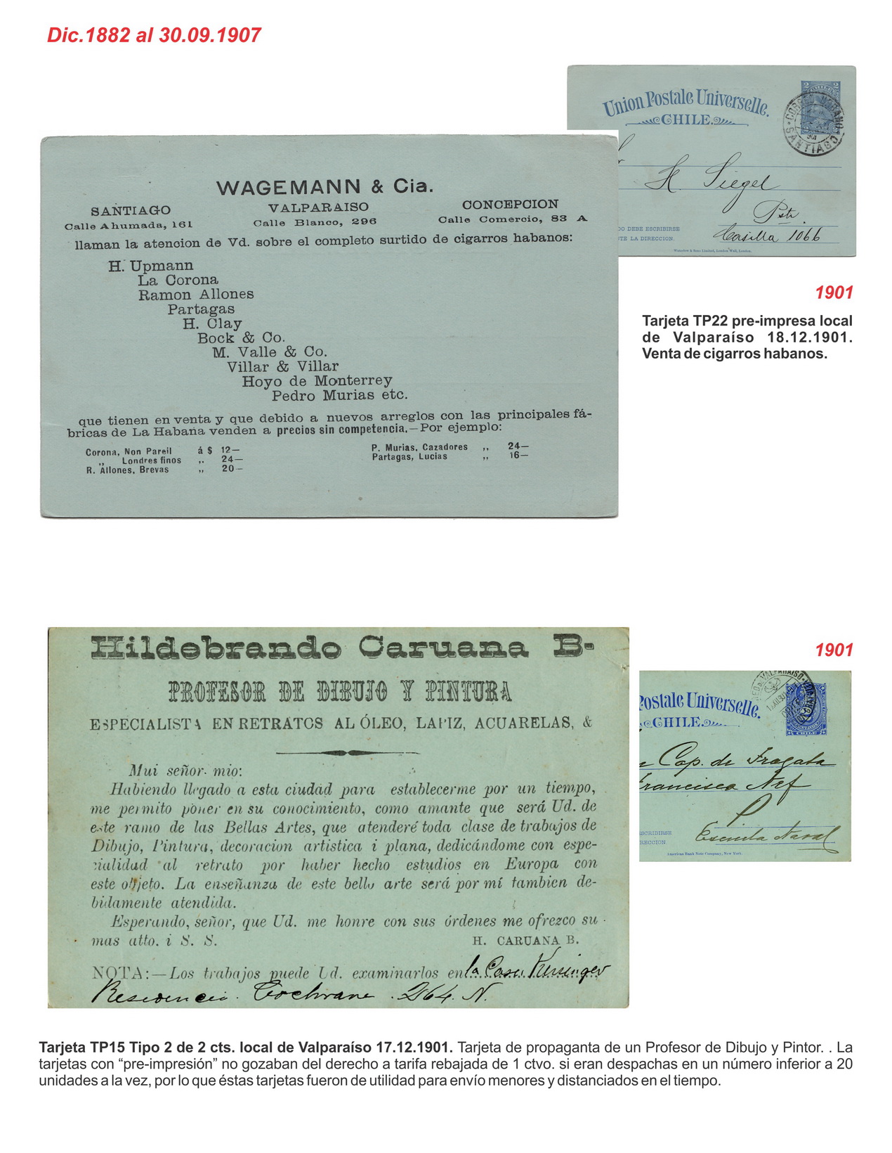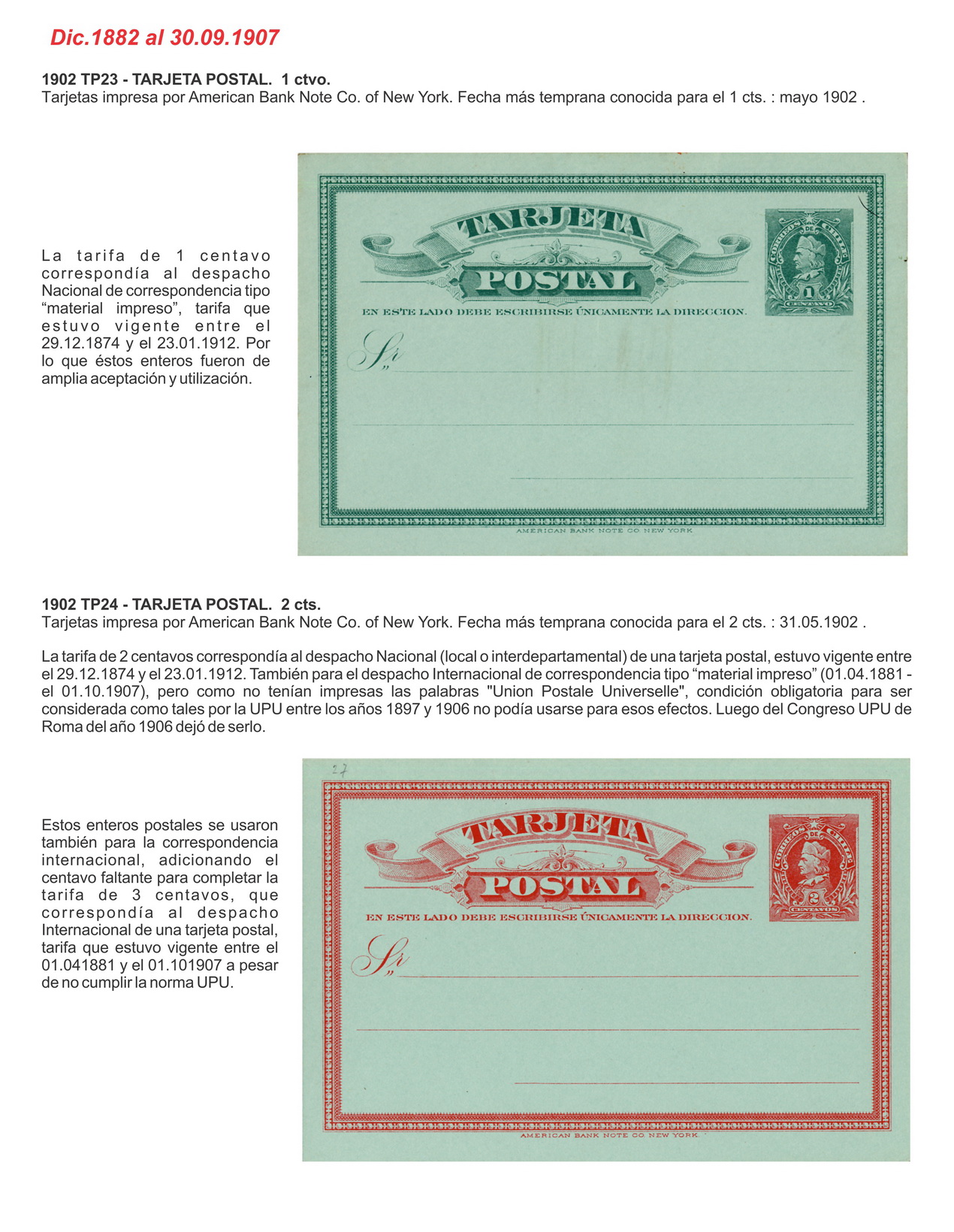 El período escogido abarca desde la aparición en diciembre de 1882 de la primera Tarjeta Entero Postal emitida por la Administración Postal específicamente para cumplir con la tarifa de un centavo, y que dejaba en mano de los particulares la obligación de imprimir en el reverso del mismo el texto y/o los diseños que ellos quisieran, siempre y cuando cumplieran con las exigencias que determinada la legislación postal, hasta el año 1920 en que dejó de ser válida la tarifa de 4 cts. para el despacho de una Tarjeta Entero Postal Internacional tipo “Material Impreso”. La última emisión de Tarjetas Enteros Postales fue en 1915.